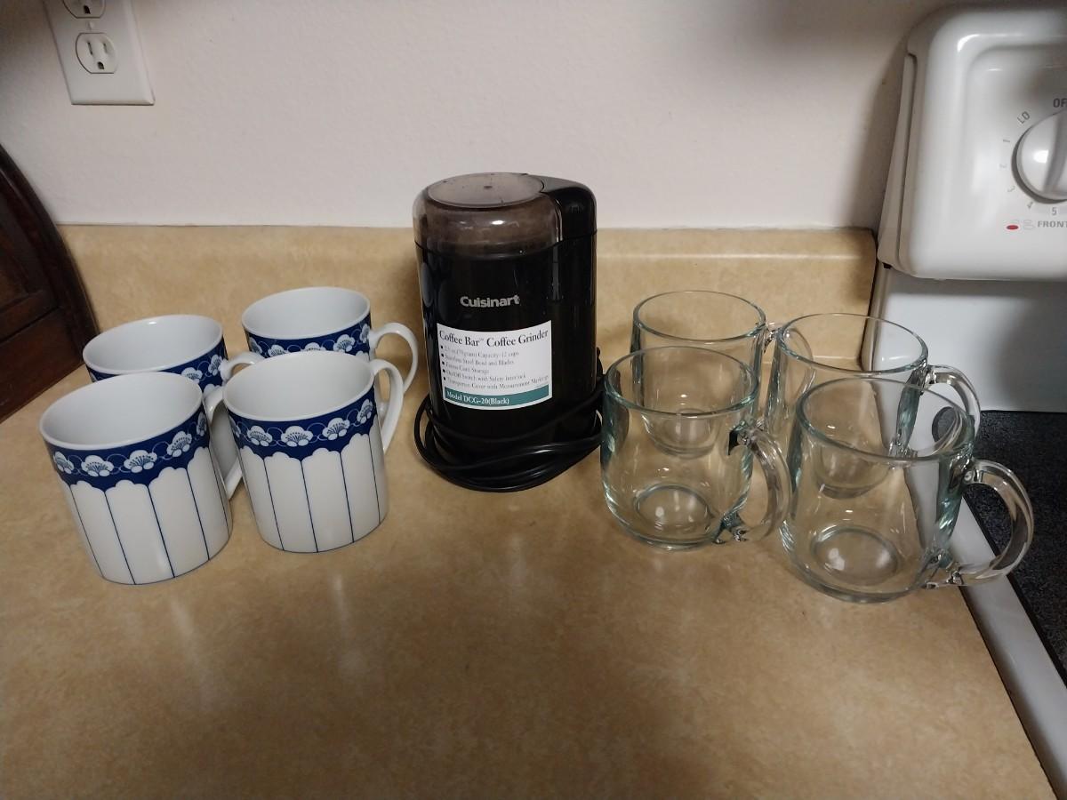 COFFEE BEAN GRINDER AND 2 SETS OF COFFEE CUPS