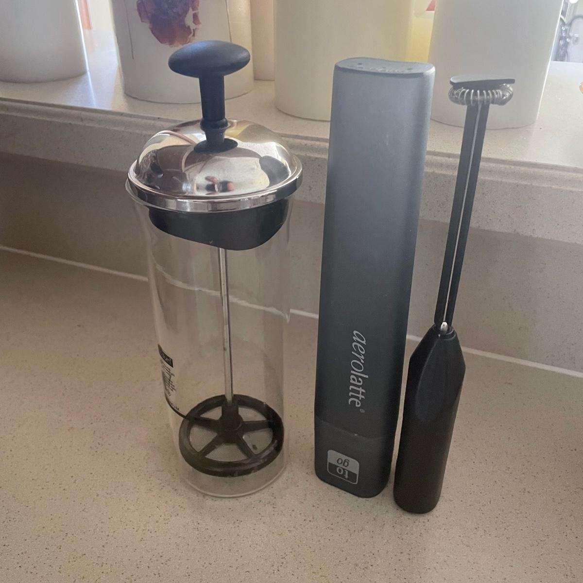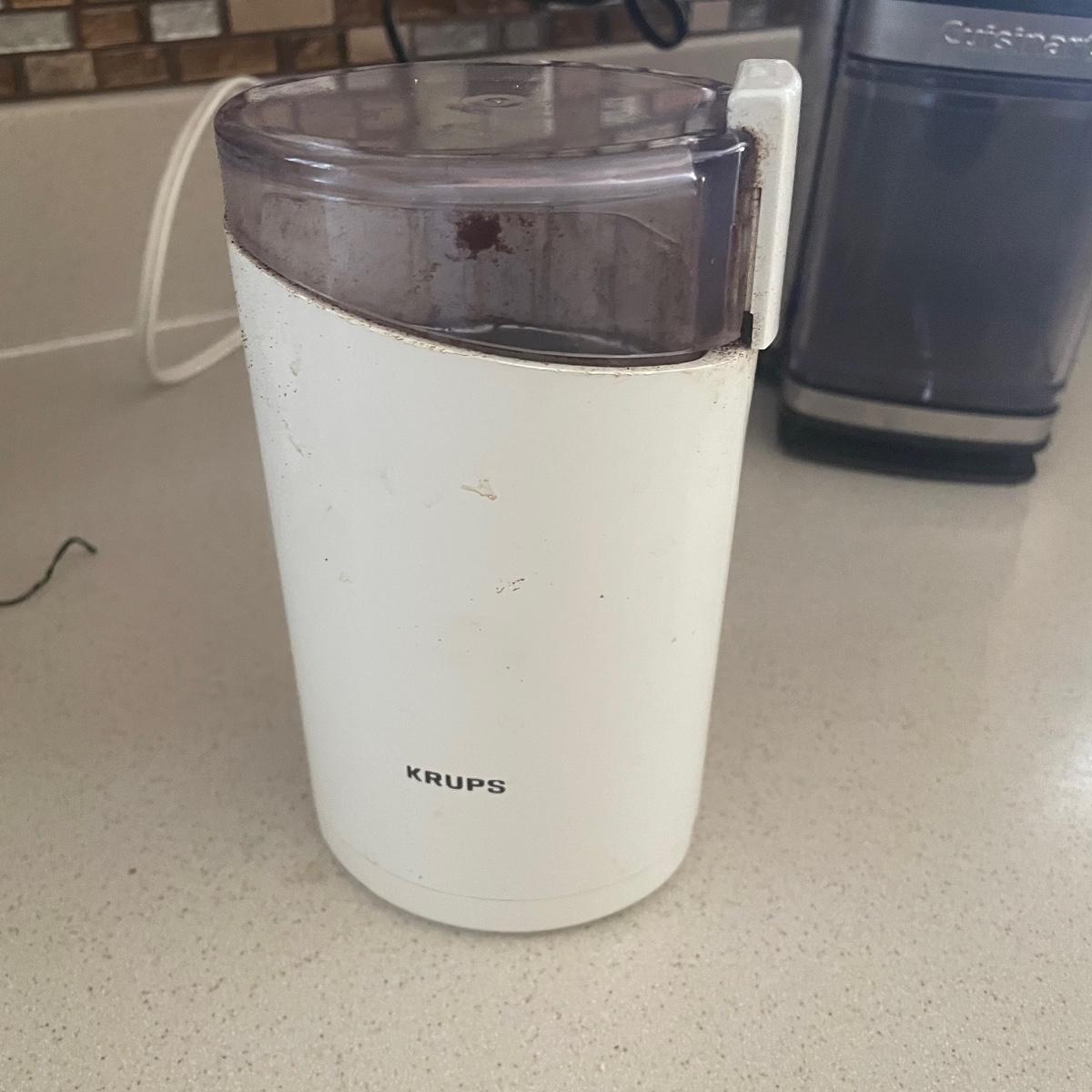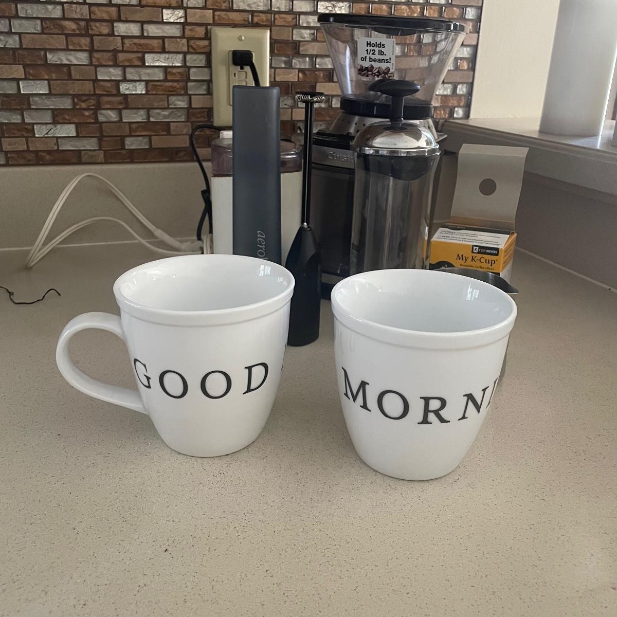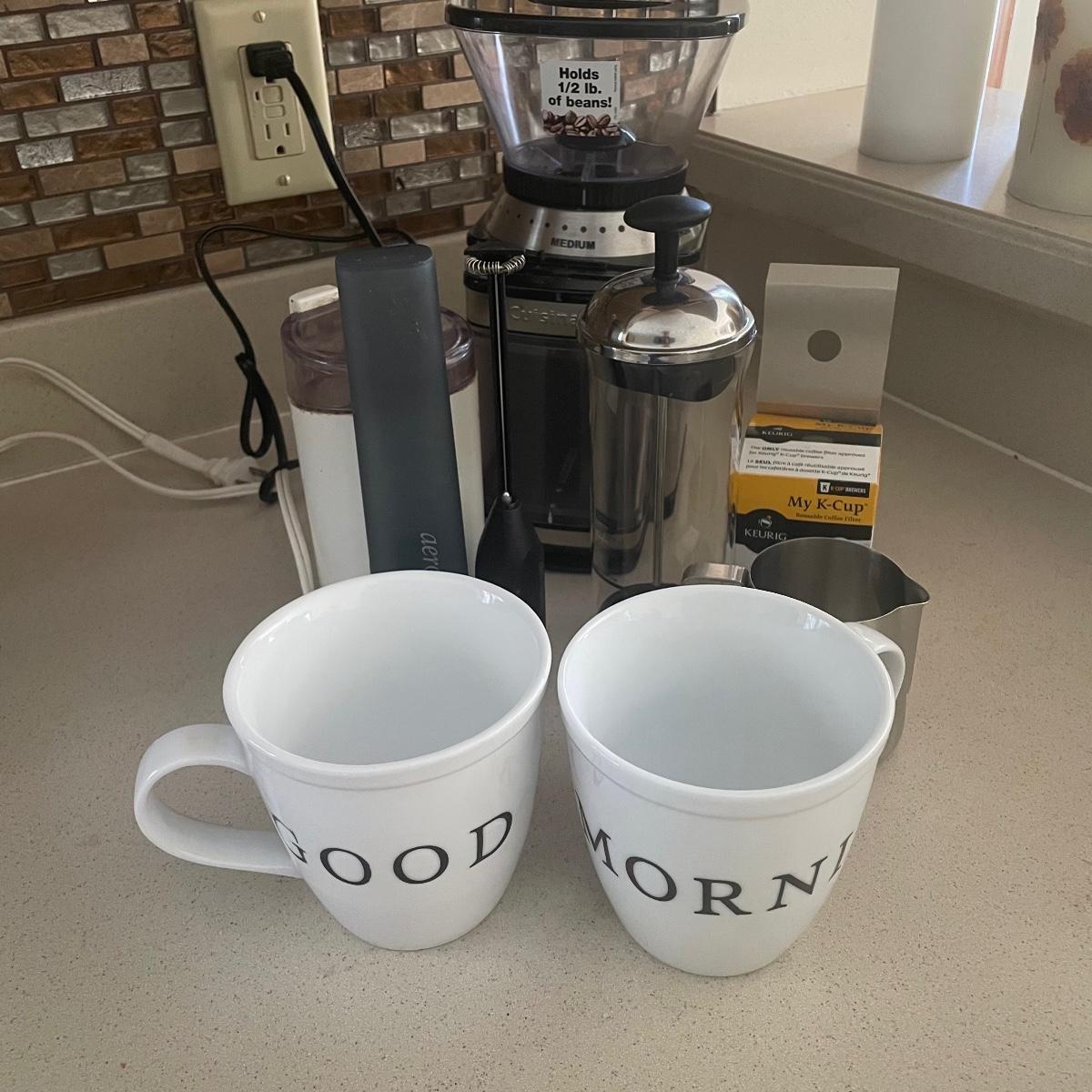 Everything you need for your morning cup of Joe. The Cuisinart and Krups bean grinders and the aerolatte all powered on when tested. This lot also includes a Bodum coffee press, K-Cup, two large Good Morning mugs and three Starbucks mugs that we added later and are not in the cover image.