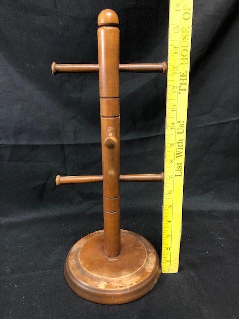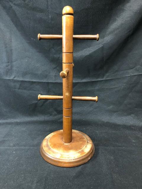 Coffee cup holder. Hang up to 6 cups. Made of wood, has some wear to the finish.