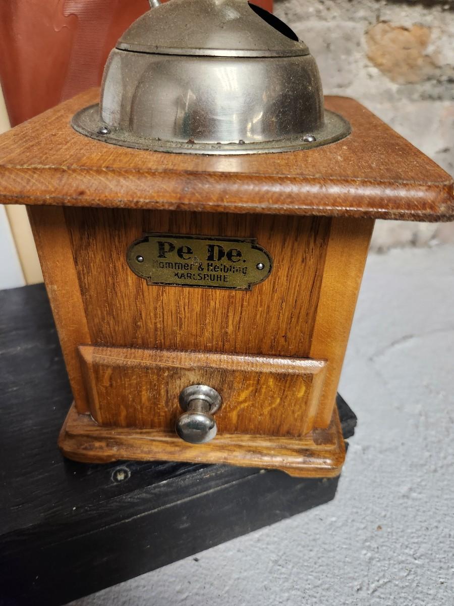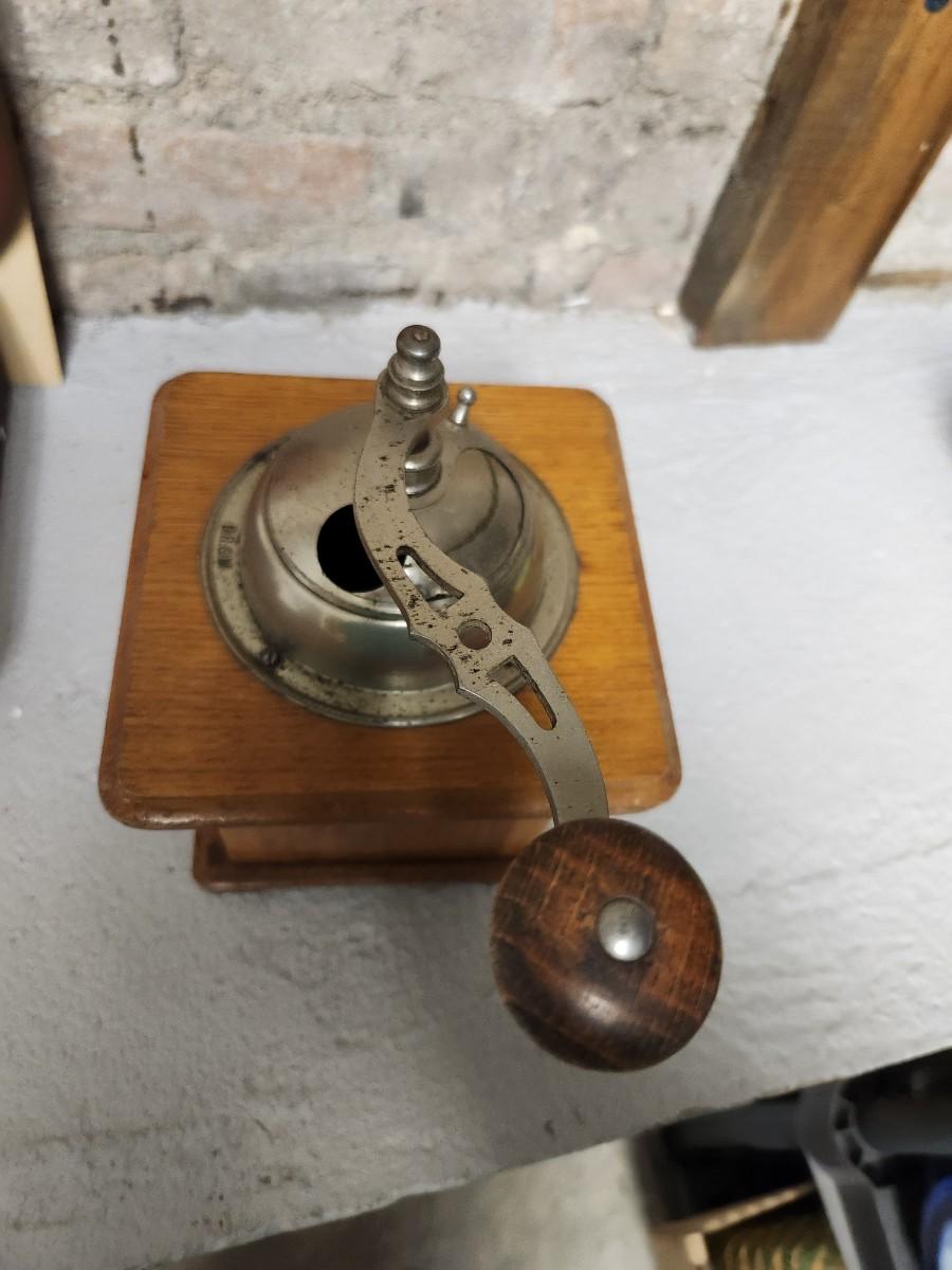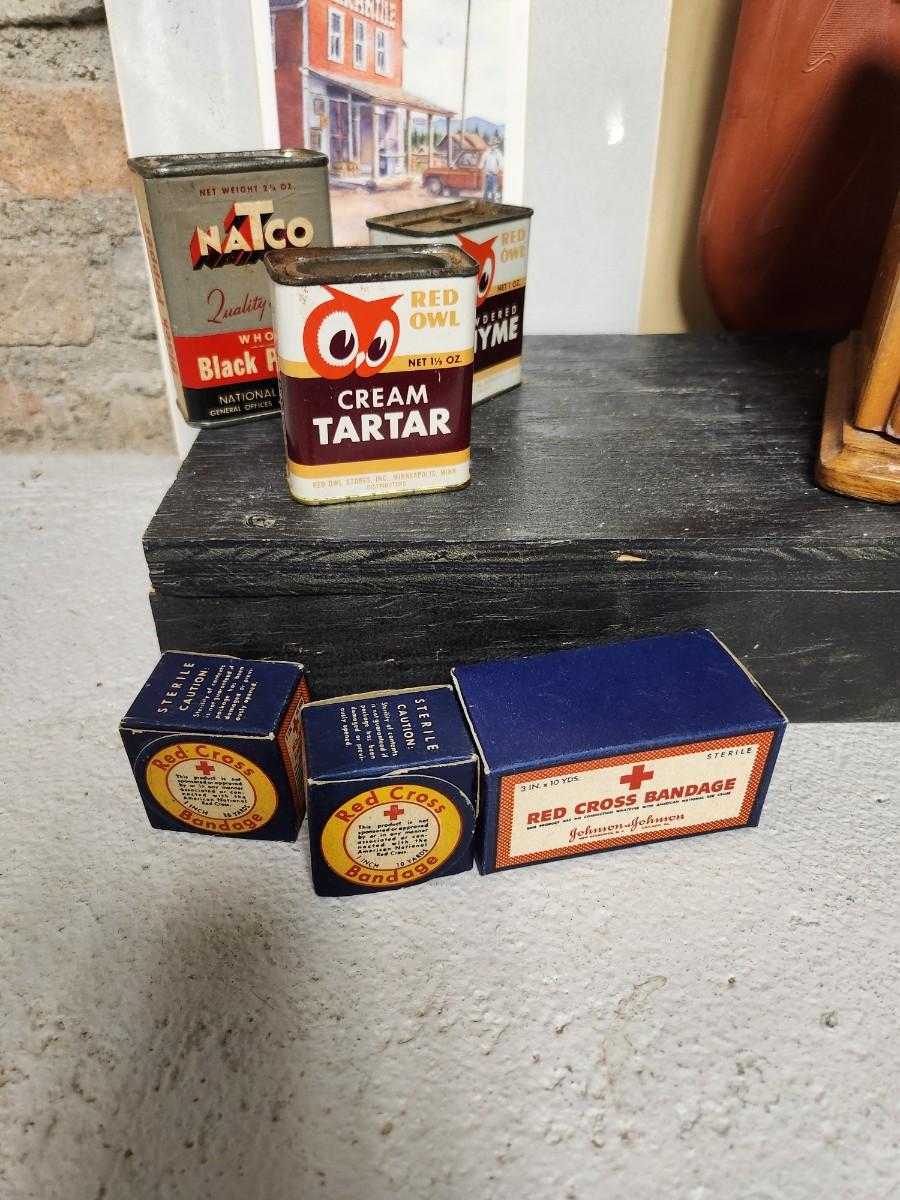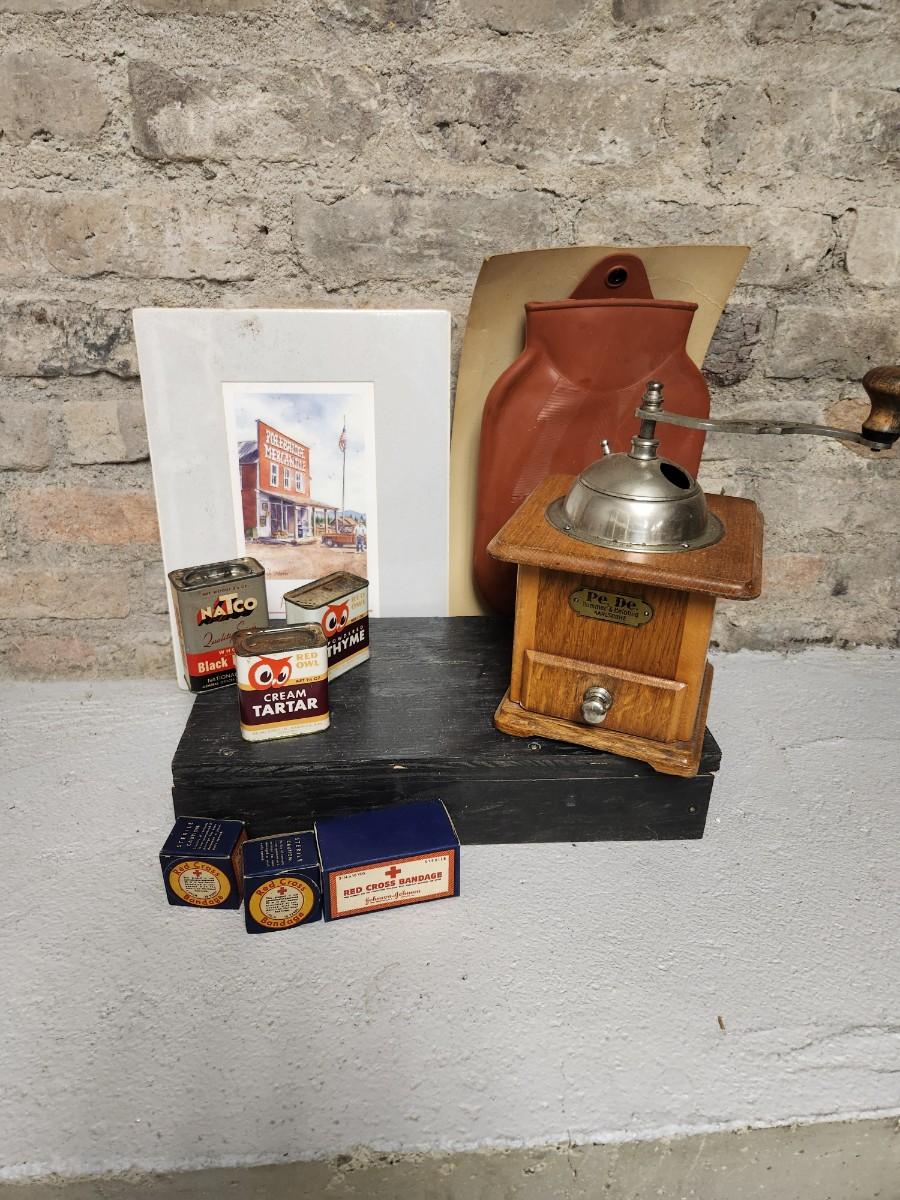 Coffee Grinder, 3 spice tins, old red cross gauze packages, old new ot water bottle