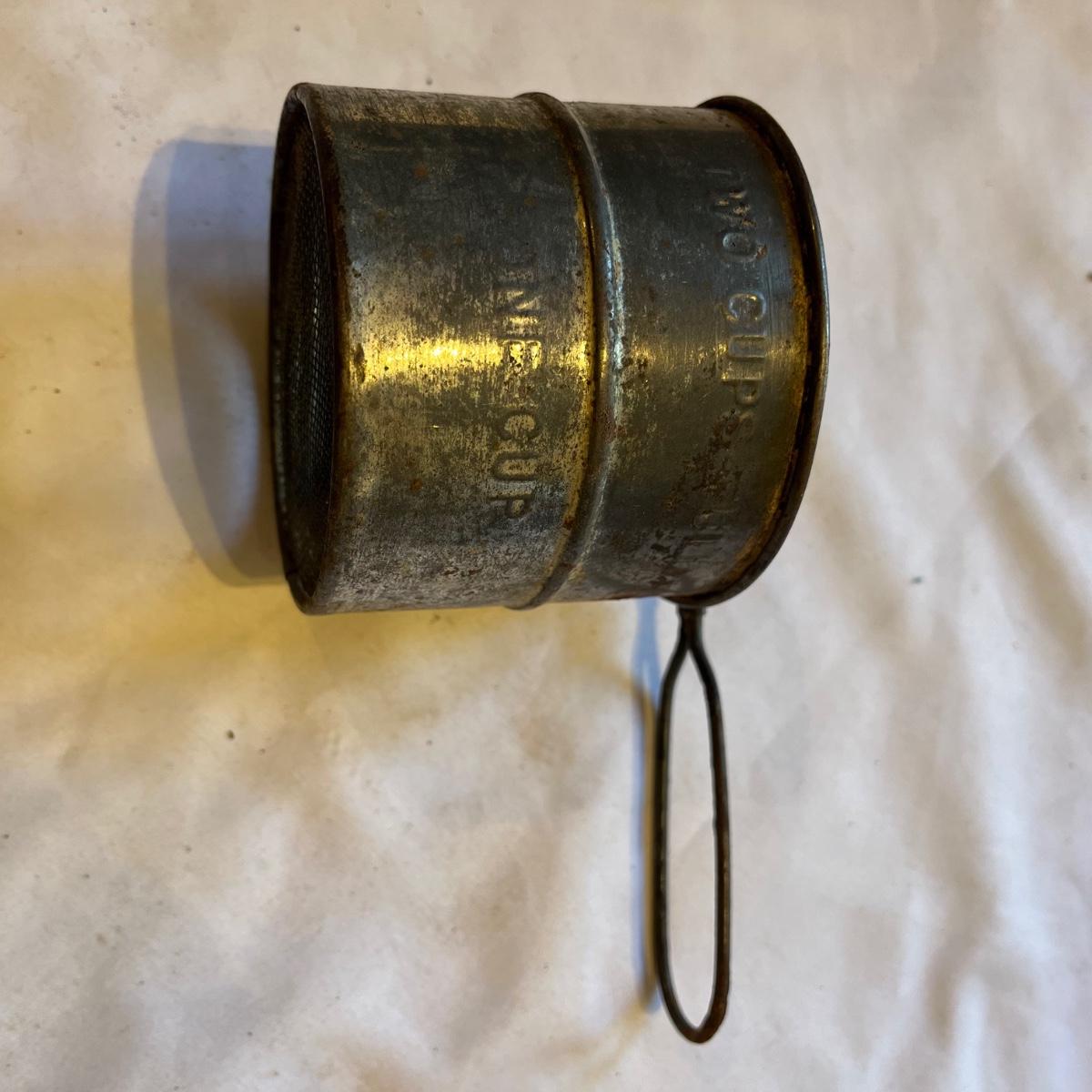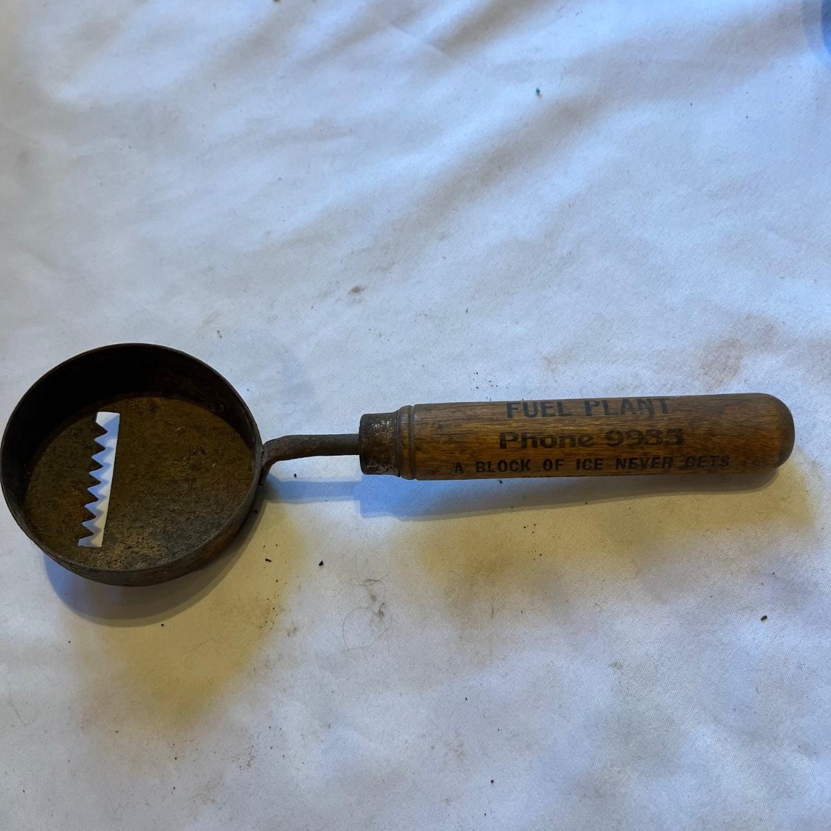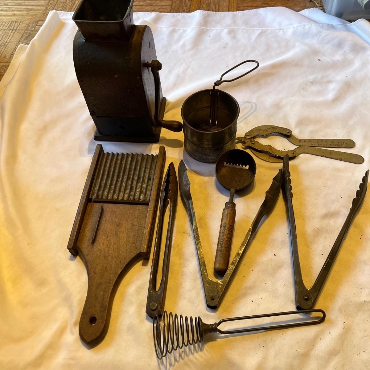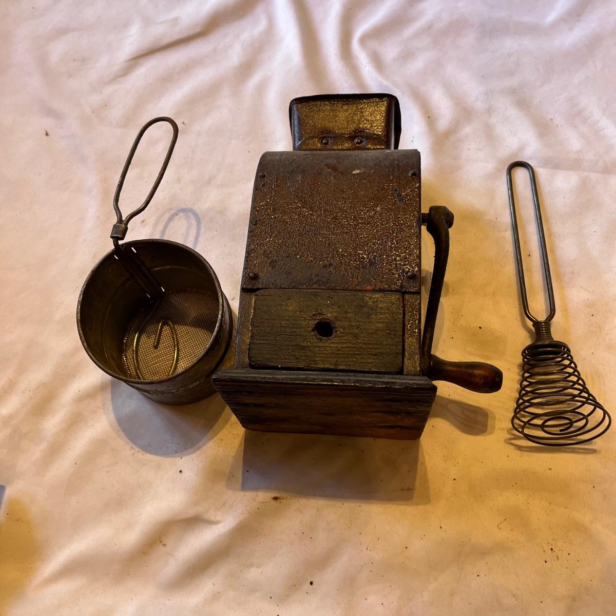 Lot includes a wooden coffee grinder metal flour sifter, metal whisk, three tongs with advertising on side, ice scraper with advertising and a wooden and metal slicer. Grinder measures 4.5” x 4.5” x 8.5” not counting handle.