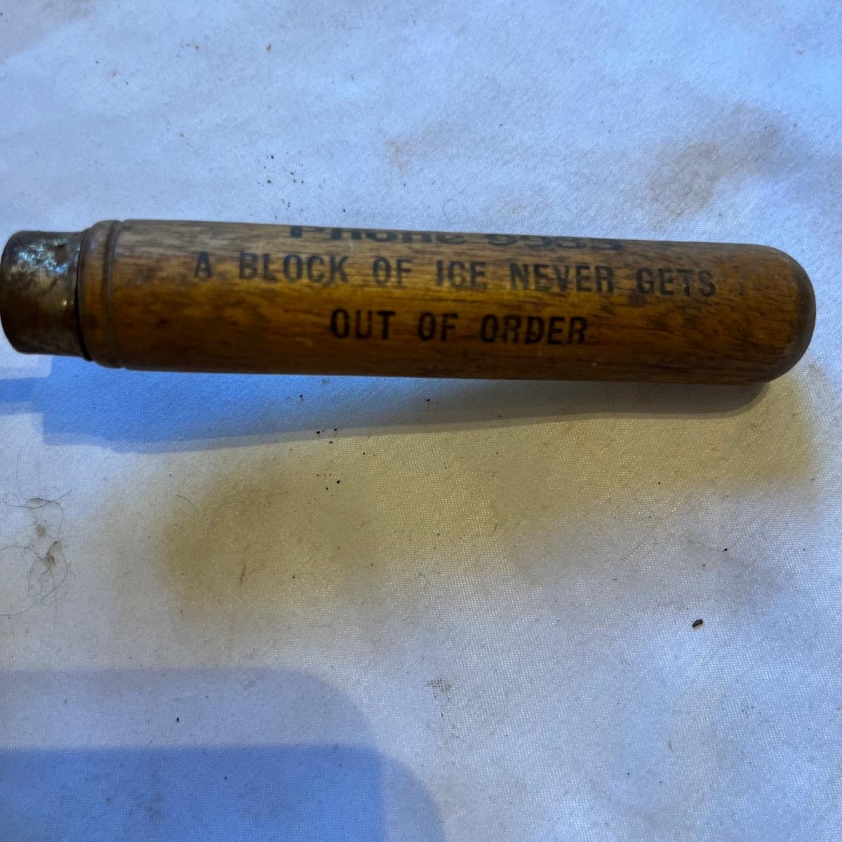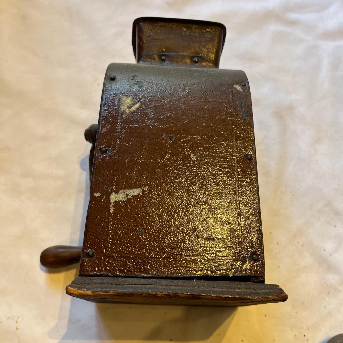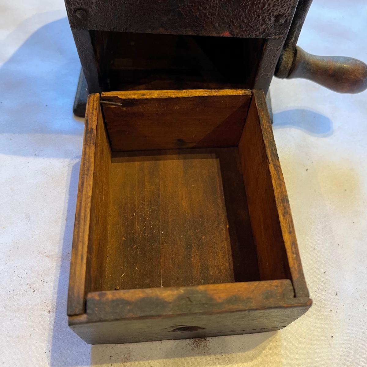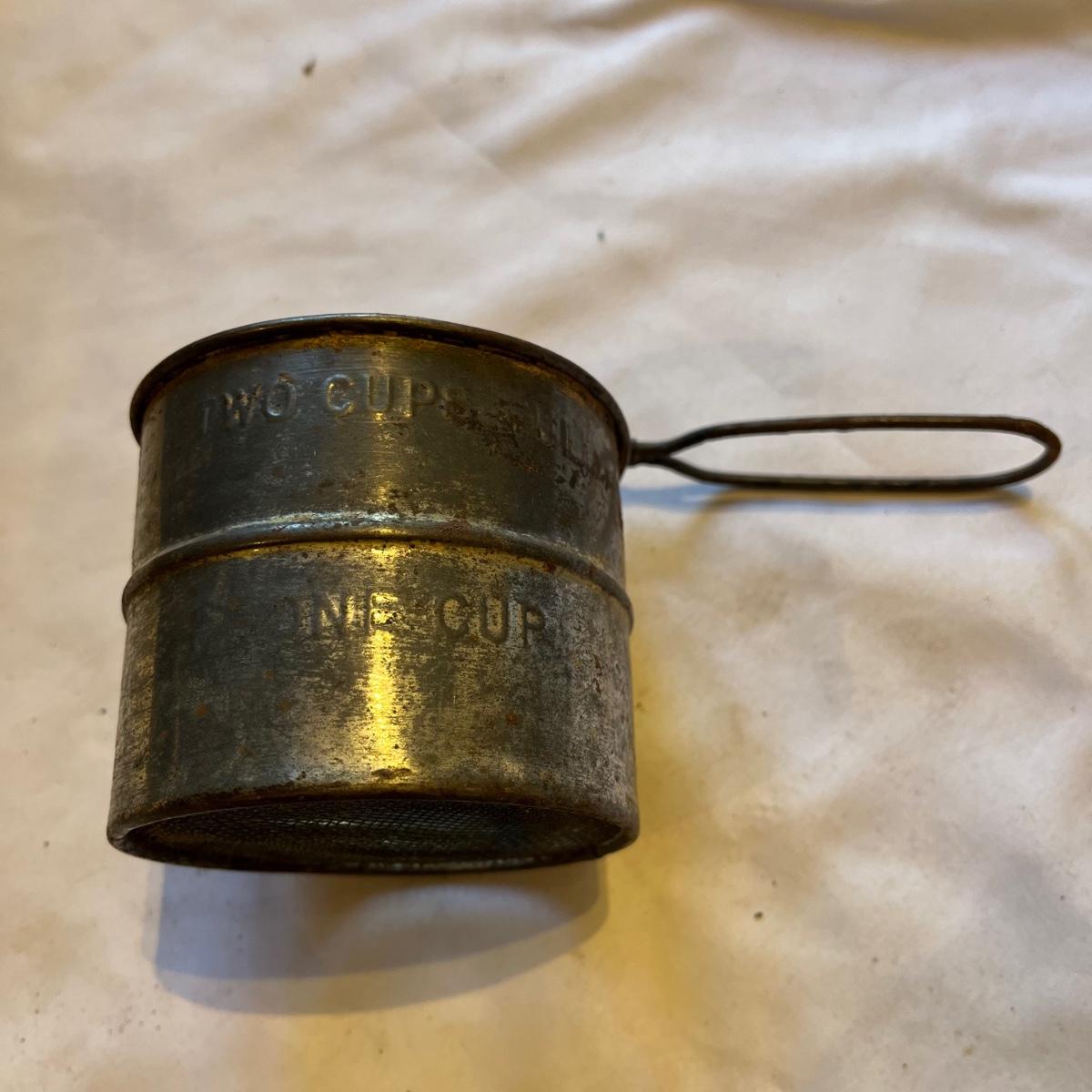 Lot includes a wooden coffee grinder metal flour sifter, metal whisk, three tongs with advertising on side, ice scraper with advertising and a wooden and metal slicer. Grinder measures 4.5” x 4.5” x 8.5” not counting handle.