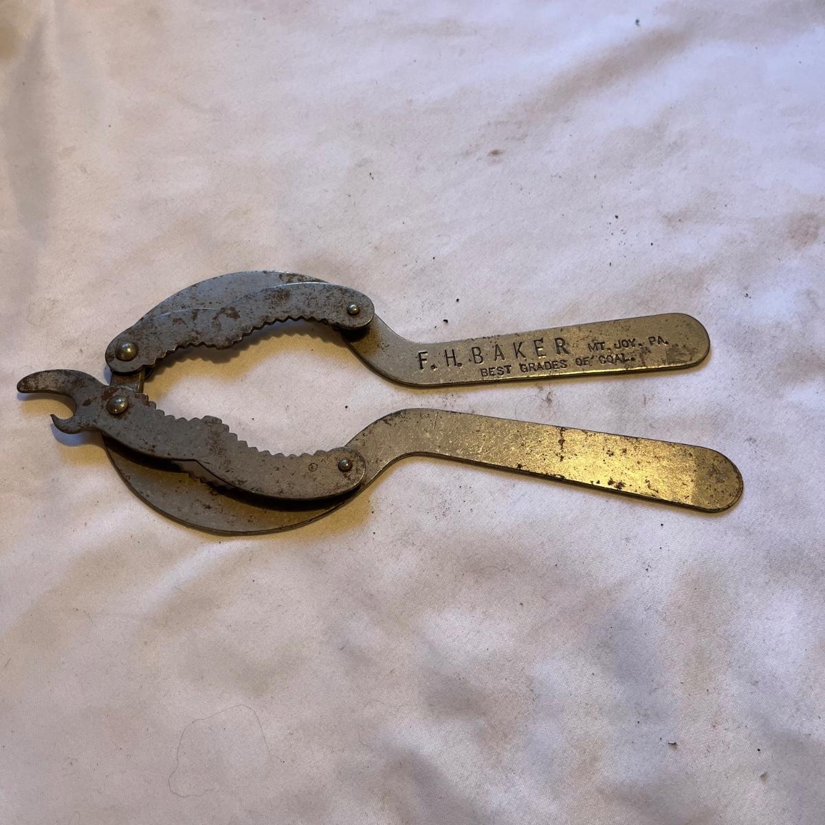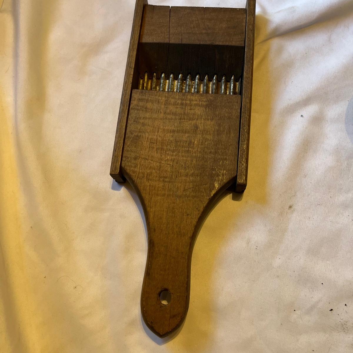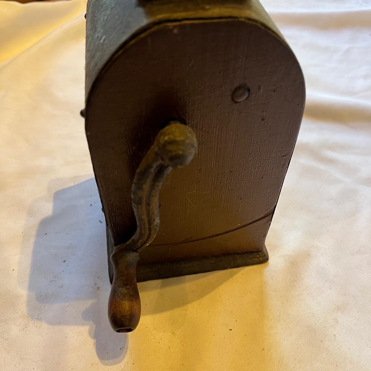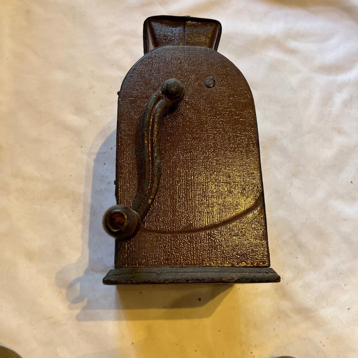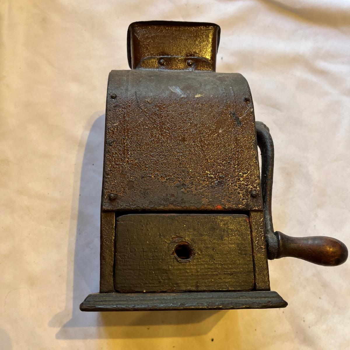 Lot includes a wooden coffee grinder metal flour sifter, metal whisk, three tongs with advertising on side, ice scraper with advertising and a wooden and metal slicer. Grinder measures 4.5” x 4.5” x 8.5” not counting handle.