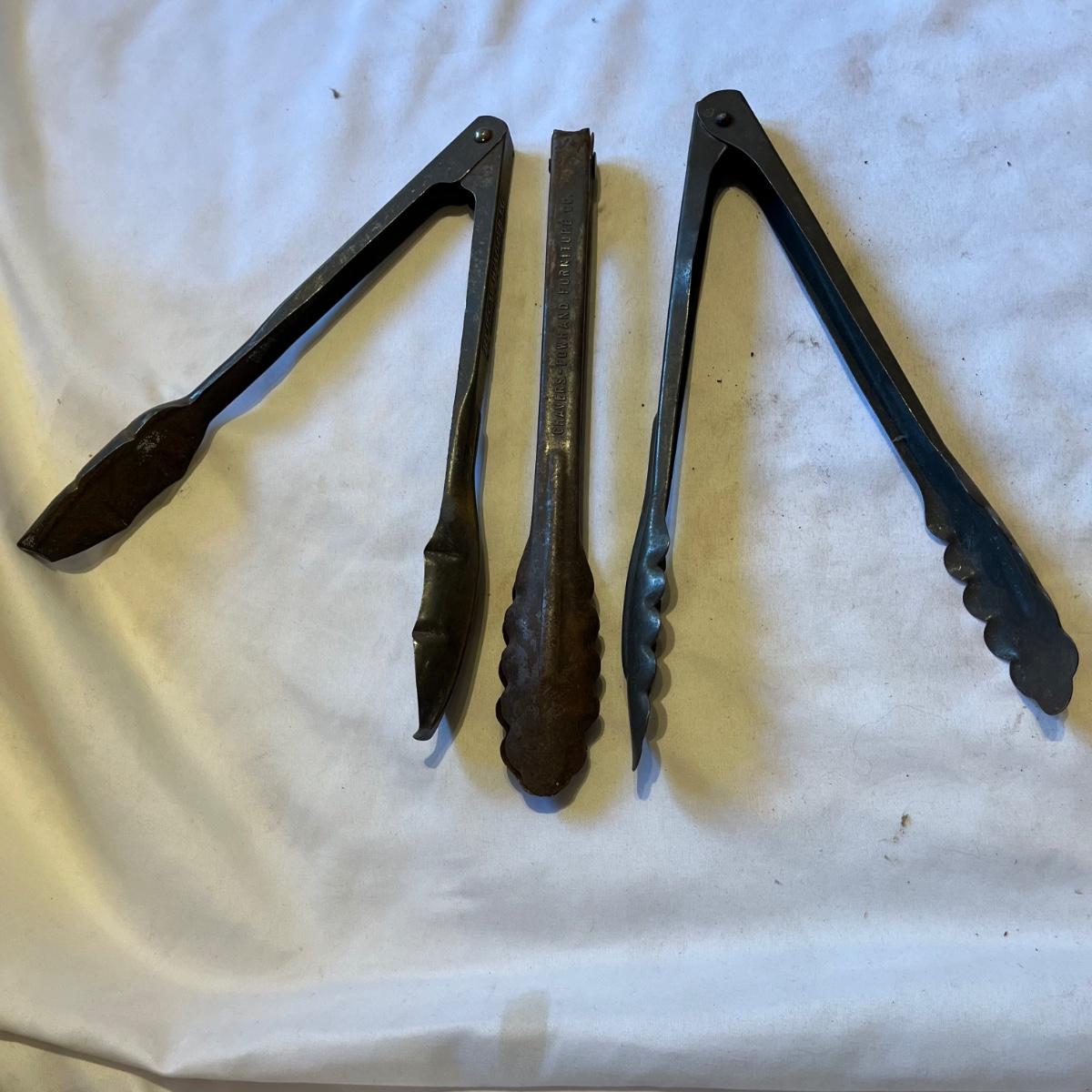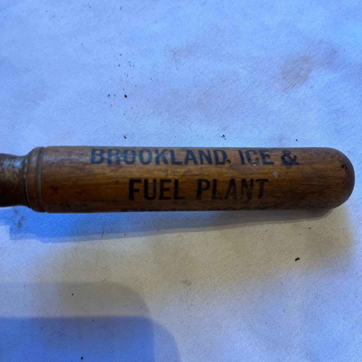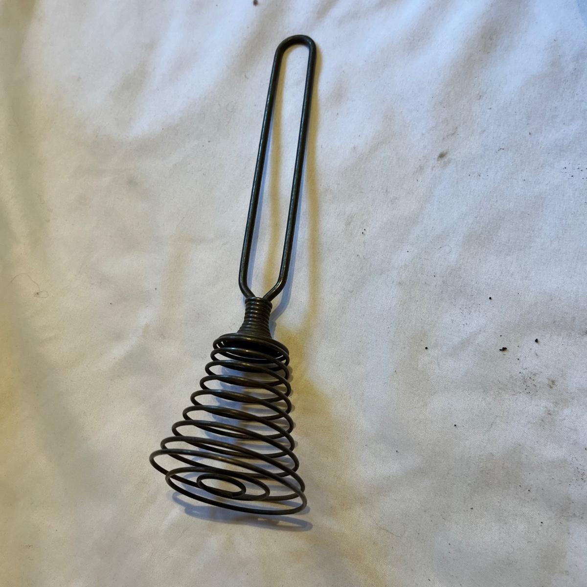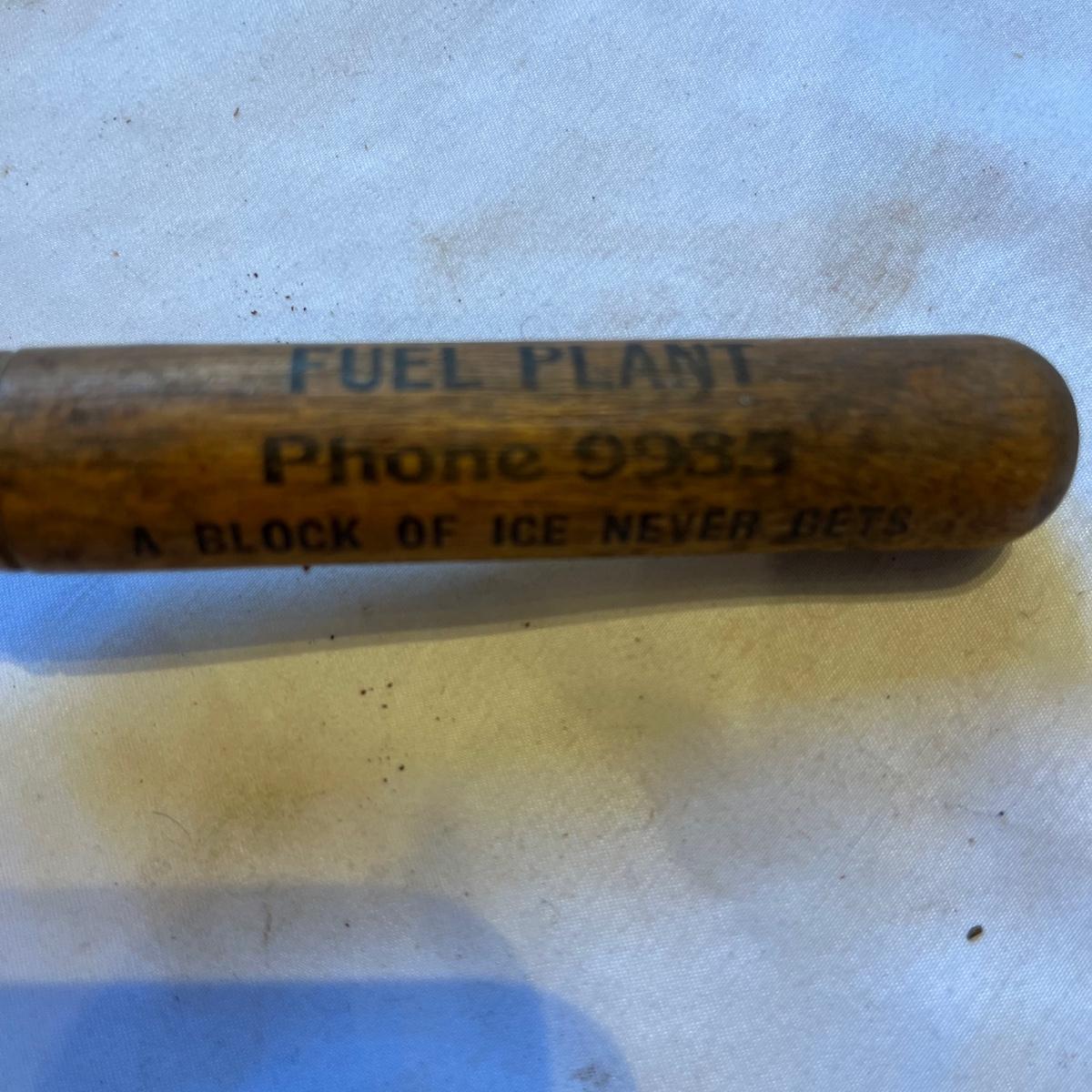 Lot includes a wooden coffee grinder metal flour sifter, metal whisk, three tongs with advertising on side, ice scraper with advertising and a wooden and metal slicer. Grinder measures 4.5” x 4.5” x 8.5” not counting handle.