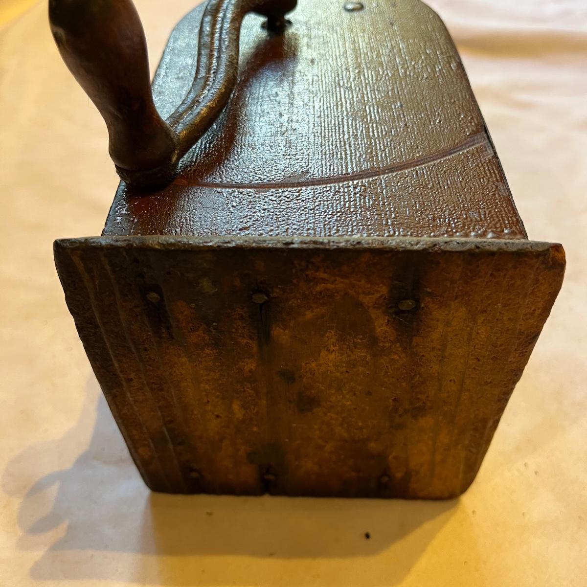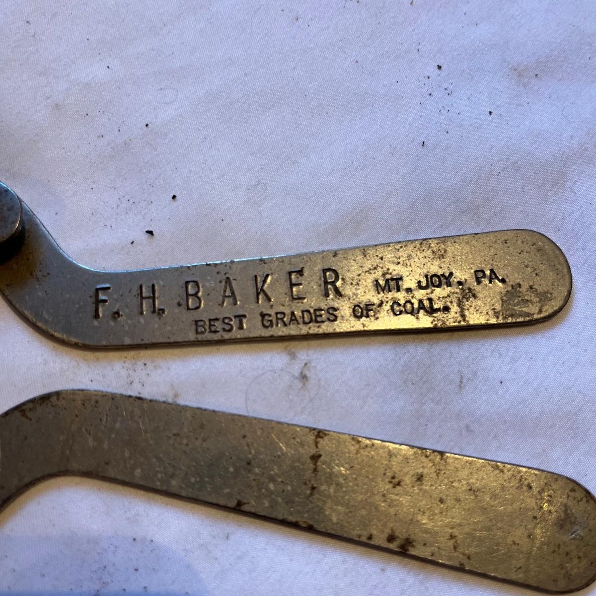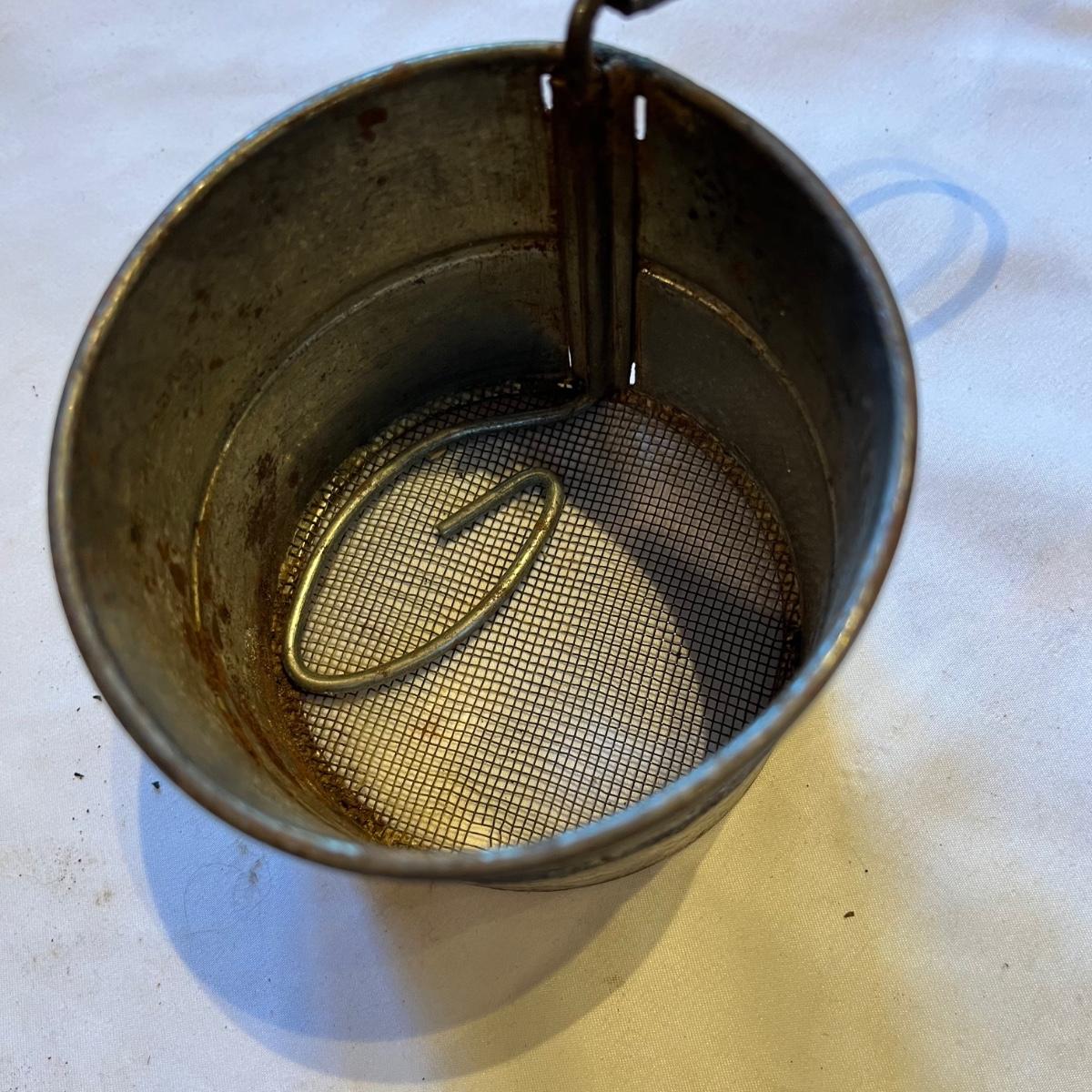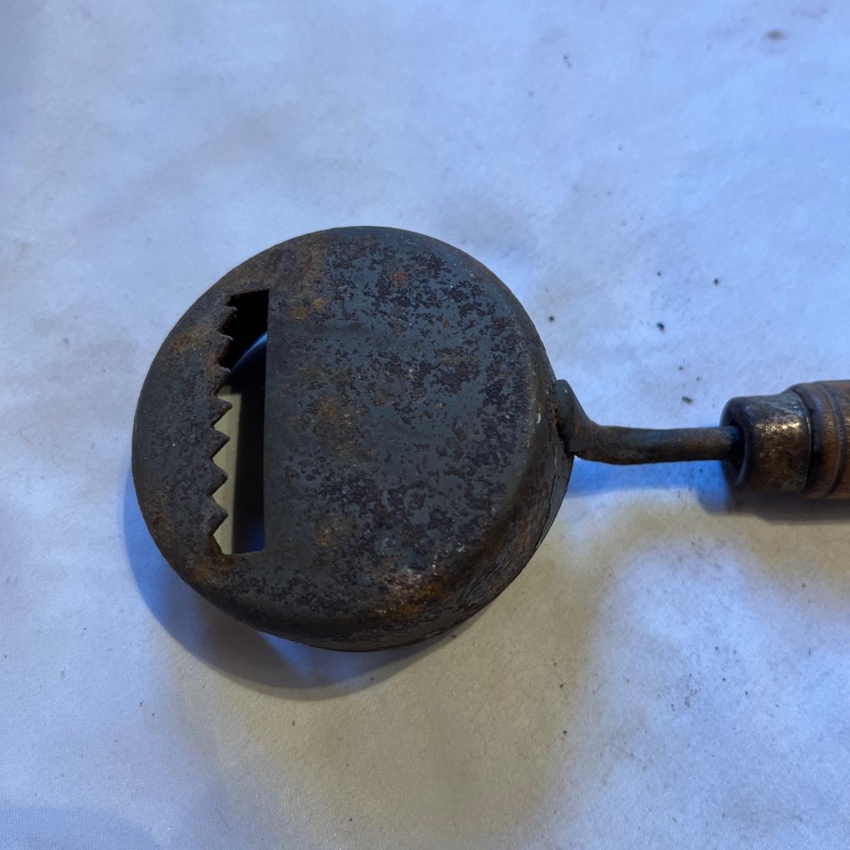 Lot includes a wooden coffee grinder metal flour sifter, metal whisk, three tongs with advertising on side, ice scraper with advertising and a wooden and metal slicer. Grinder measures 4.5” x 4.5” x 8.5” not counting handle.