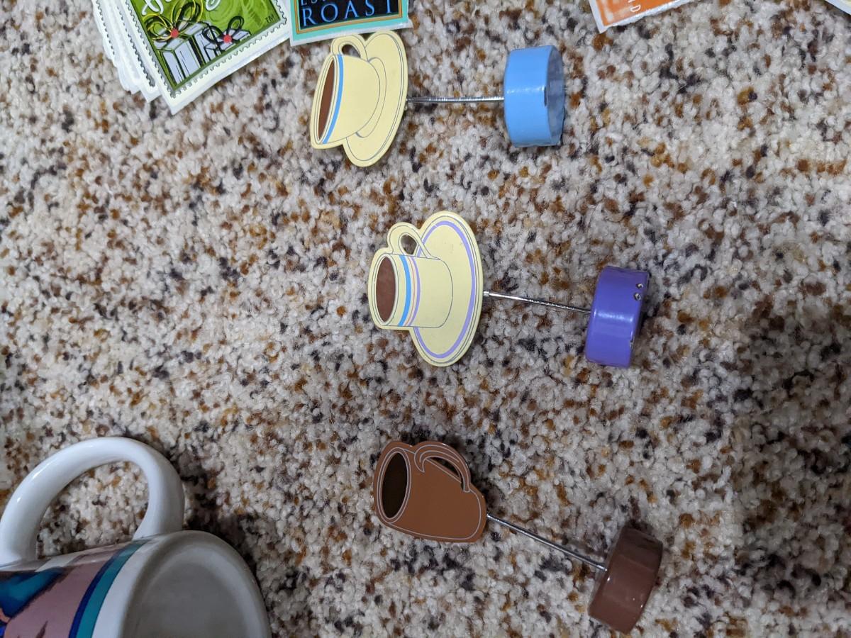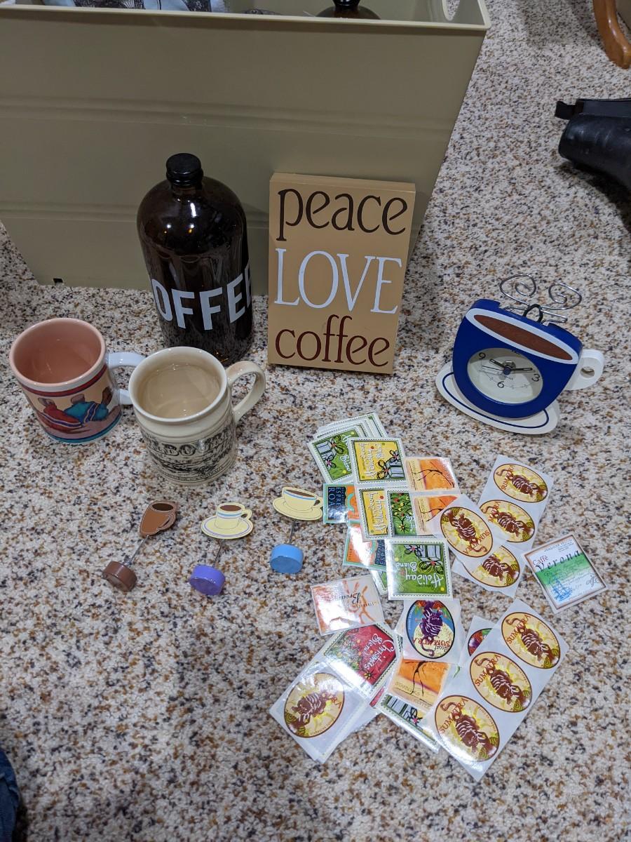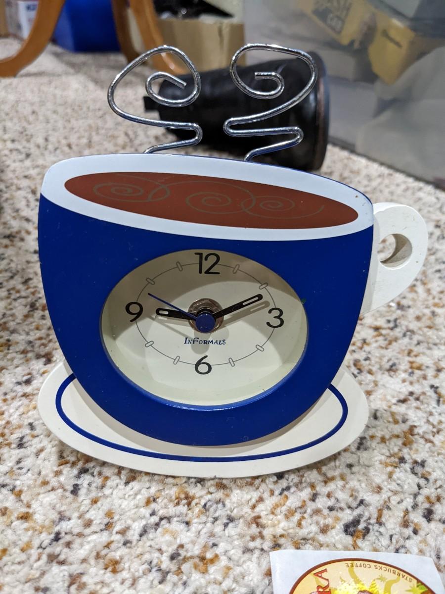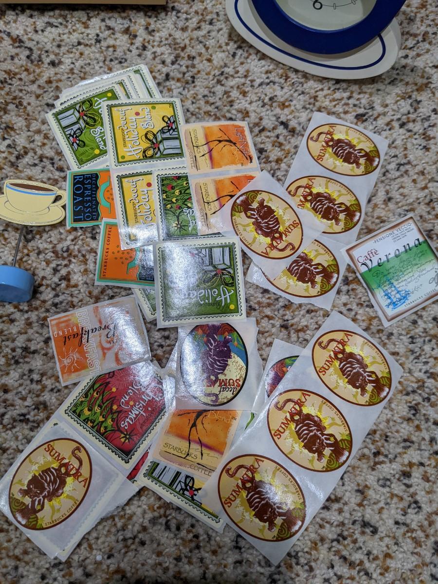 Unused Starbucks bag sticker lot, working clock, bottle, sign, 2 mugs and display clips