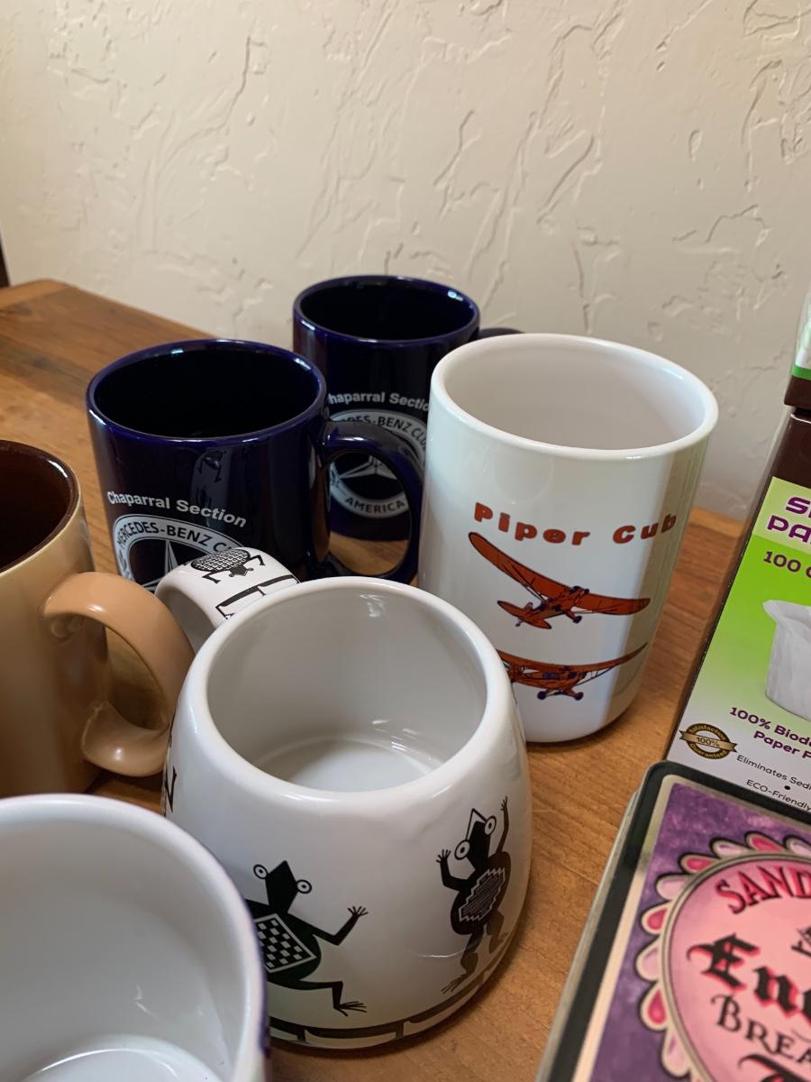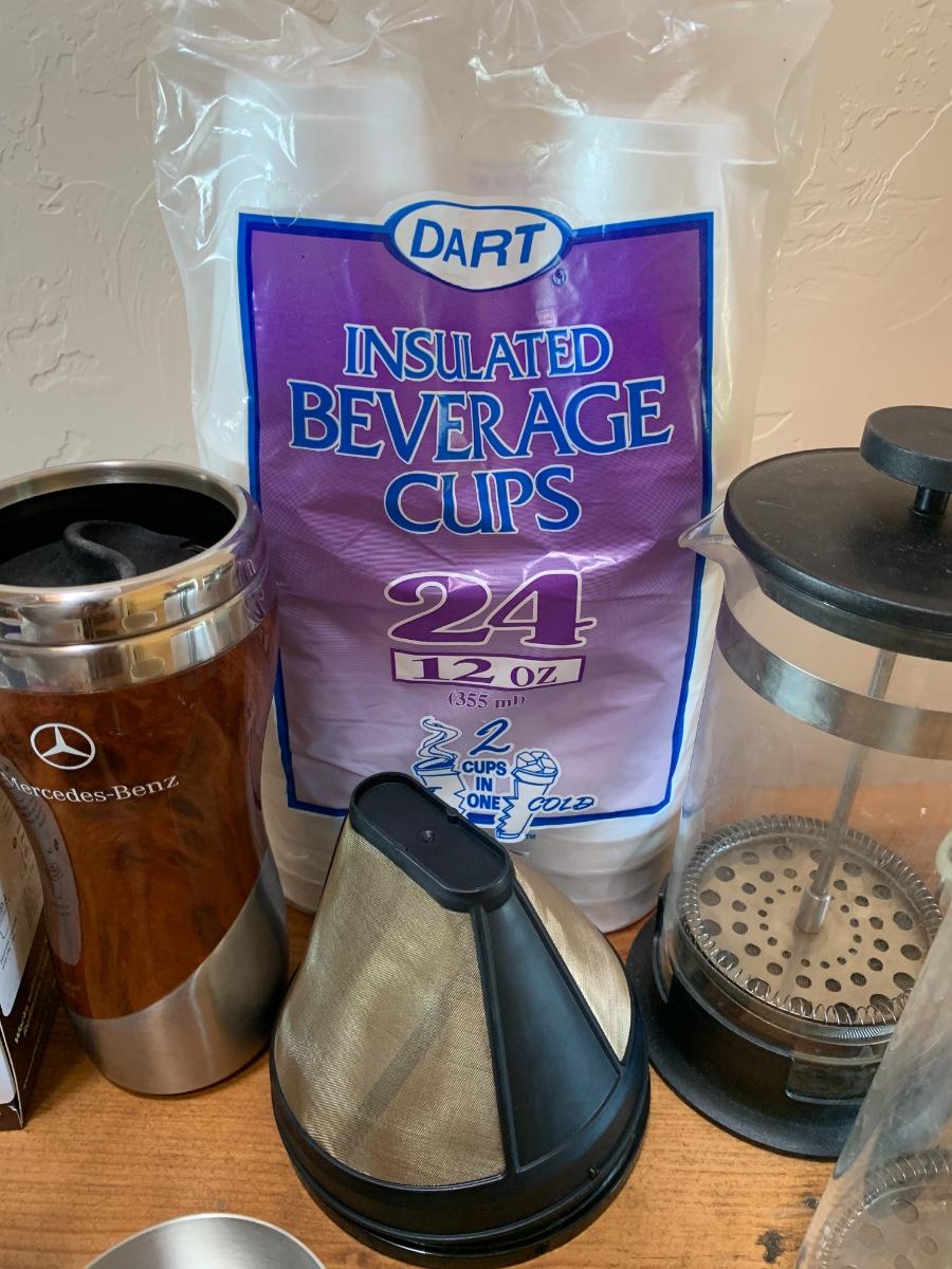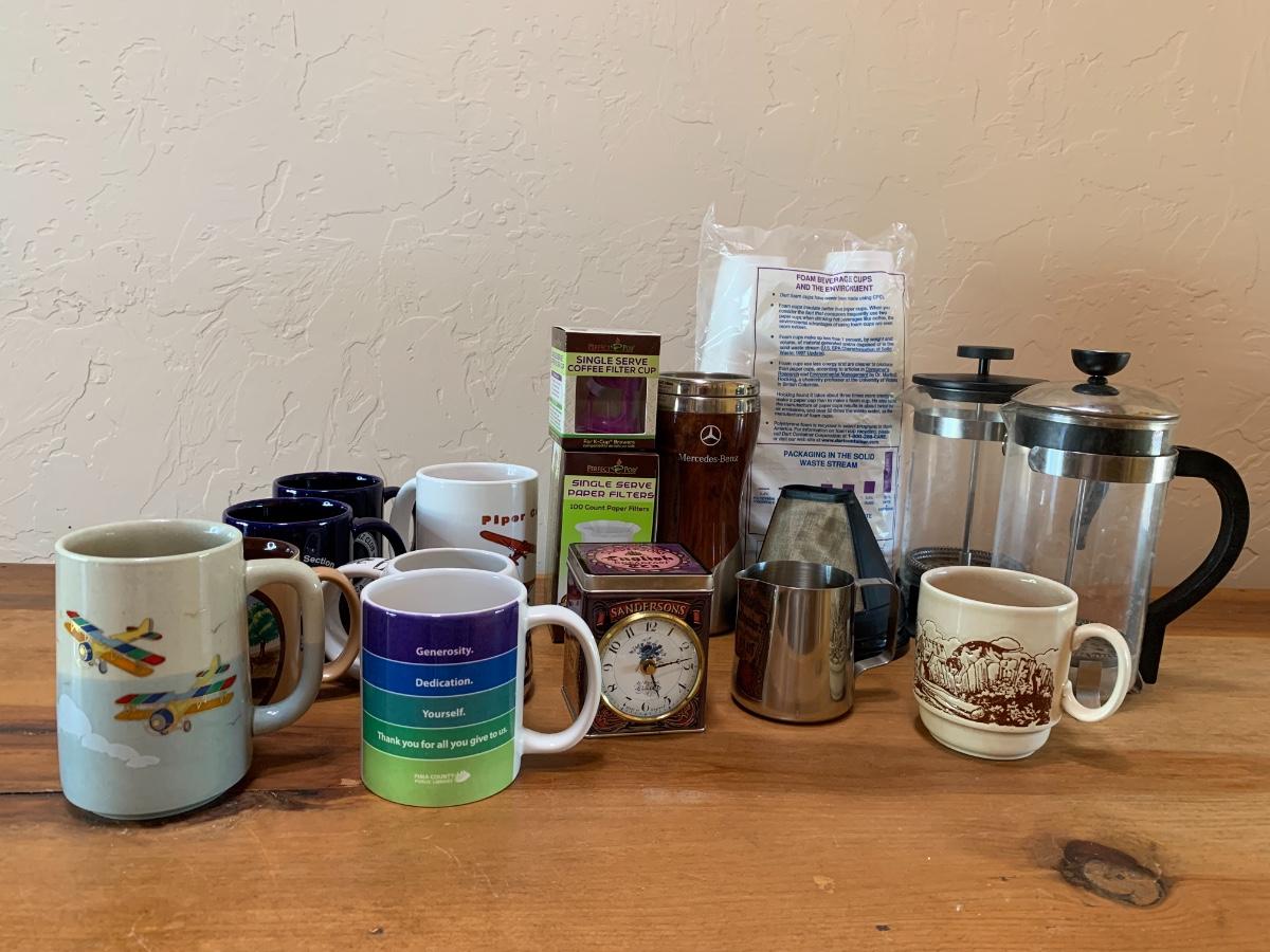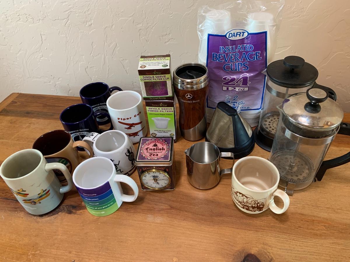 2 French presses, one bag of styrofoam cups, 8 misc mugs, 1 Mercedes thermos, coffee filter cups
