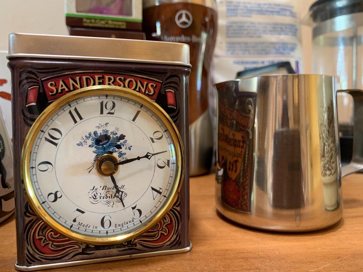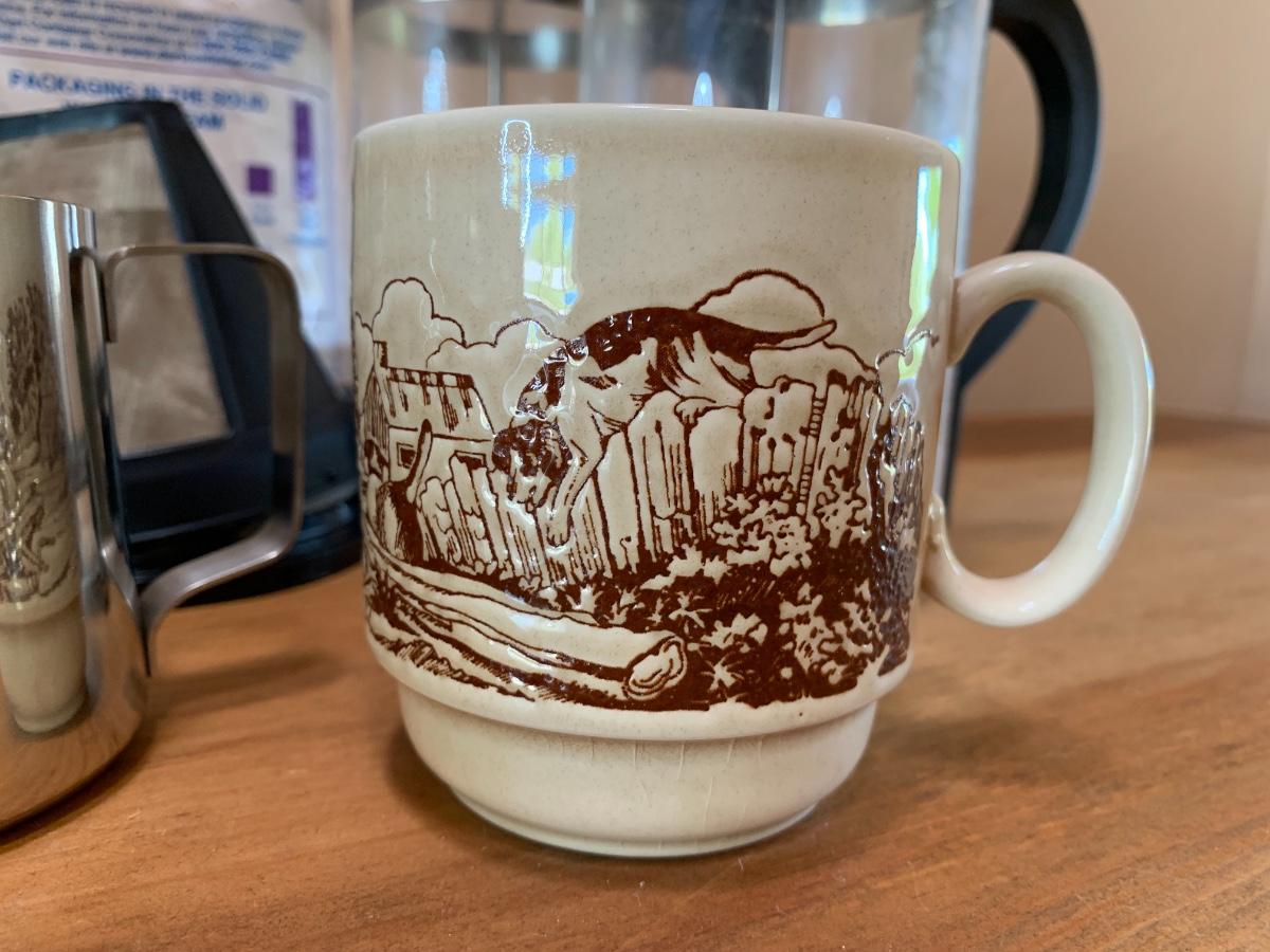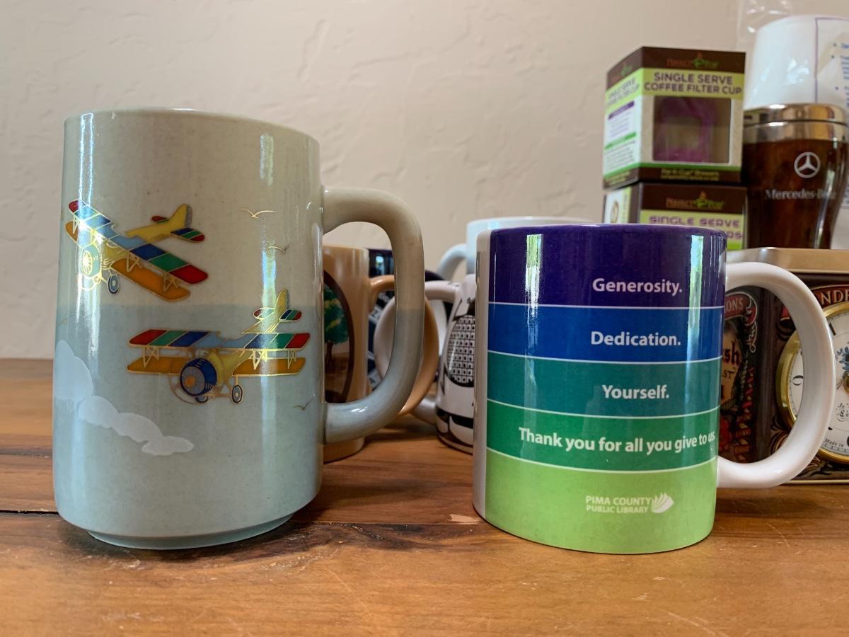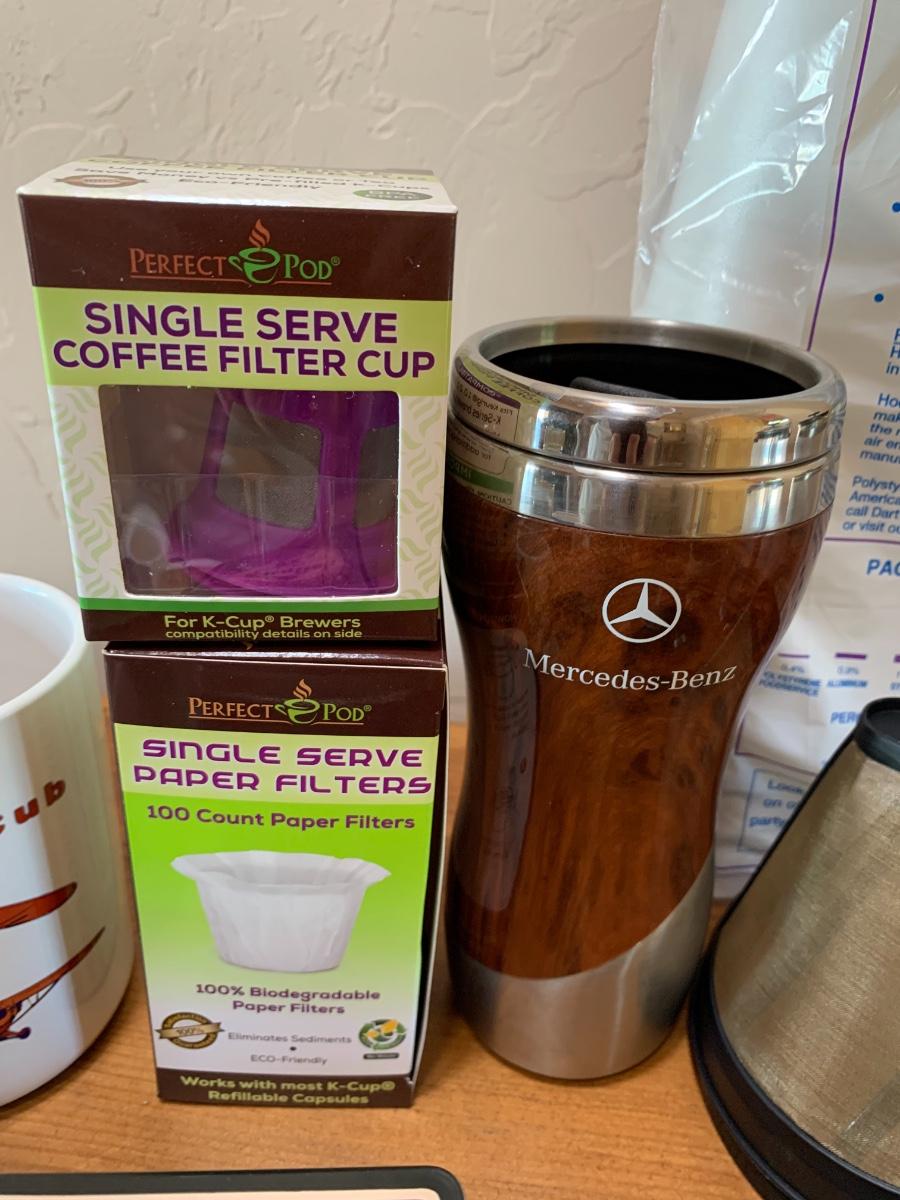 2 French presses, one bag of styrofoam cups, 8 misc mugs, 1 Mercedes thermos, coffee filter cups