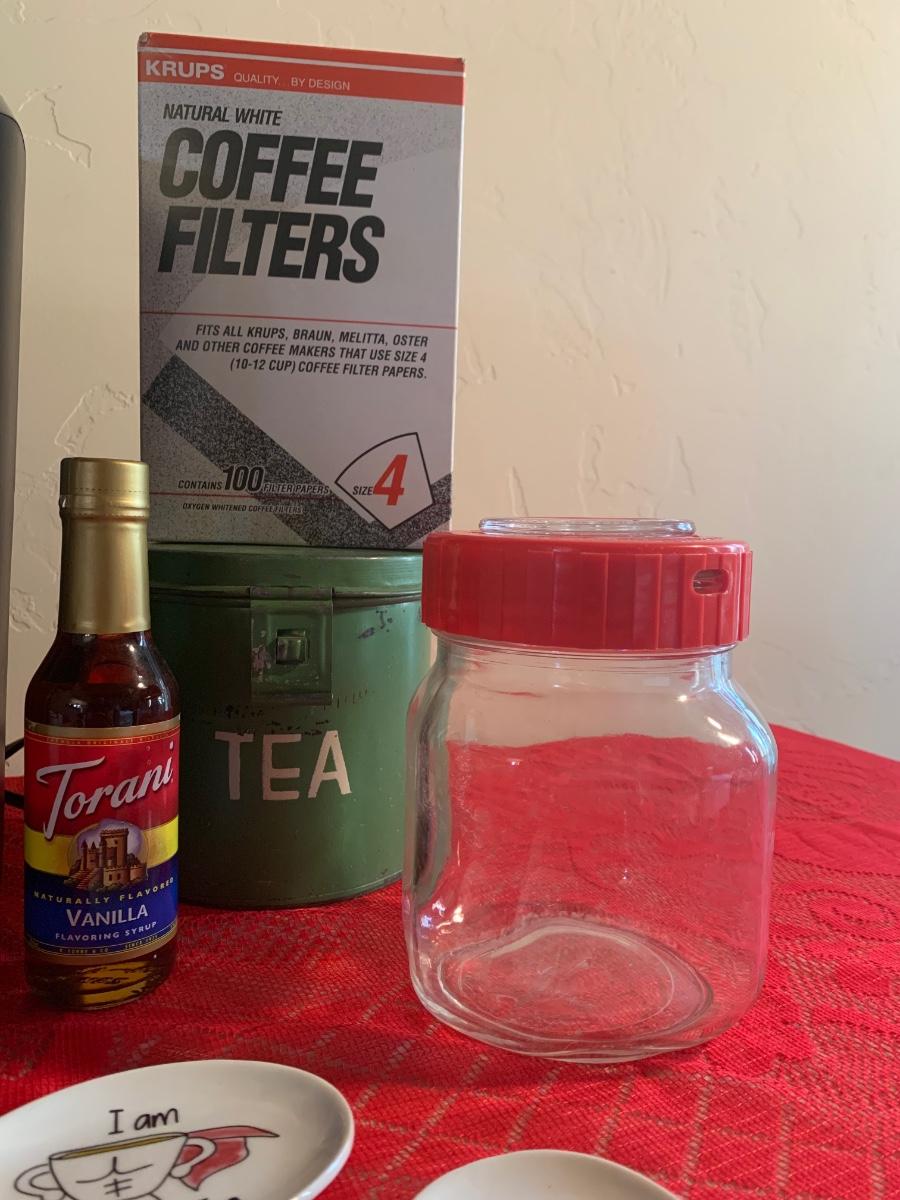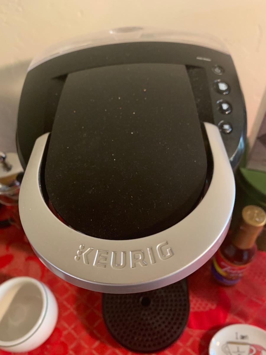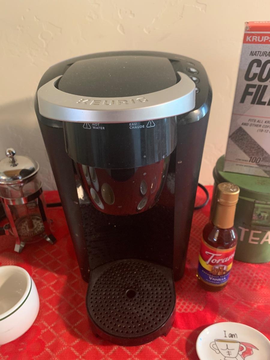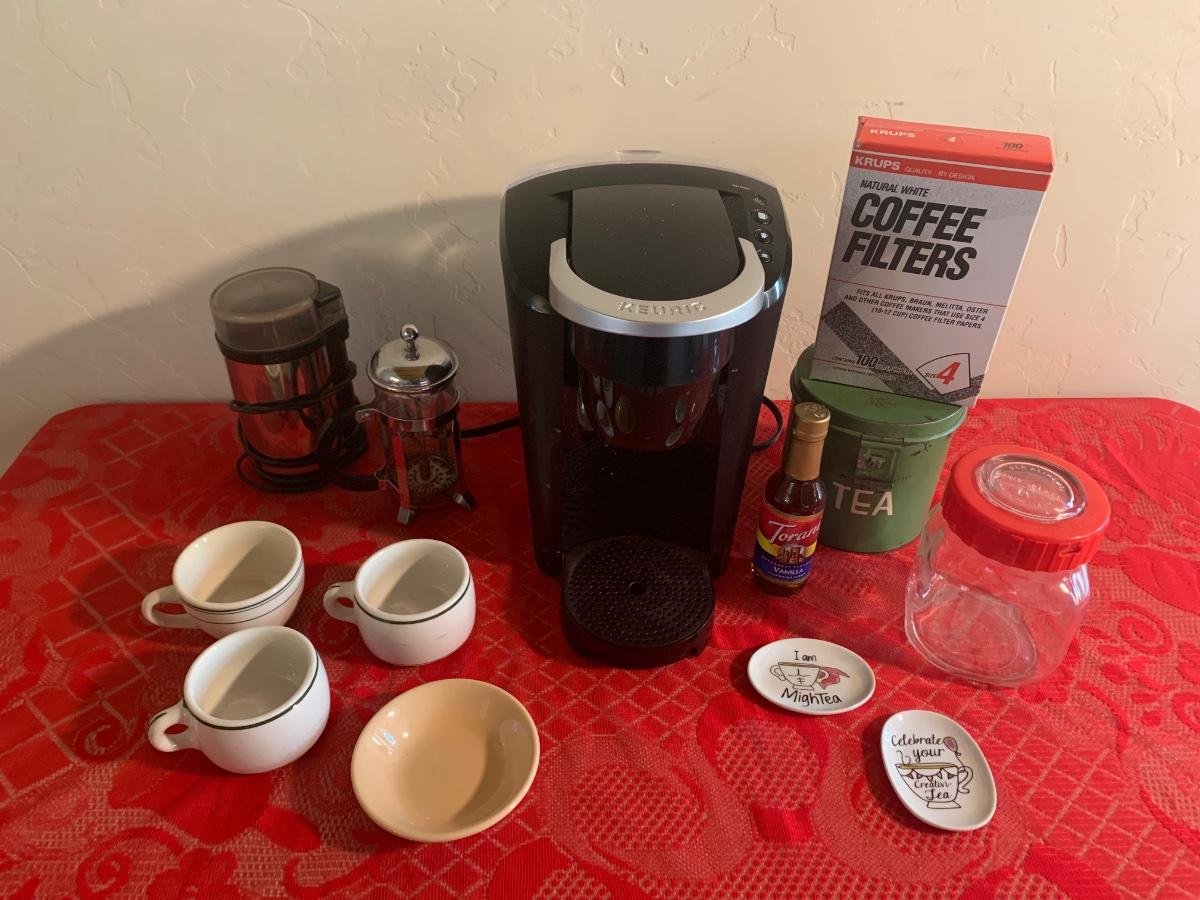 Lot includes a Keurig coffee maker, a bean grinder, French press, filters, flavored syrups, vintage McNicol mugs and more!