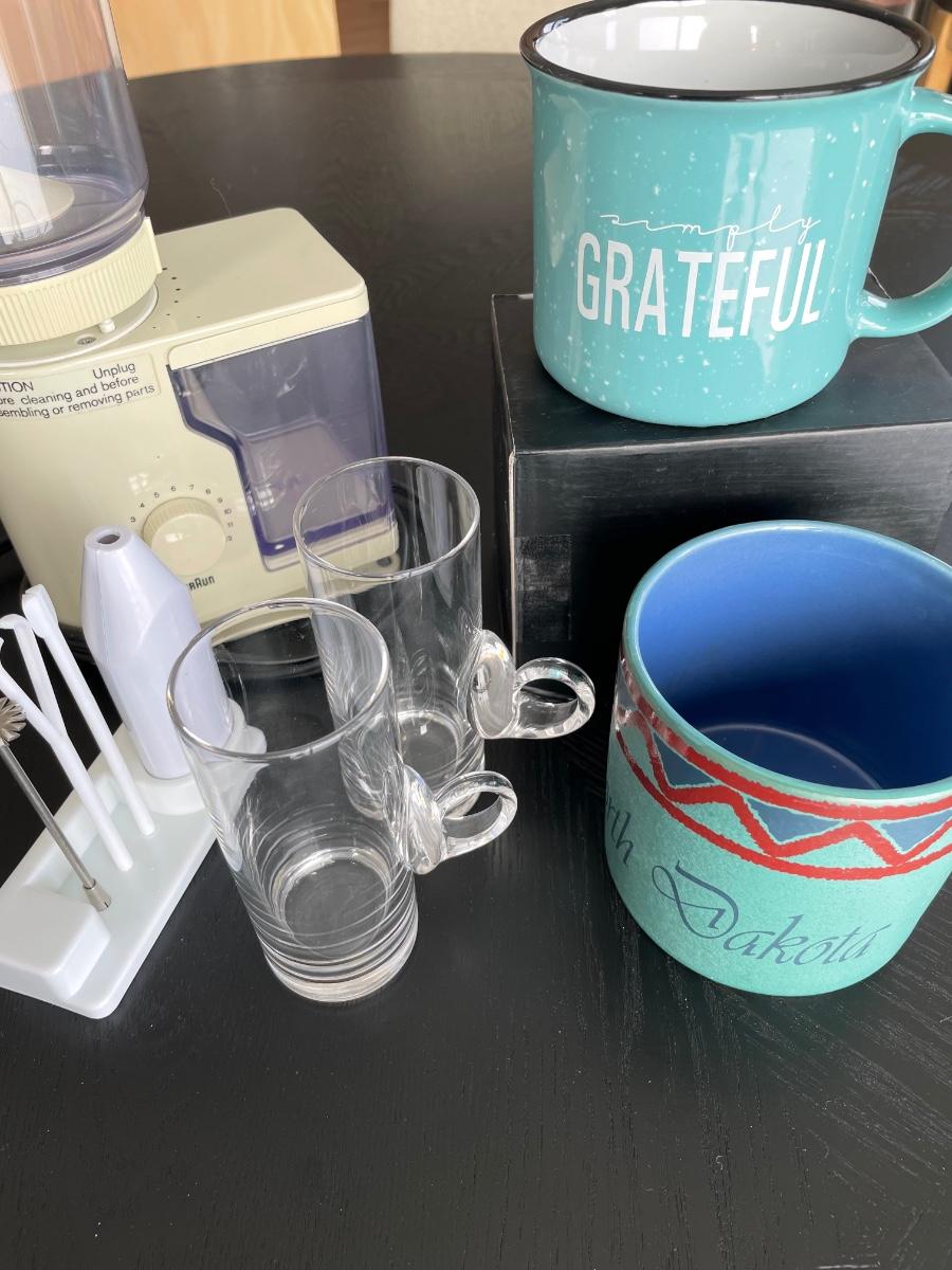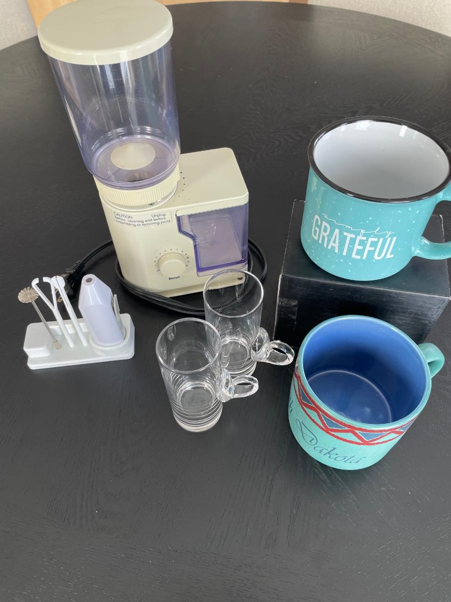 Coffee grinder has lid, Irish coffee glasses, frother with attachments