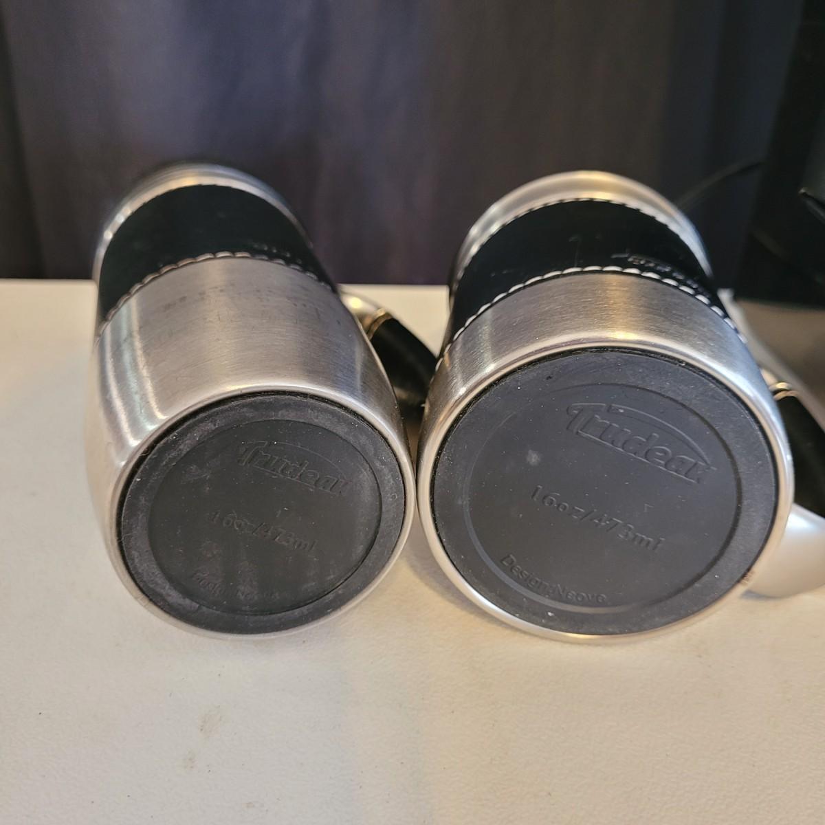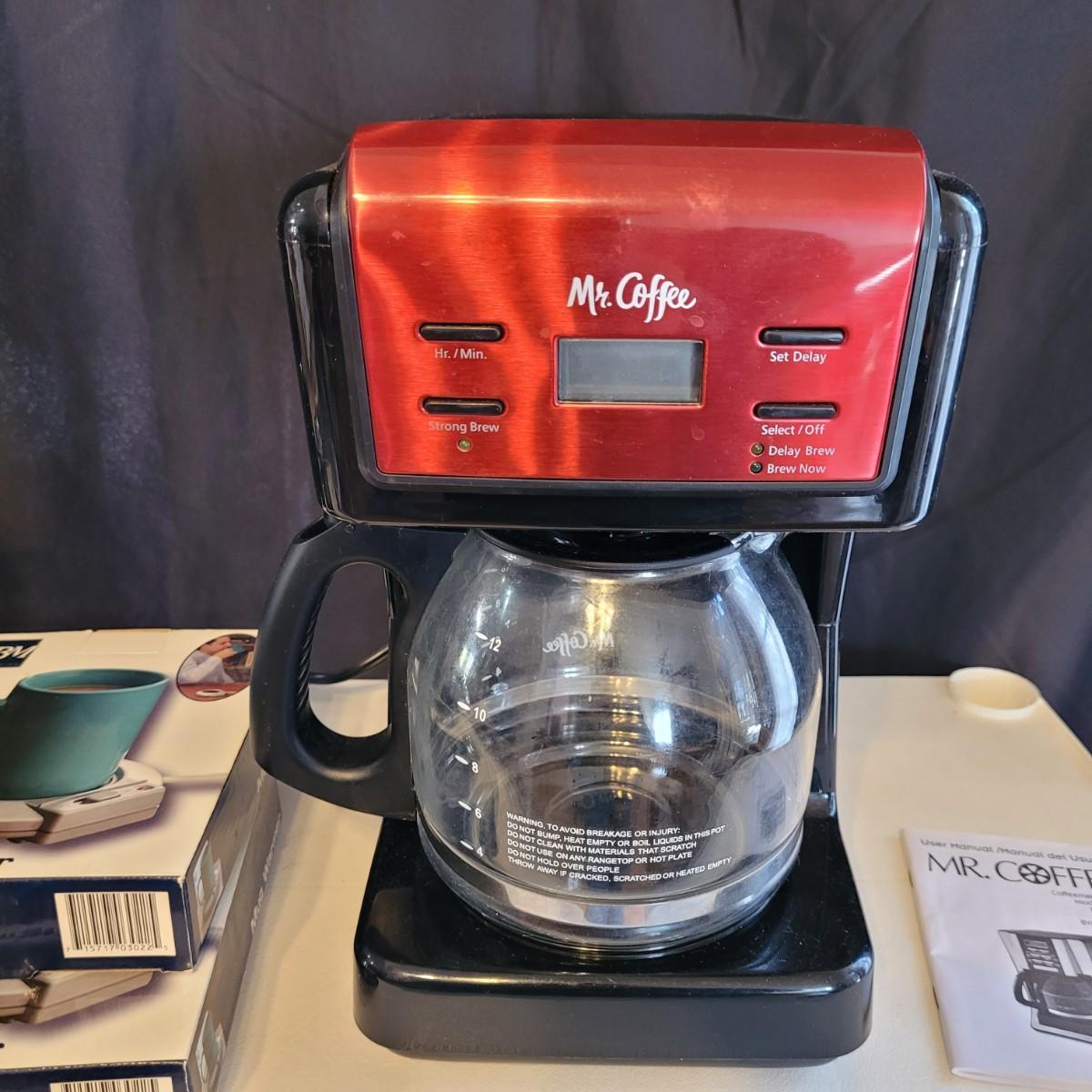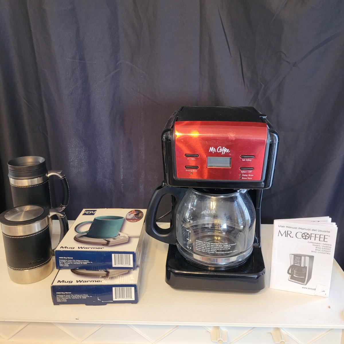 Mr. Coffee coffee maker has a 12 cup karaff. Two mug warmers appear unused and both mugs hold 16 oz. Coffee maker powered on when plugged in.