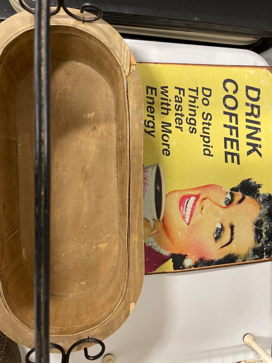 Coffee sign, cutting board, metal decor