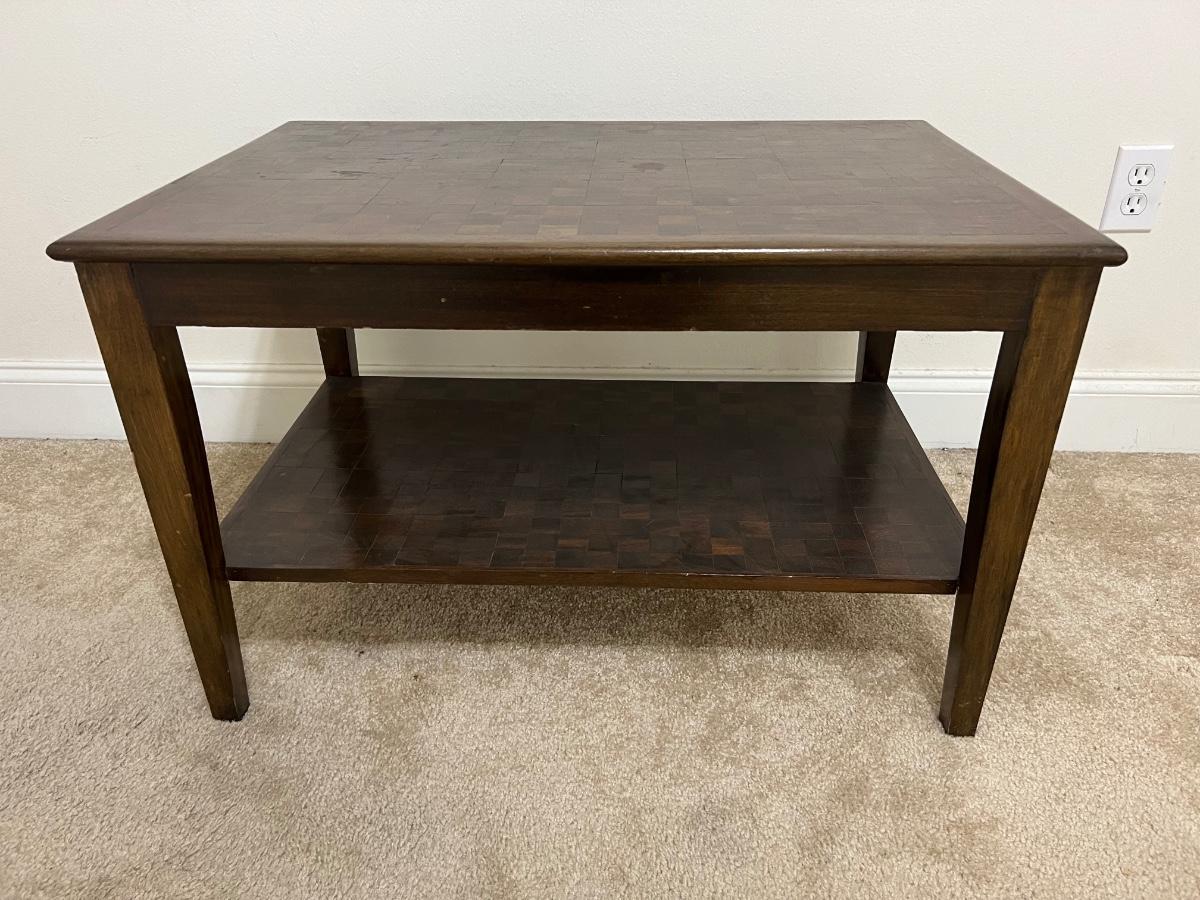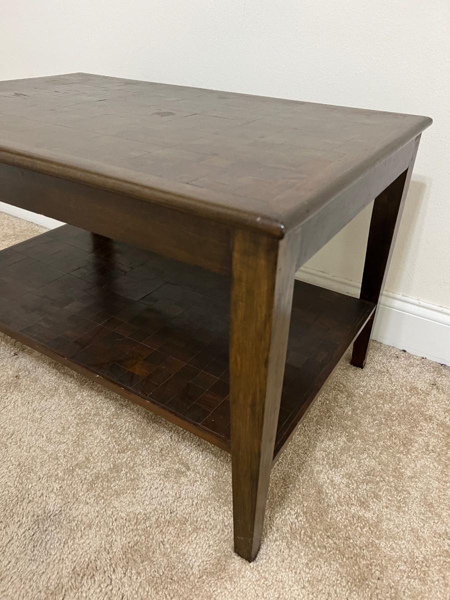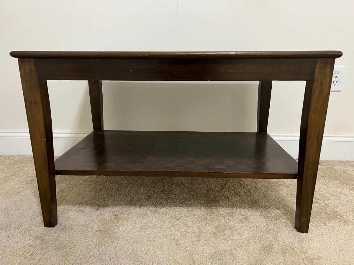 Hand made coffee table. Measures 19 1/2 inches tall, 30 1/2 inches wide and 21 inches deep.