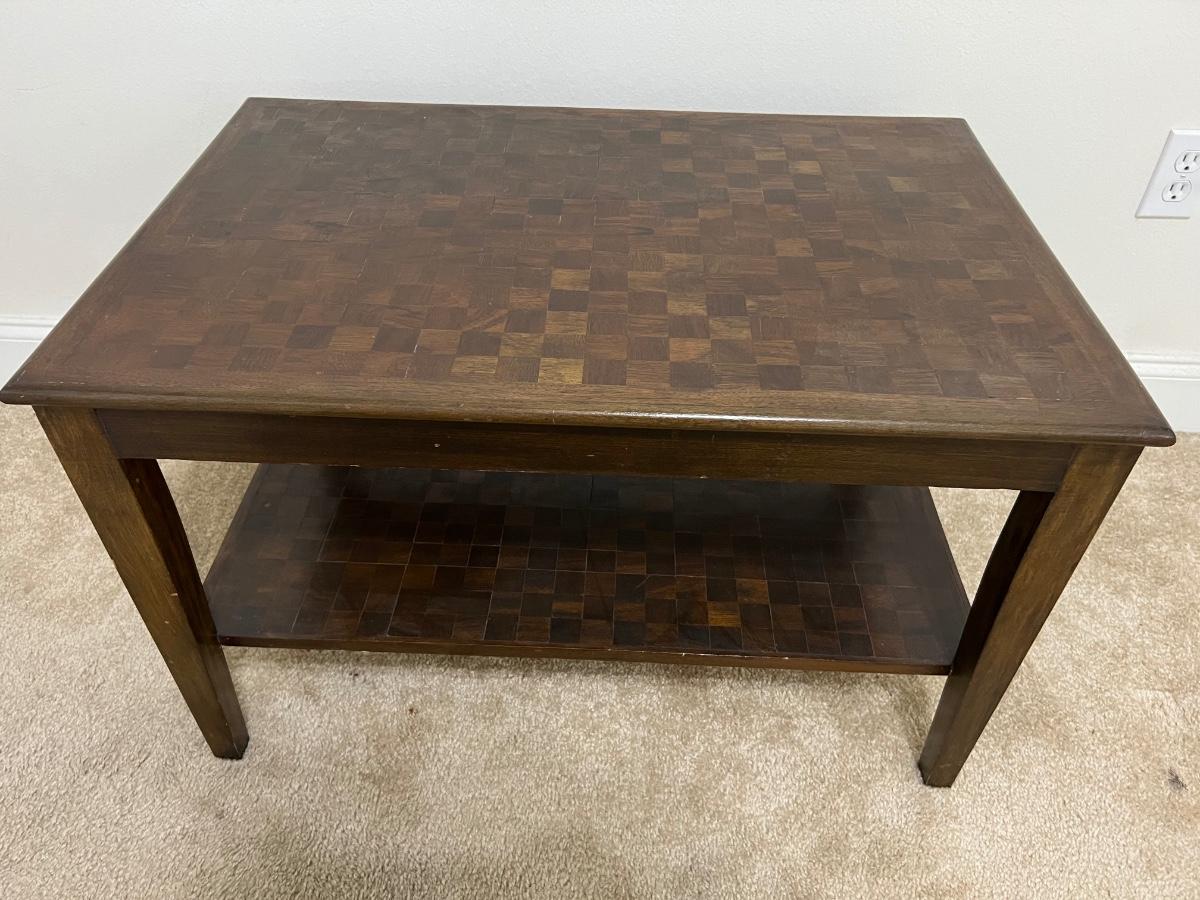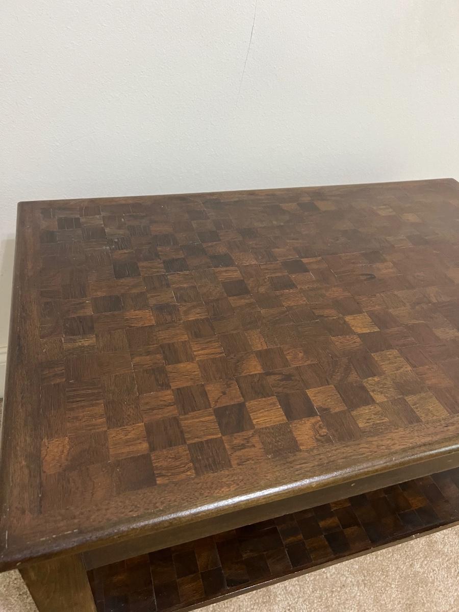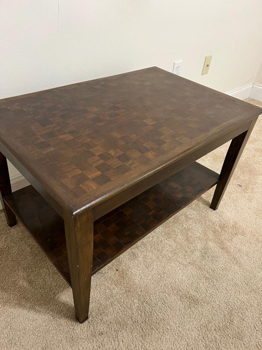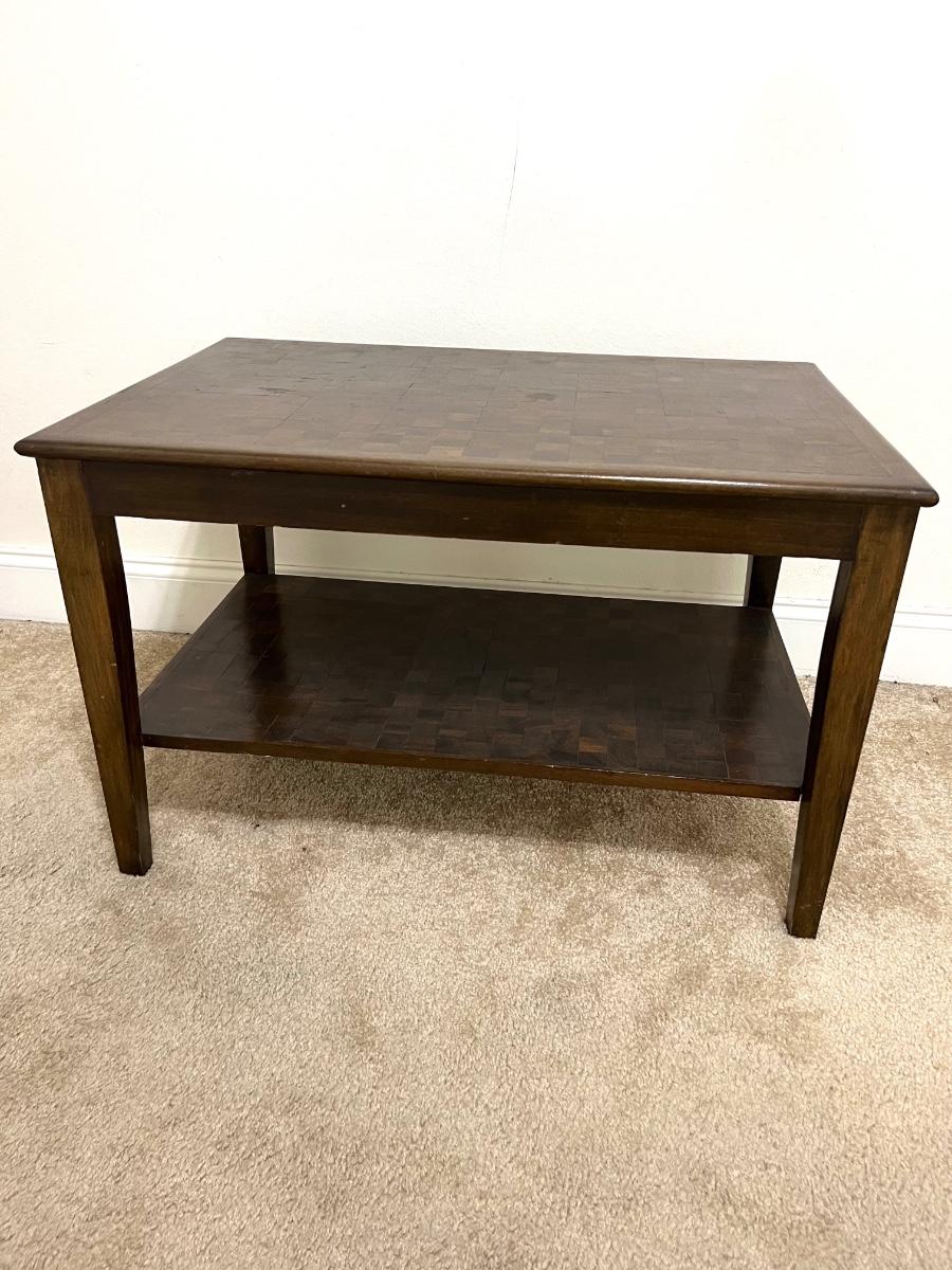 Hand made coffee table. Measures 19 1/2 inches tall, 30 1/2 inches wide and 21 inches deep.
