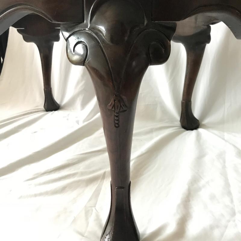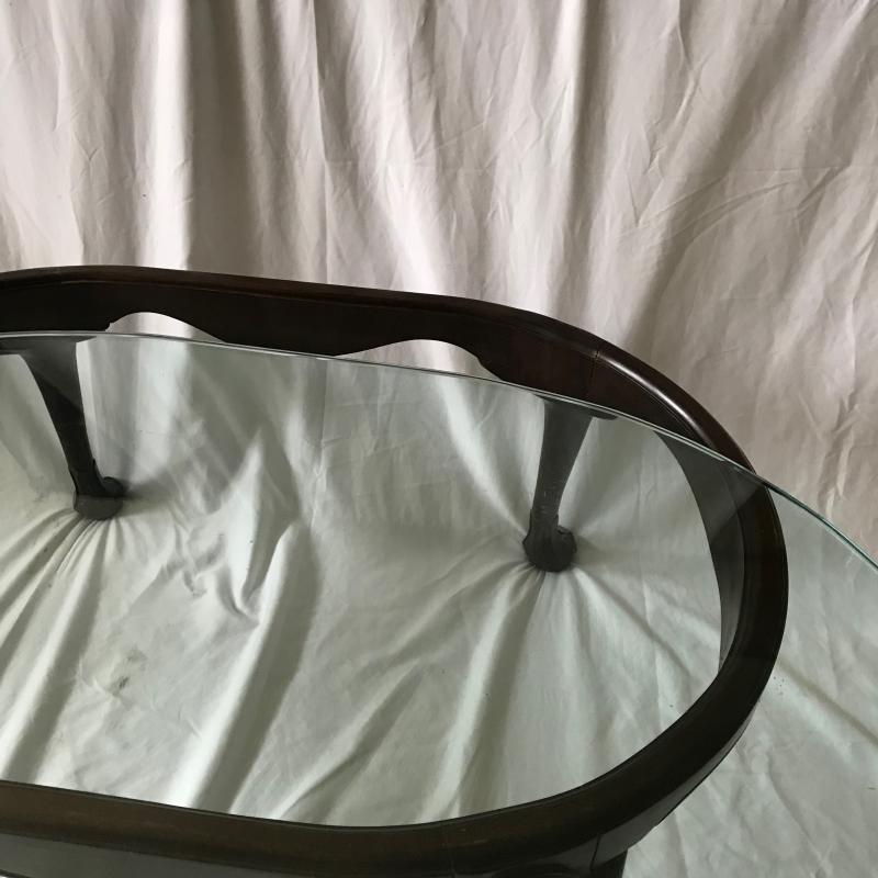 This oval coffee table is made from wood with a dark finish and a glass top (approx. 45.5” x 32” x 17” tall). No shipping available. Local pickup only in Hendersonville, NC.