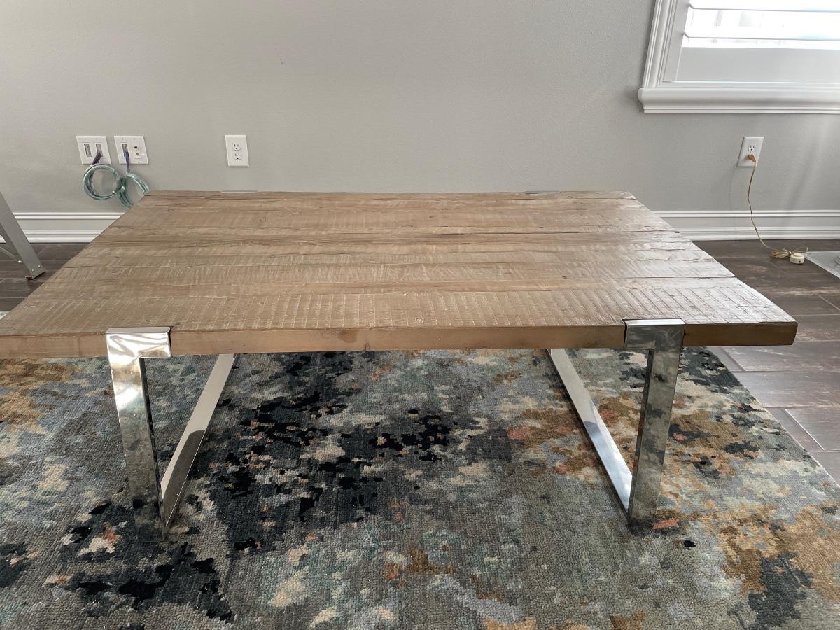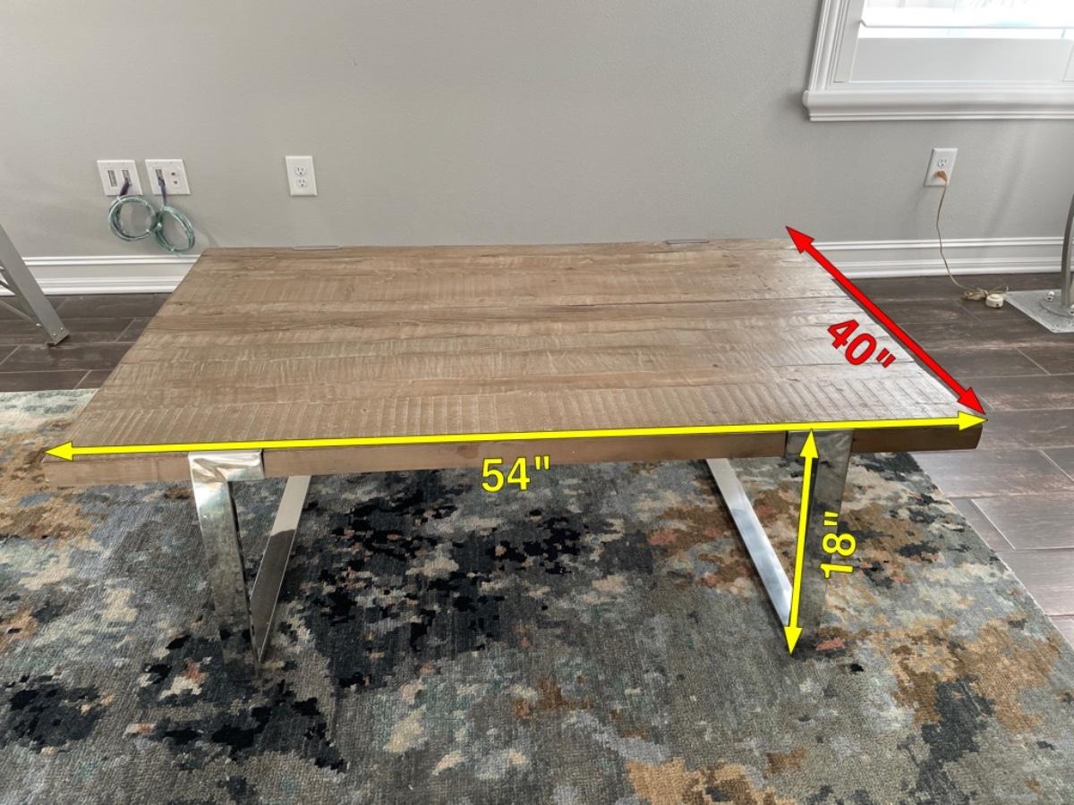 Perfect condition. Made of distressed wood planks that resemble barn wood with chrome legs. measures 54" X 40"