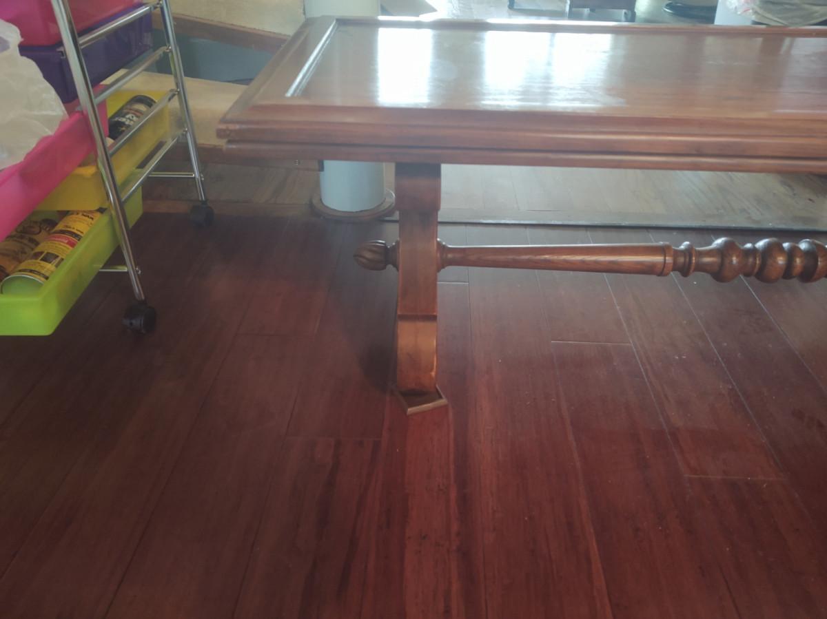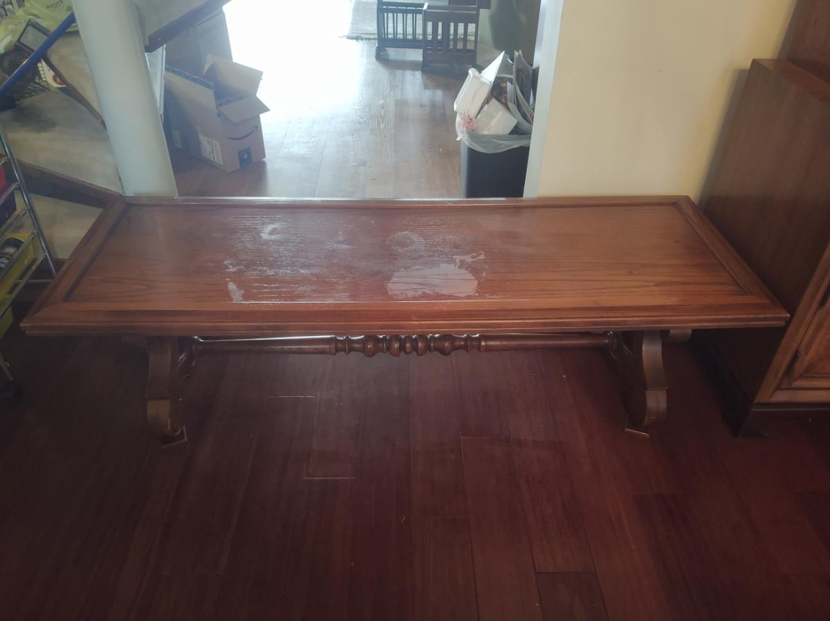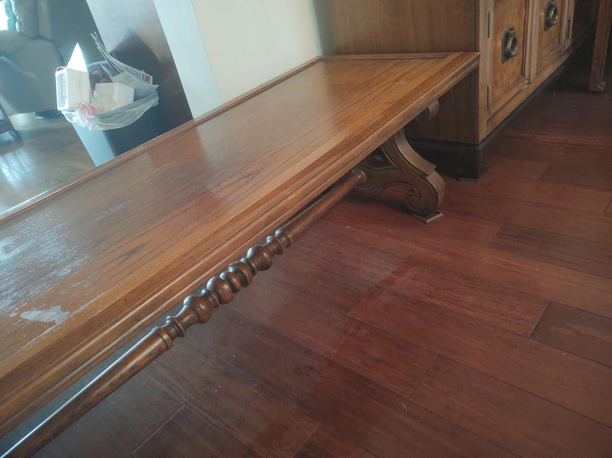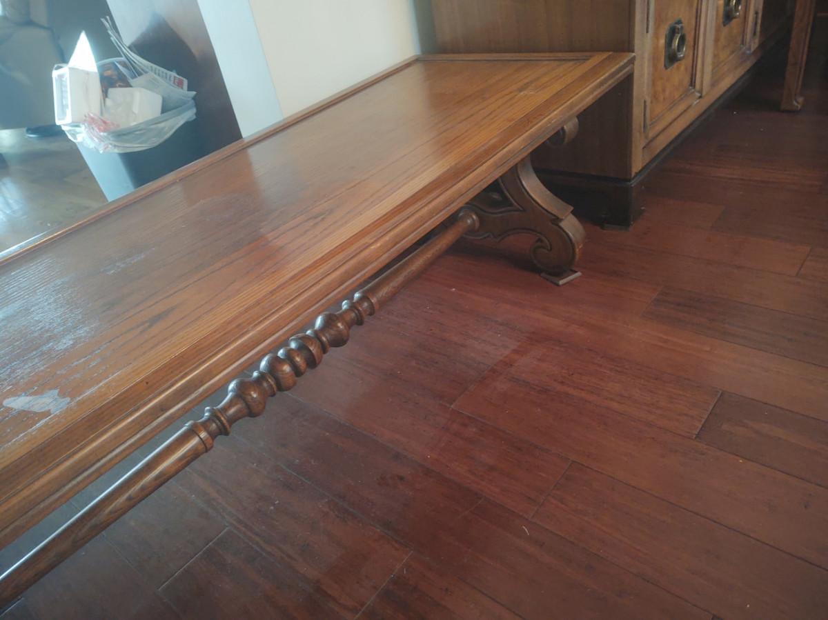 Table has a turned support piece. Measures 62x22x16. Top is stained and worn in several places. Please see pictures for details.