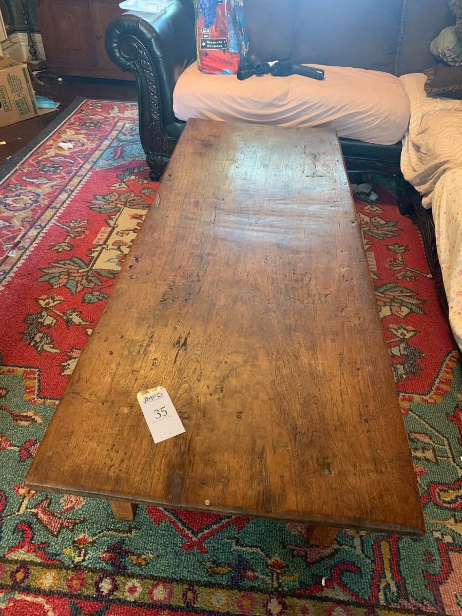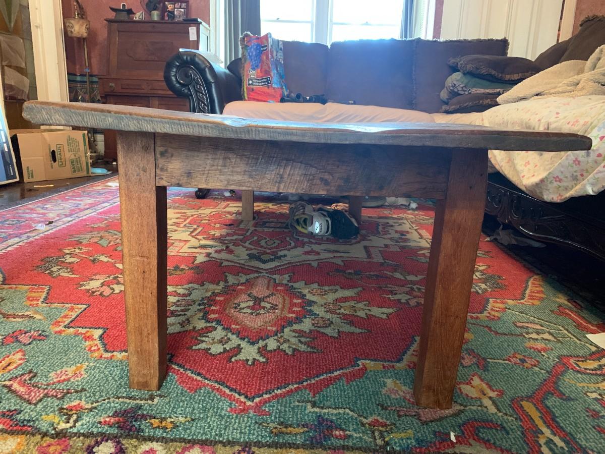 Rectangular Rustic Wood Coffee Table with Plank Top and Uneven Edges. Long, farm house style