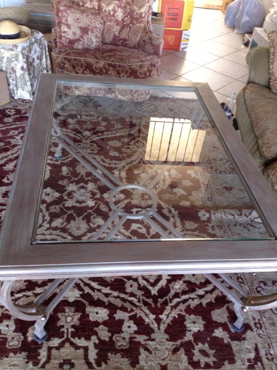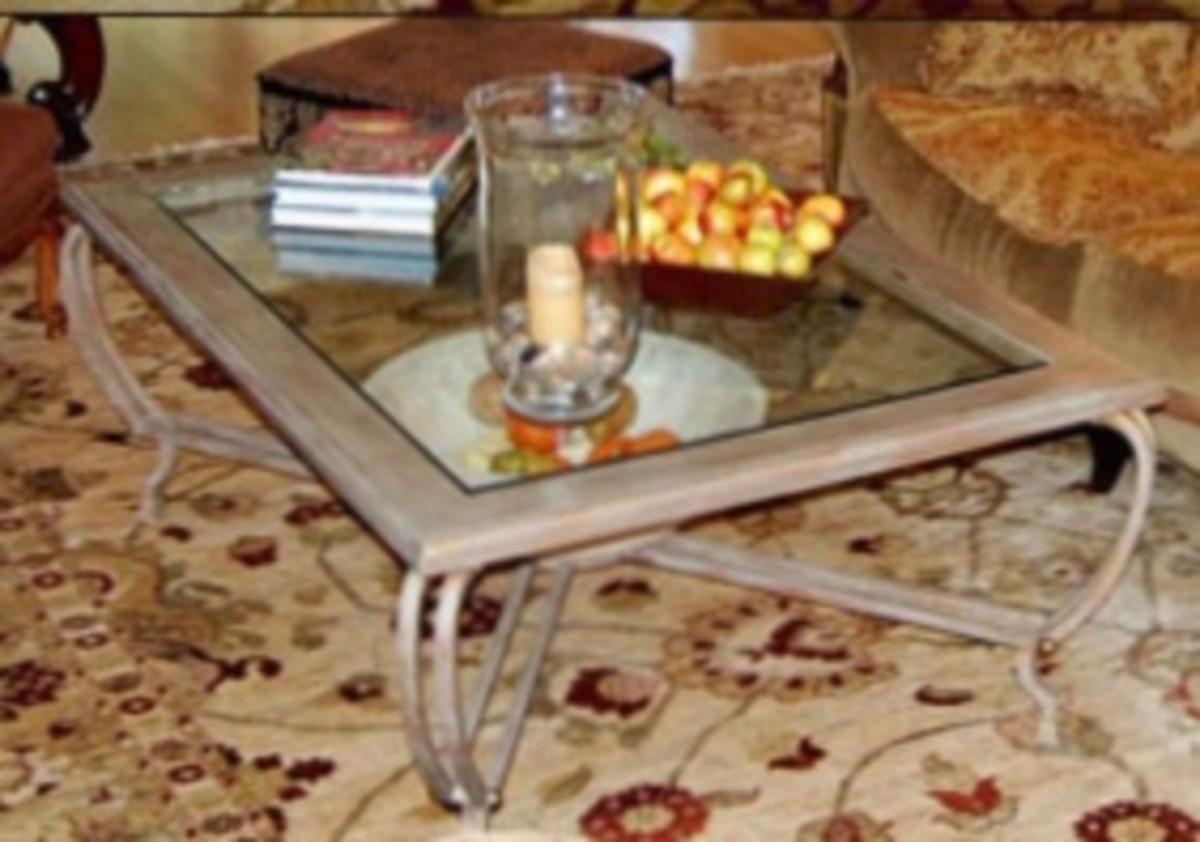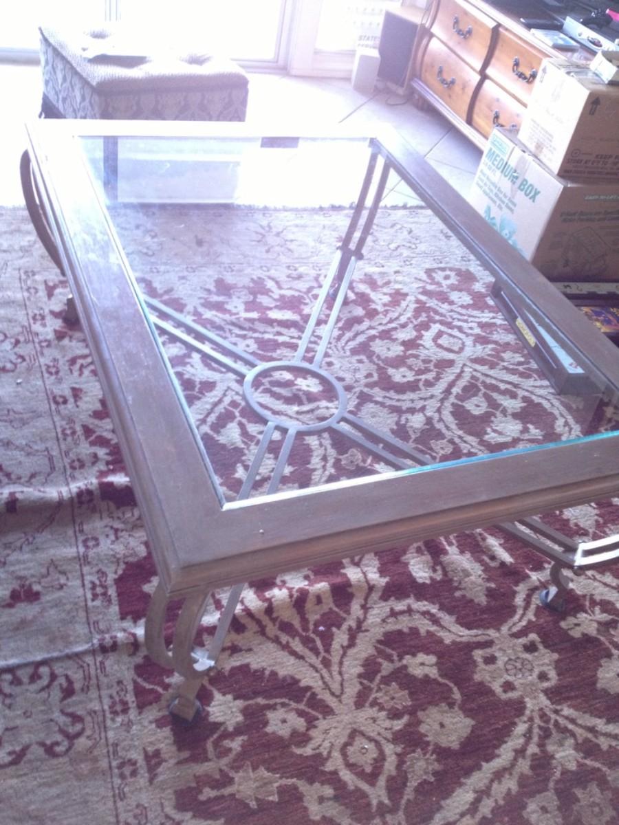 Glass and metal coffee table. One decorative knob missing on leg near base. 57" x 42"