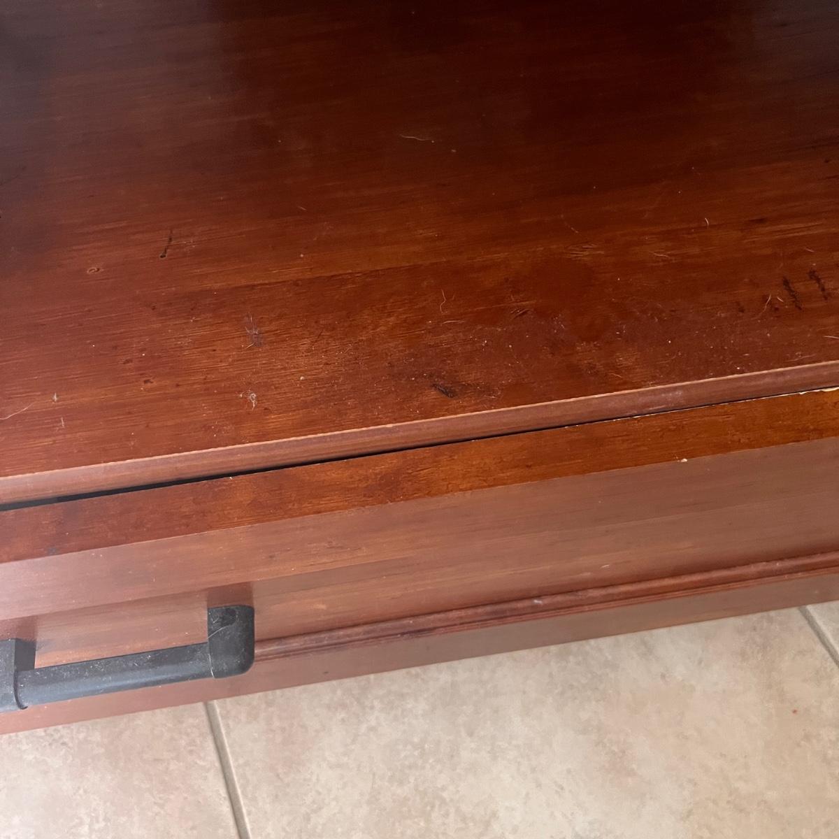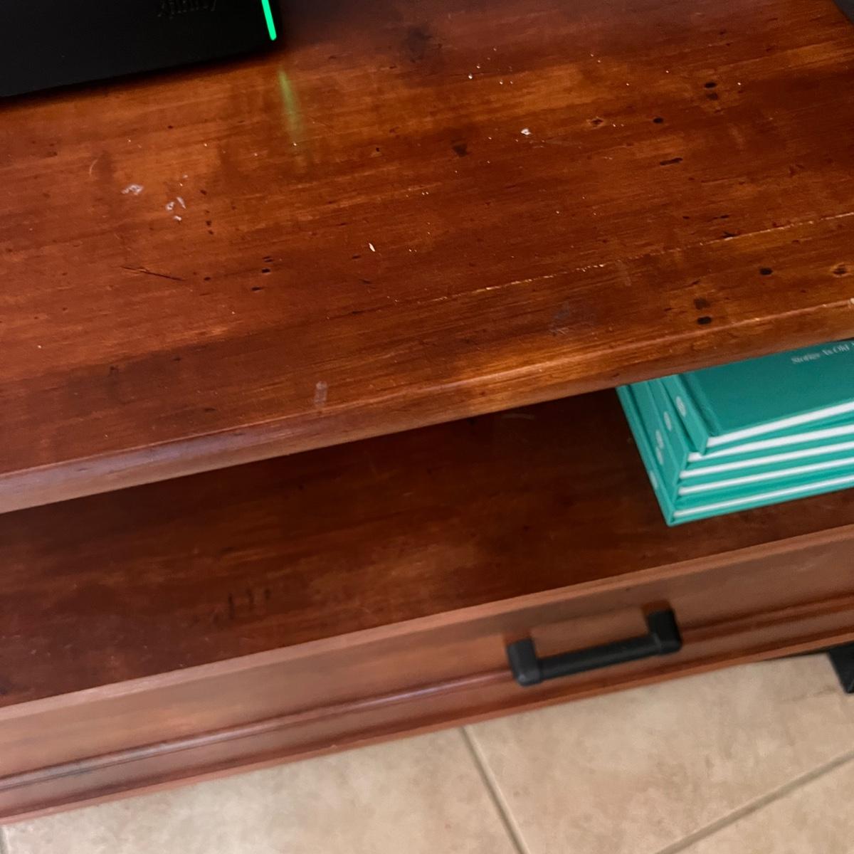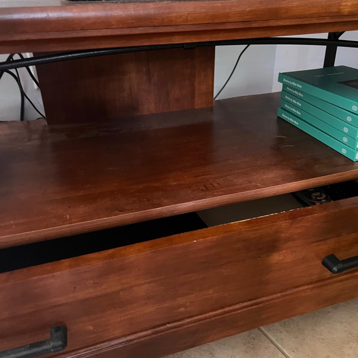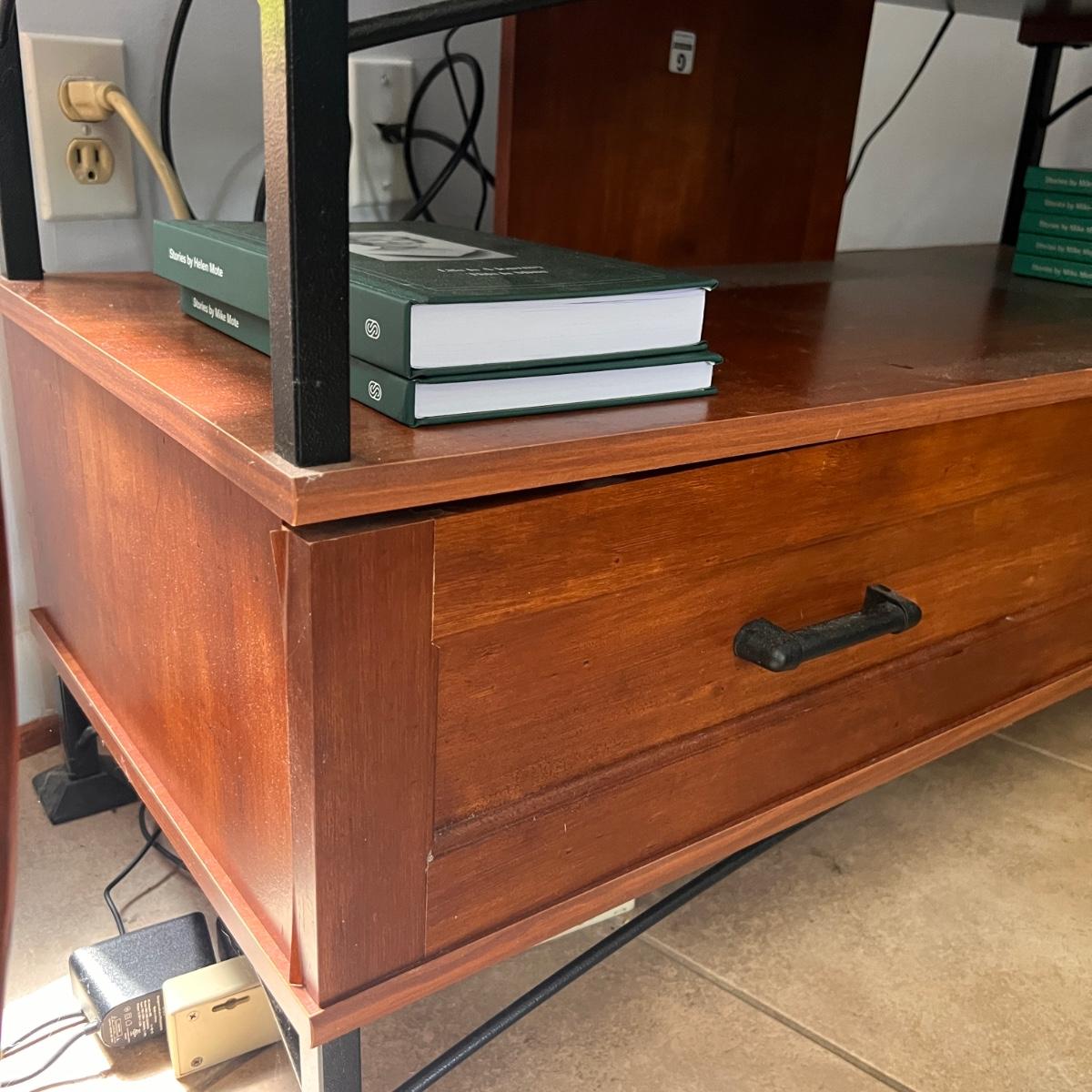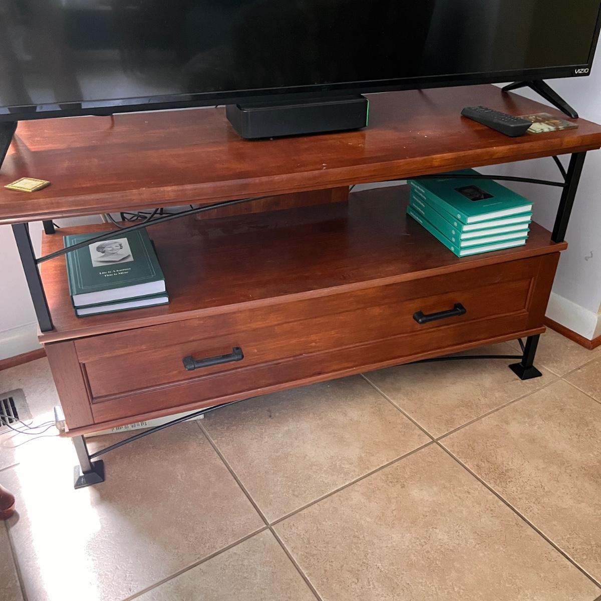 Wooden coffee table TV table with black iron hardware. NOTE: Drawer sticks but does close with a hard push. Some scratches as shown in pictures.