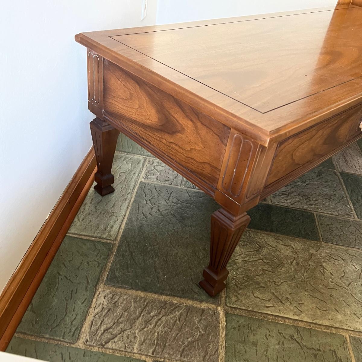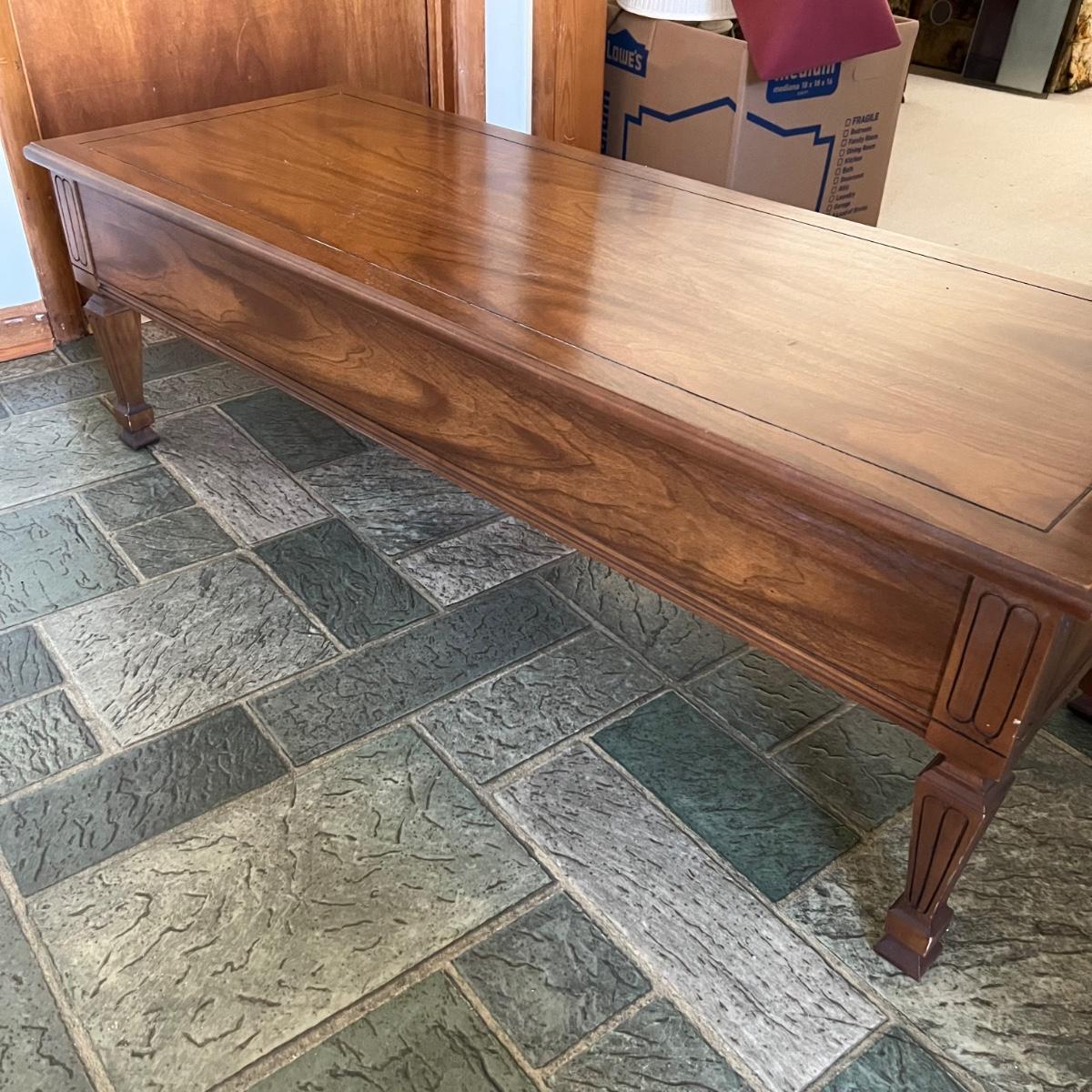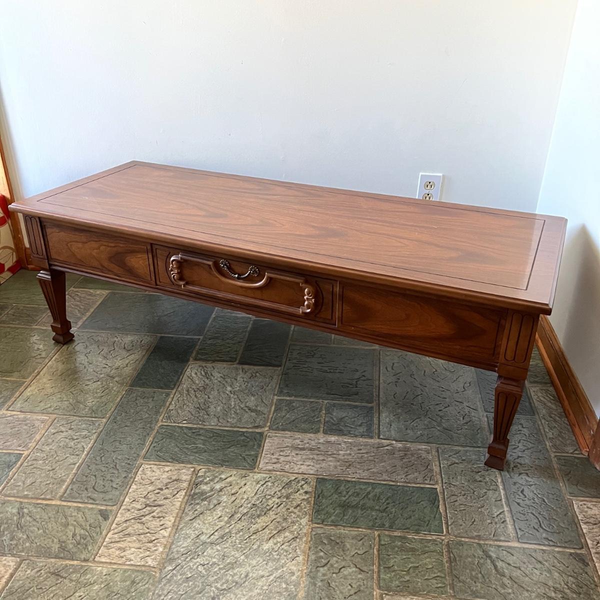 This solid wood coffee table features one dovetailed drawer with a metal handle. Table is good condition.