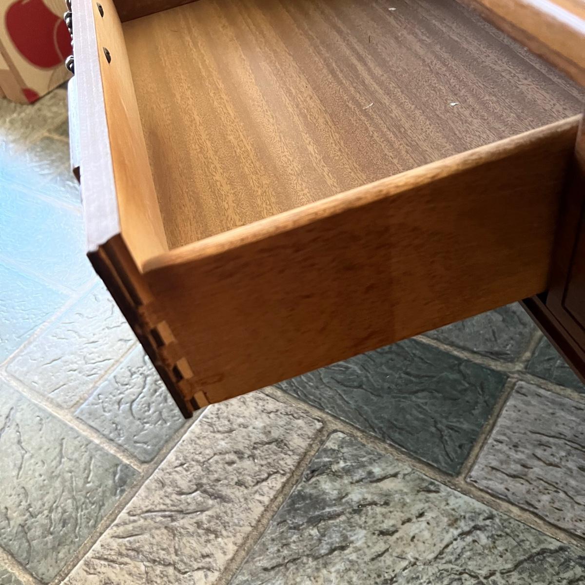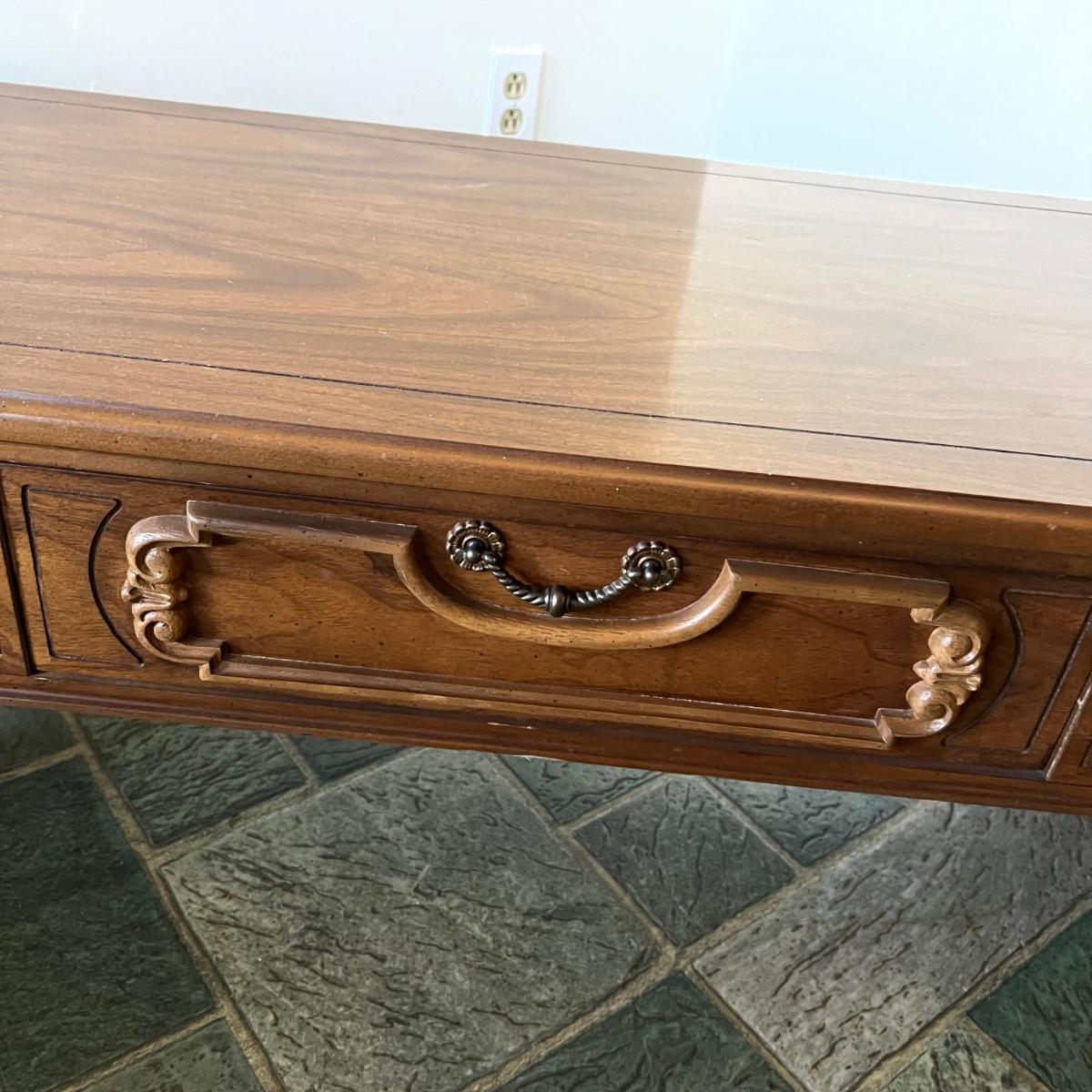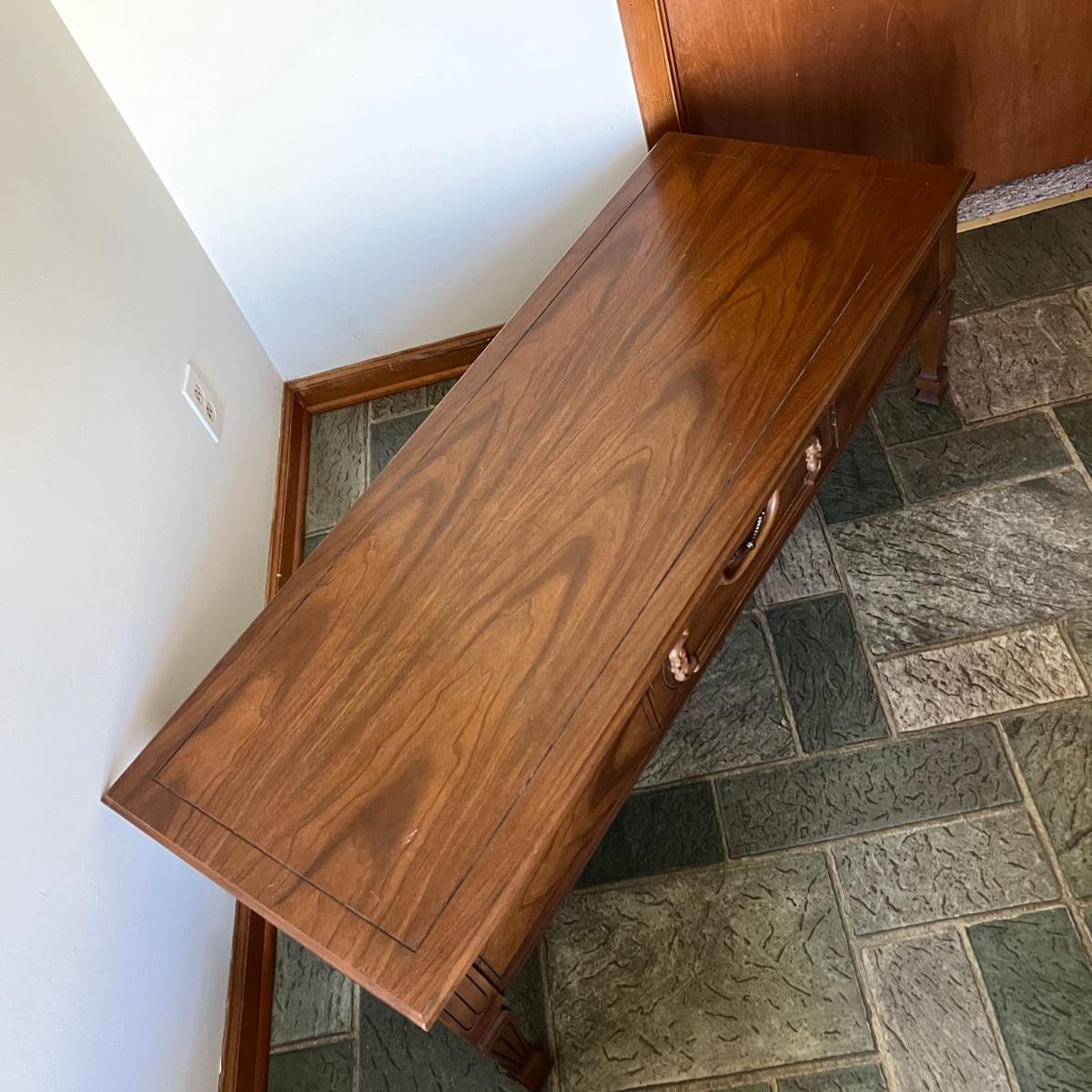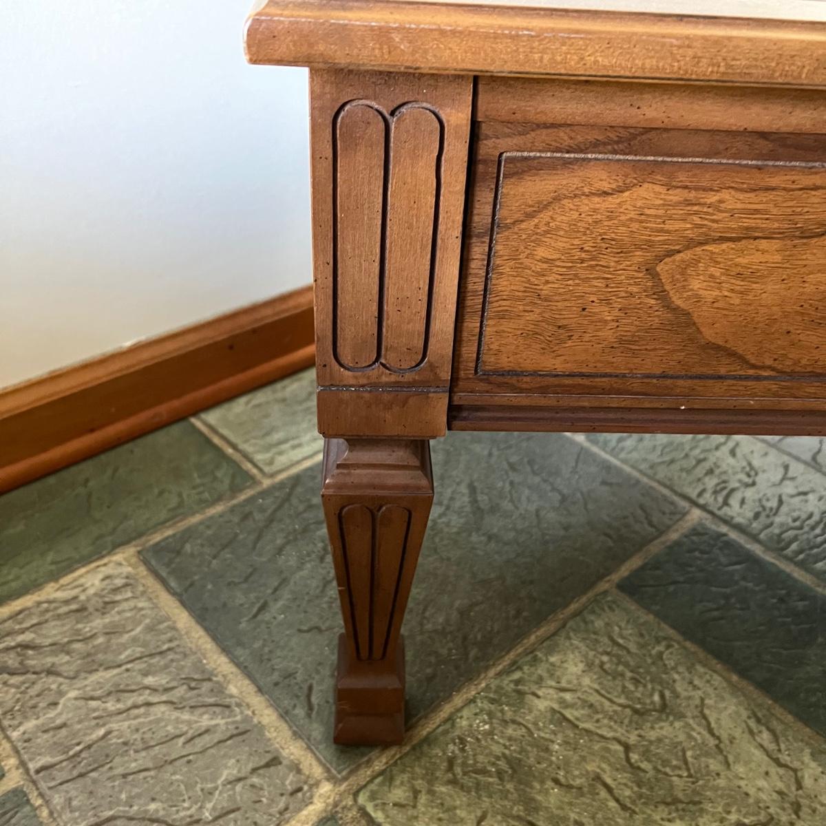 This solid wood coffee table features one dovetailed drawer with a metal handle. Table is good condition.