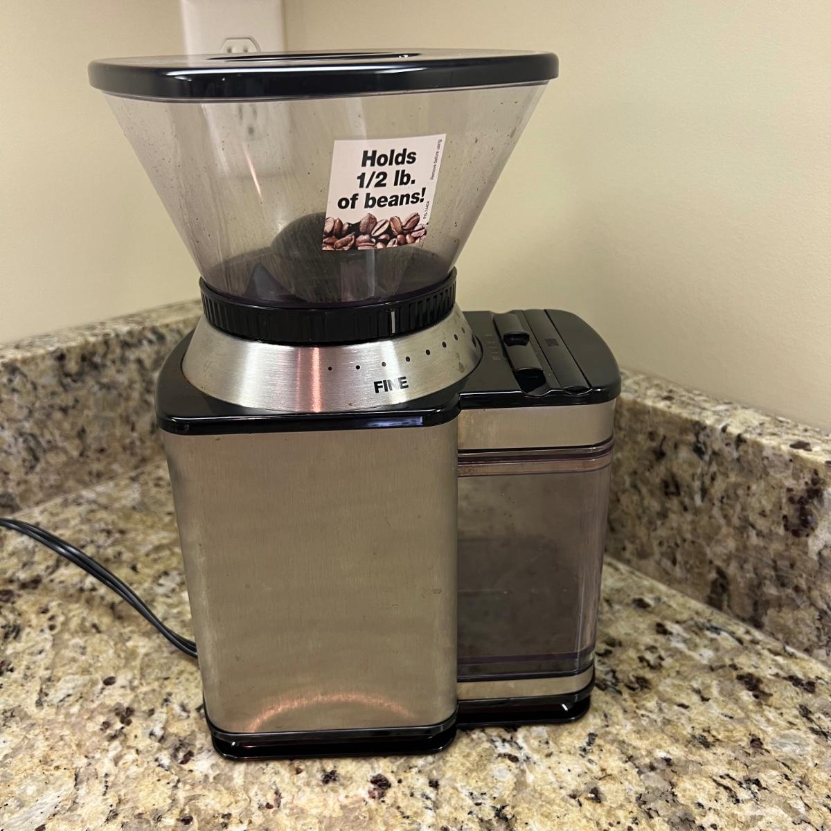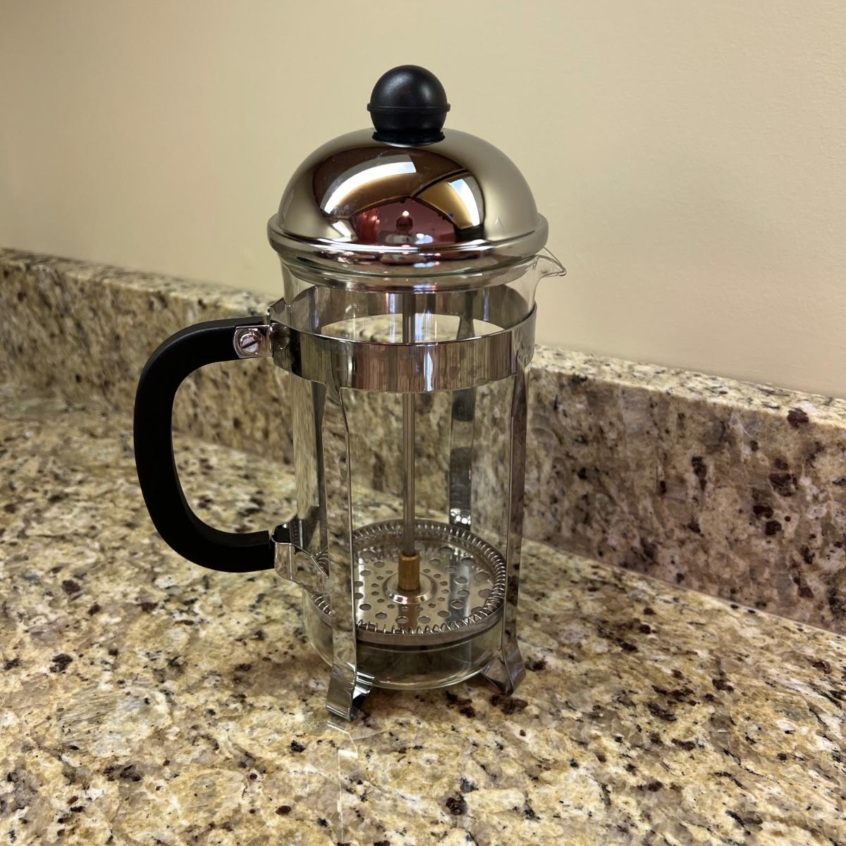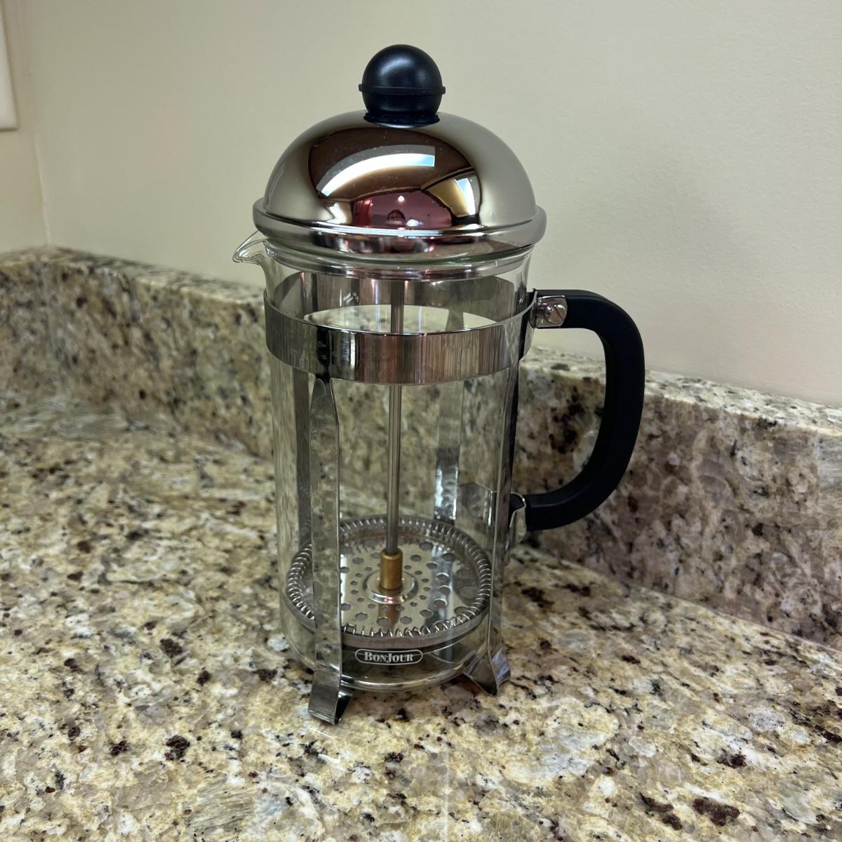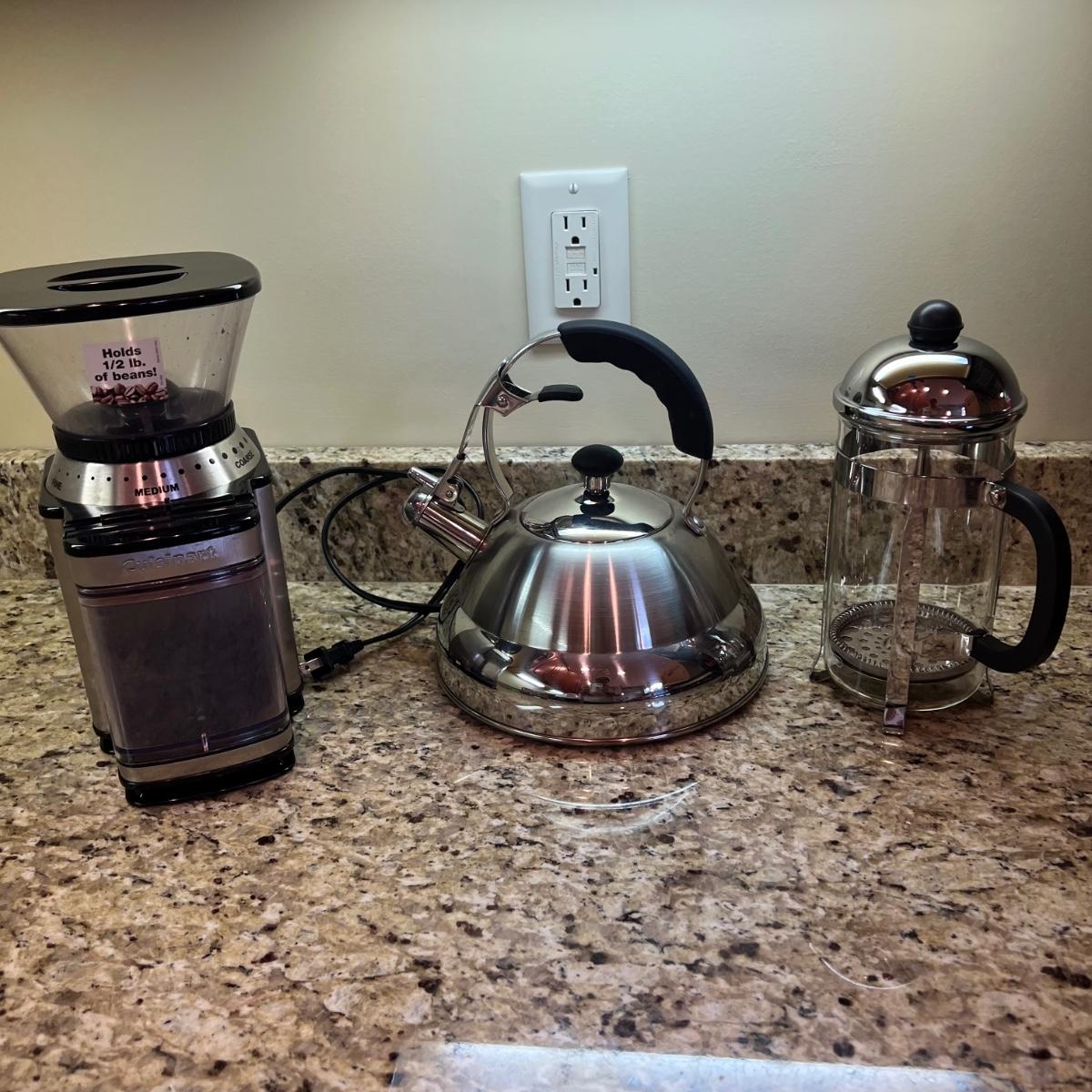 A Cuisinart coffee bean grinder measures 7” x 5” x 10.5”H and powered on when plugged in. A stainless steel Tramontina 2 quart kettle measures 9”D x 9.5”H. A Bonjour brand glass French press measures 3.5”D x 9.5”H.