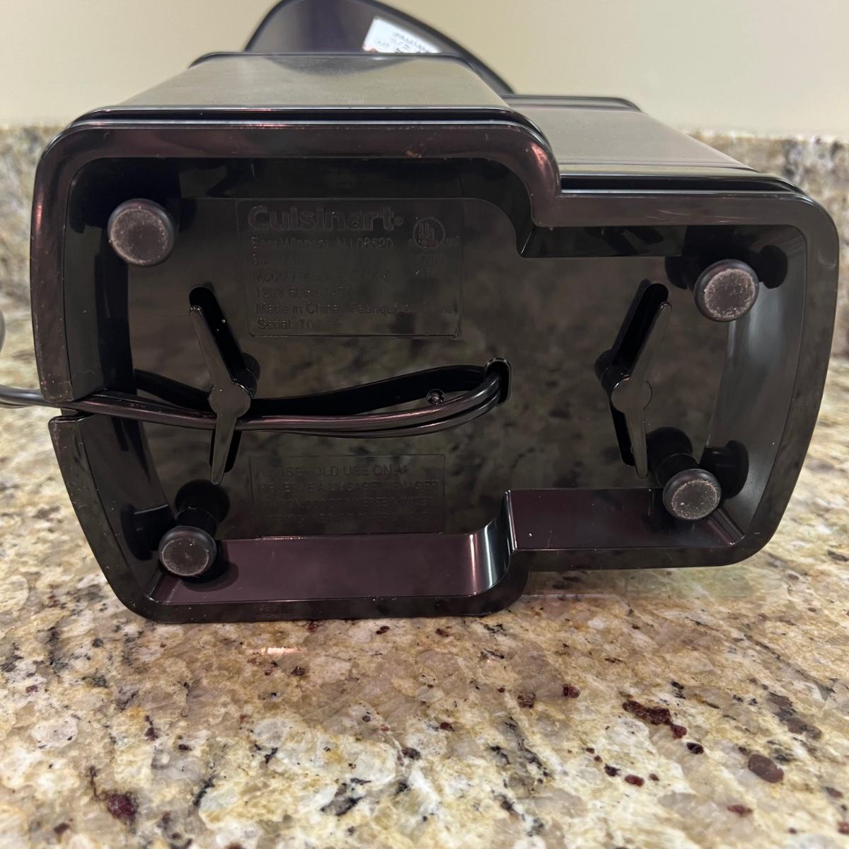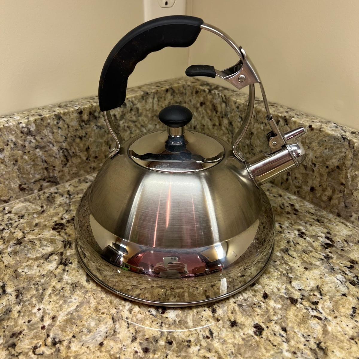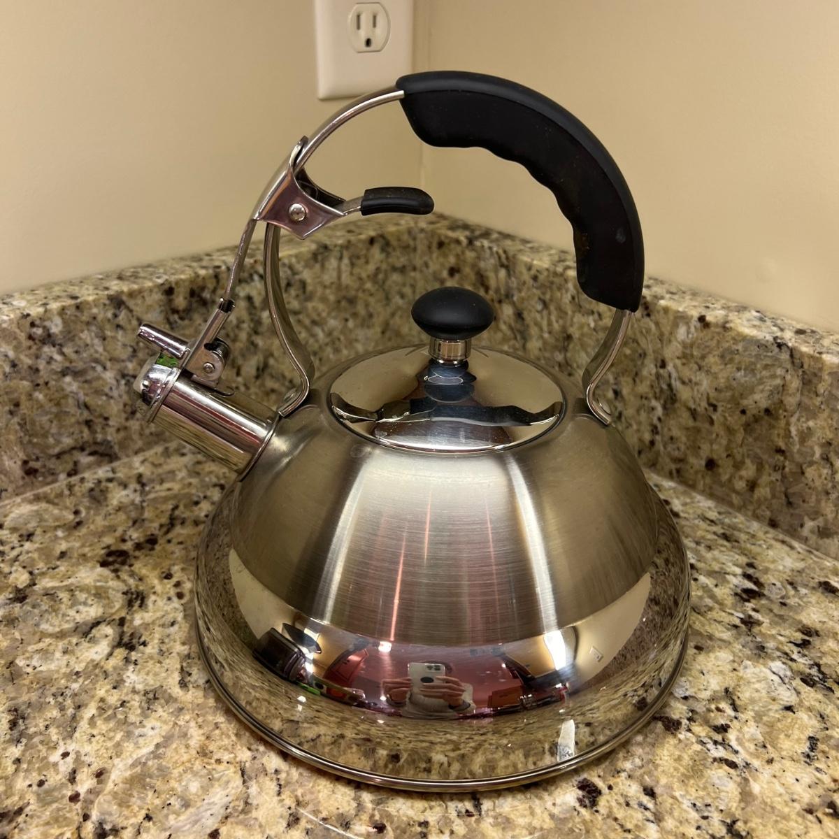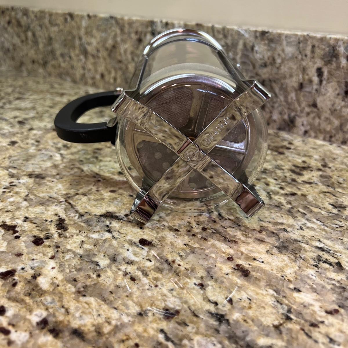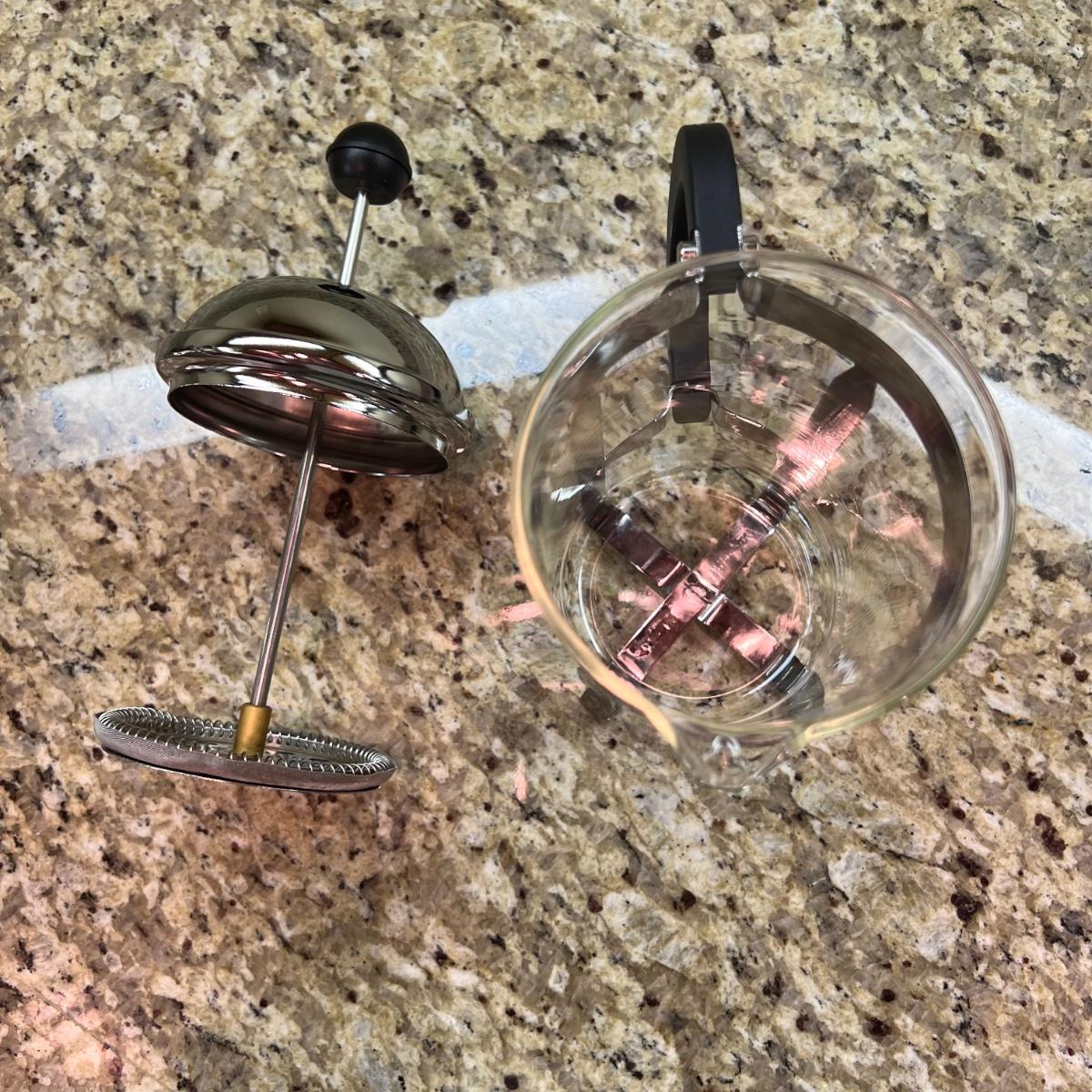 A Cuisinart coffee bean grinder measures 7” x 5” x 10.5”H and powered on when plugged in. A stainless steel Tramontina 2 quart kettle measures 9”D x 9.5”H. A Bonjour brand glass French press measures 3.5”D x 9.5”H.