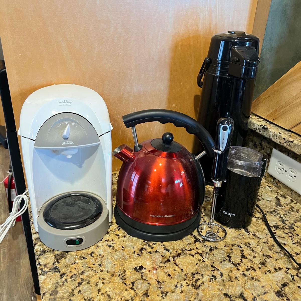 Cordless kettle, carafe, tea drop and more. All electrical goods powered on when tested. Small whisk has a power cord included to charge it.