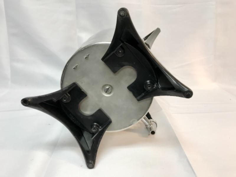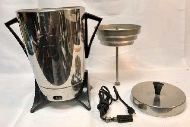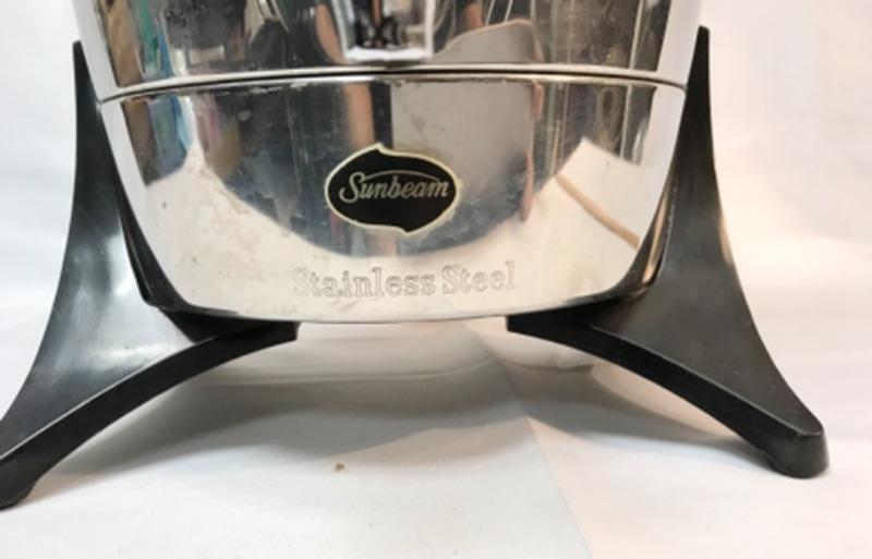 Shiny chromed stainless steel body and retro cool atomic style black plastic/bakelite handles and base. Marked for 12, 18, 24, & 30 cups , with all of the instructions conveniently engraved on the lower back. Fully automatic , it begins perking just after you plug it in. The Sunbeam logo under the spigot comes on and glows orange when the coffee is ready. Has all of the original parts, in very nice condition with just minor signs of use. The chrome stainless steel pot is in nice condition, with only some minor surface scratches from use and cleaning that you would expect of an appliance of this age. Nothing that takes away from the gorgeous looks of the coffee urn. No dents or dings, and no chips or cracks in any of the plastic parts. The detachable vinyl power cord and 2-prong plug, in perfect condition as well. Stands 16" tall, and is about 13" tip of handle to tip of handle.