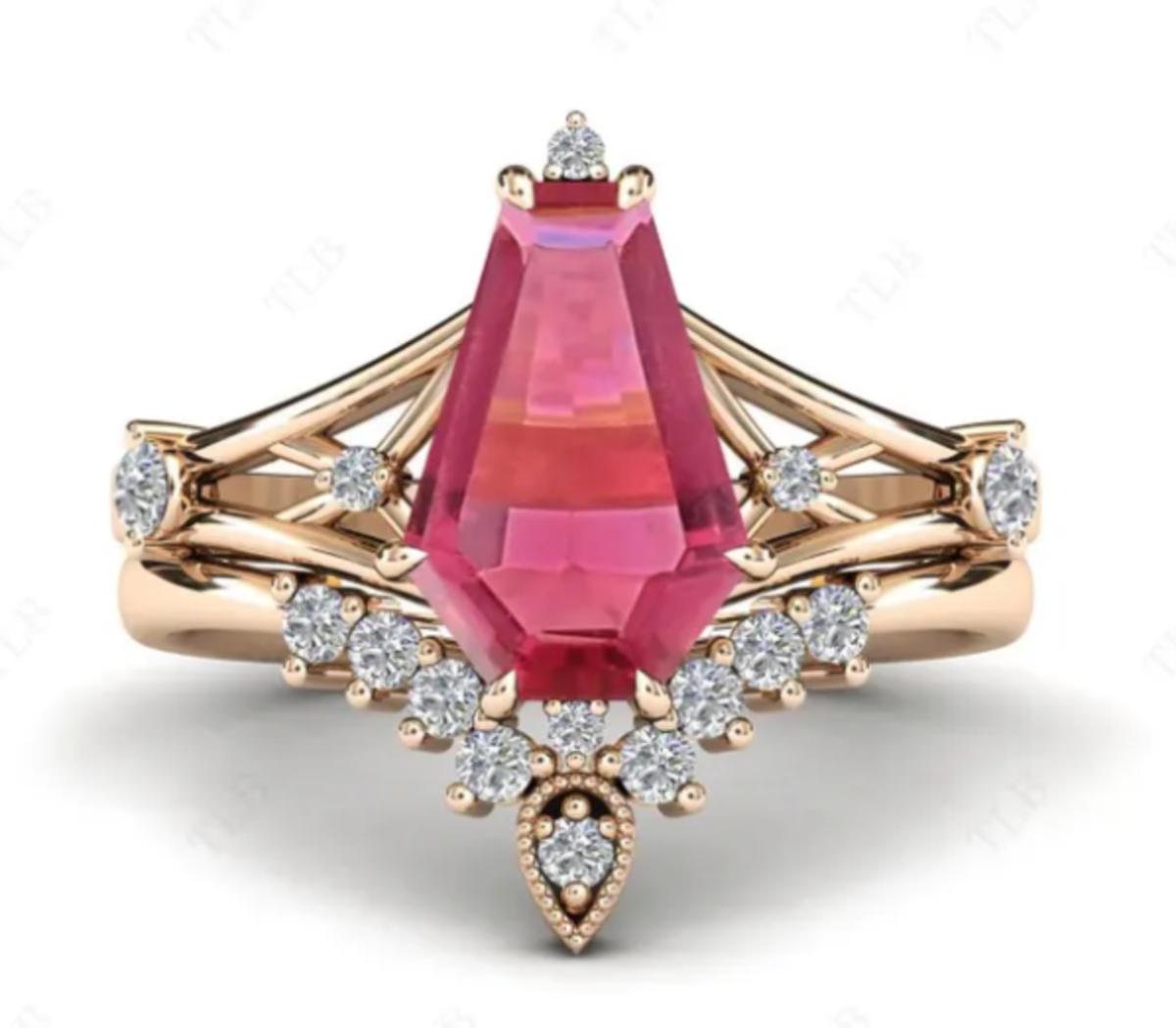 Coffin Cut Pink Tourmaline & Moissanite Bridal Set