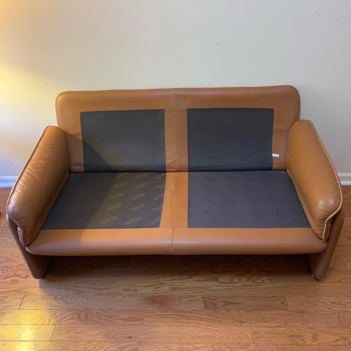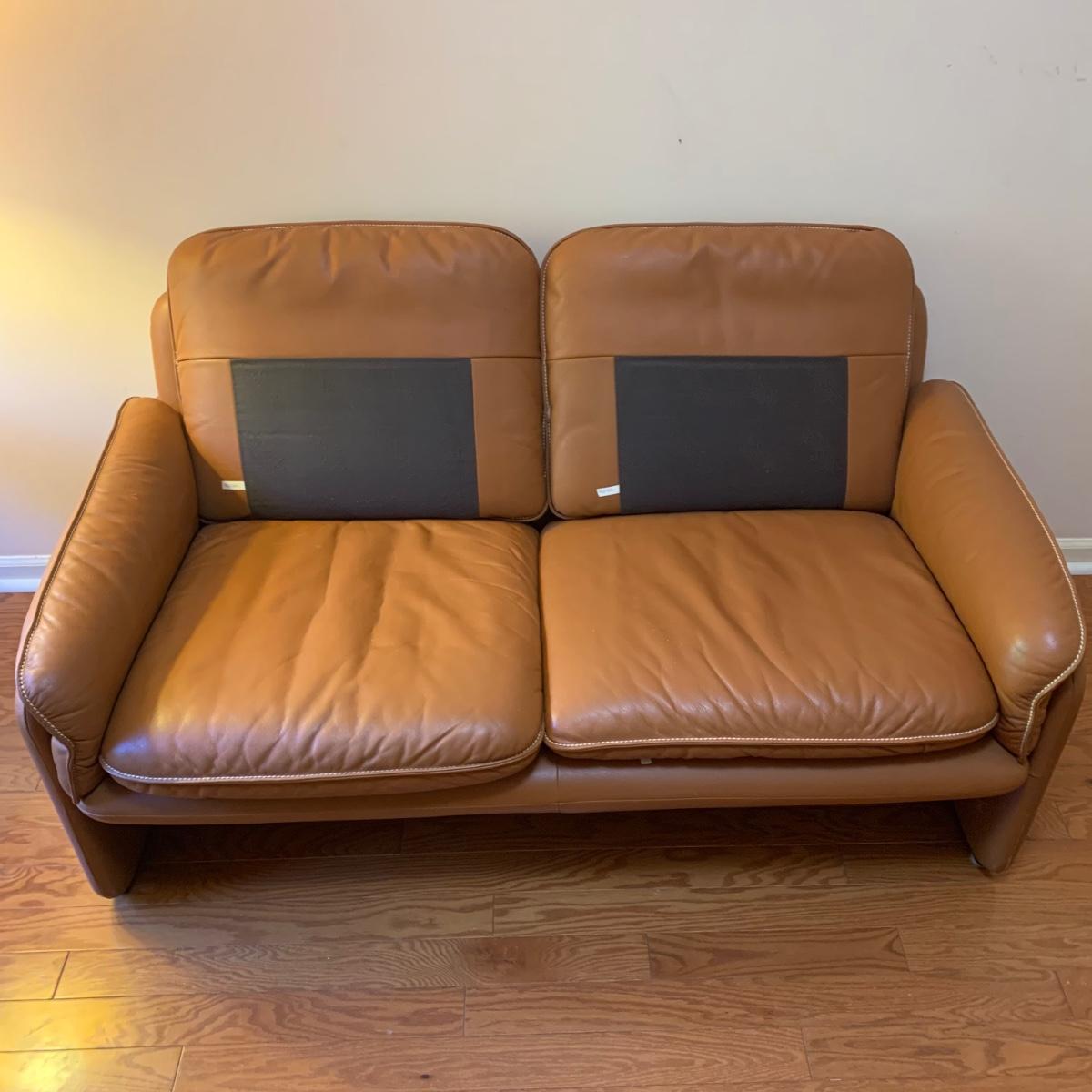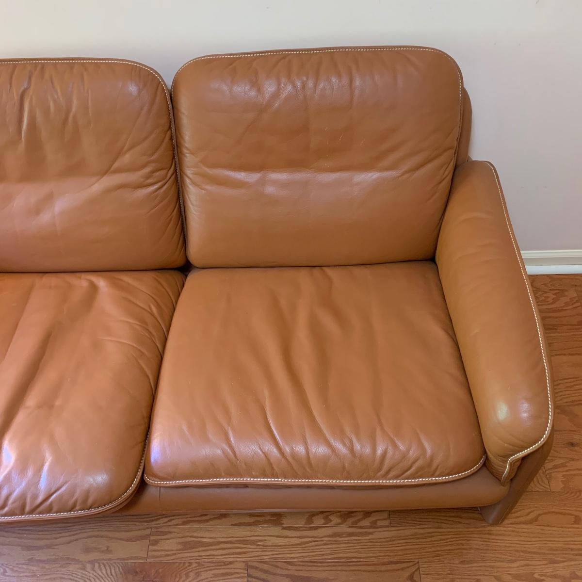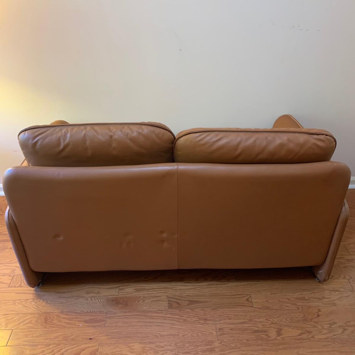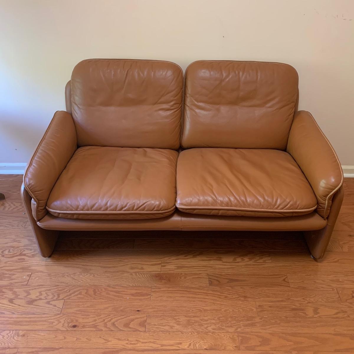 Nice mid-century modern style De Sede of Switzerland leather loveseat, featuring cognac-colored leather with white stitching. All four cushions are removable for easy cleaning! This loveseat has a few scratches, but is in overall good condition. See photos for details. Loveseat measures, 55”L x 32.5”W x 32”H with a seat height of 18”H.