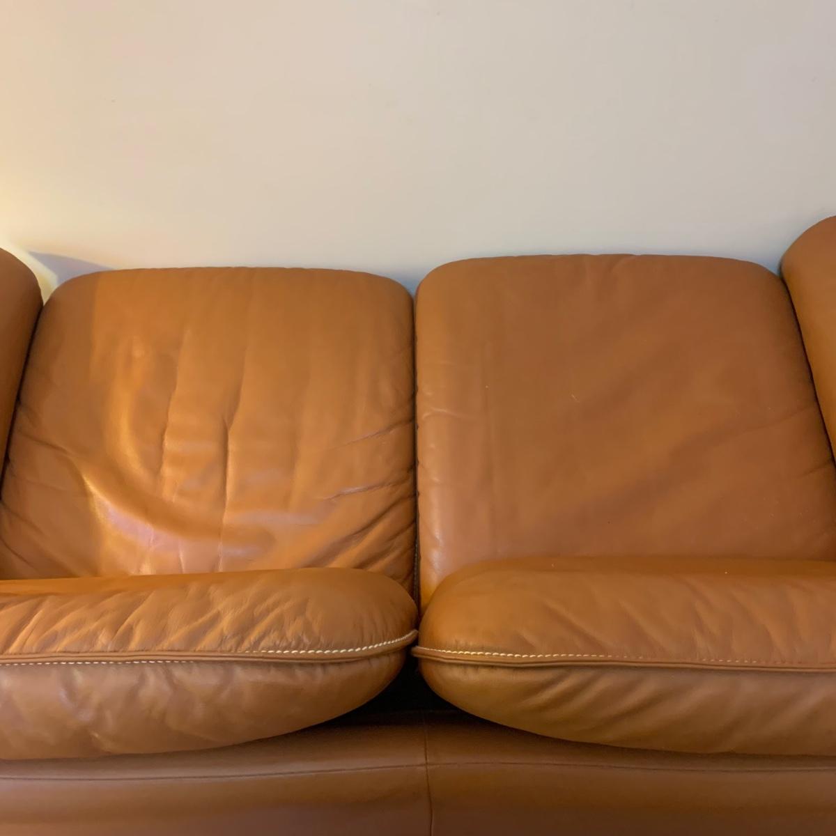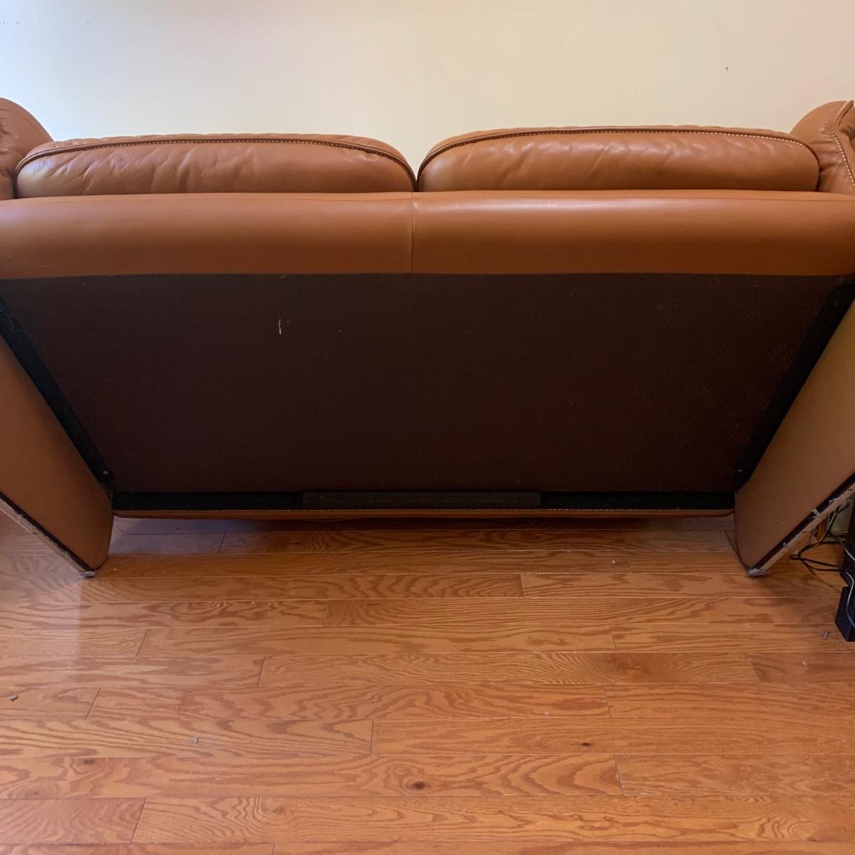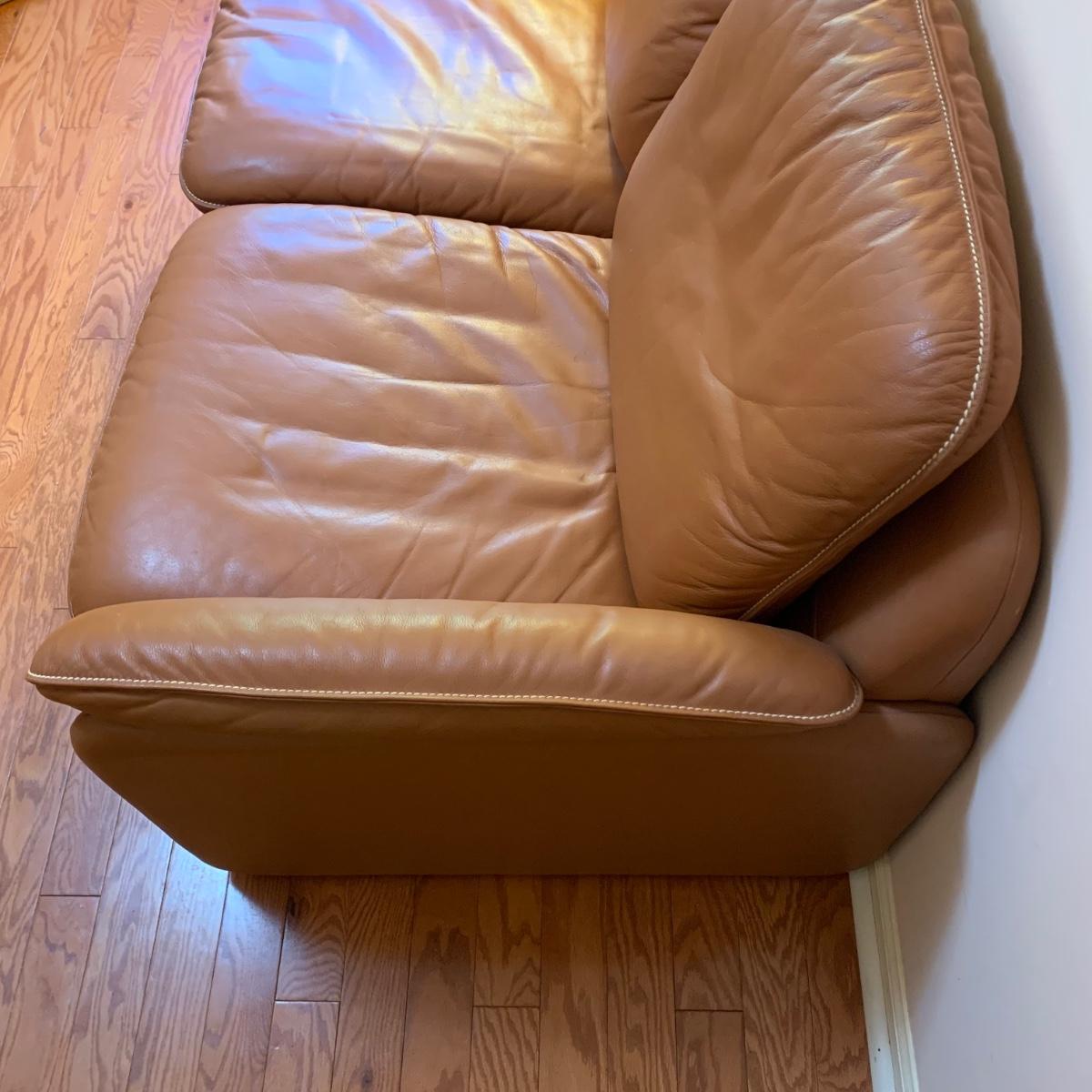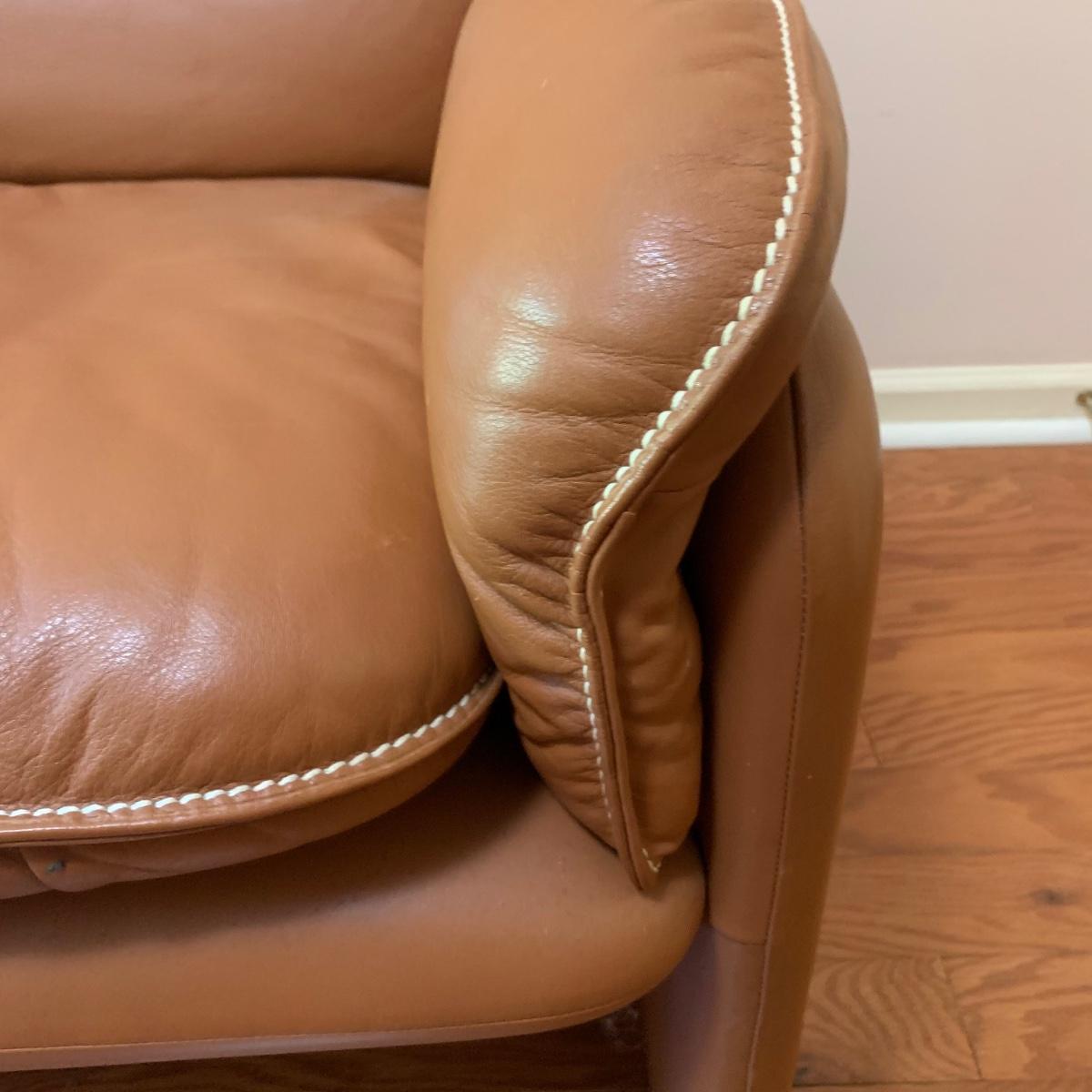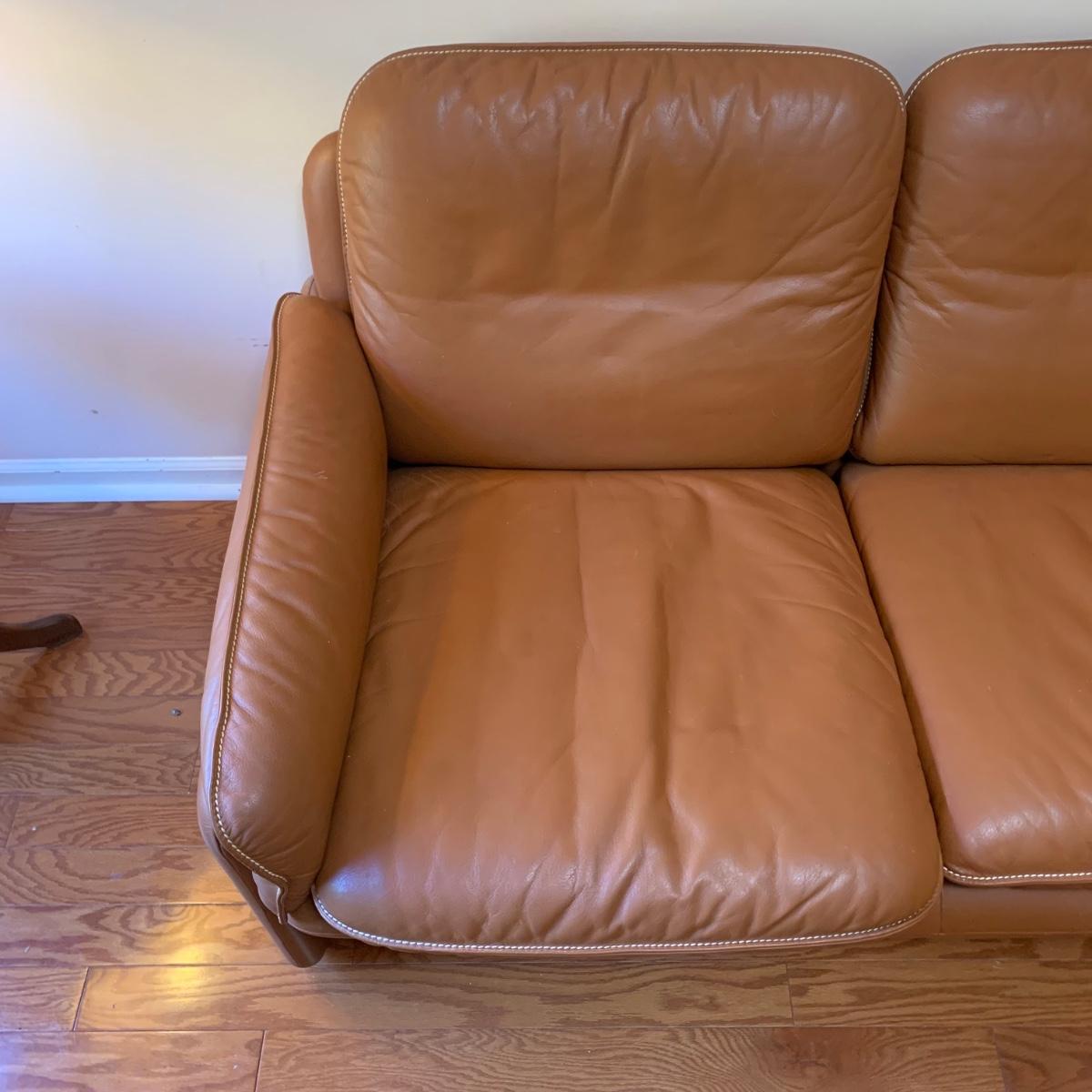 Nice mid-century modern style De Sede of Switzerland leather loveseat, featuring cognac-colored leather with white stitching. All four cushions are removable for easy cleaning! This loveseat has a few scratches, but is in overall good condition. See photos for details. Loveseat measures, 55”L x 32.5”W x 32”H with a seat height of 18”H.
