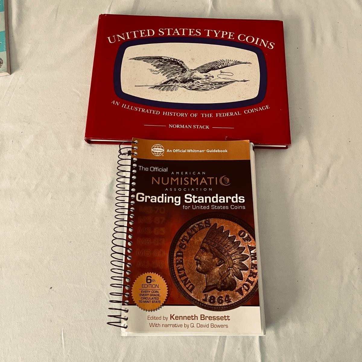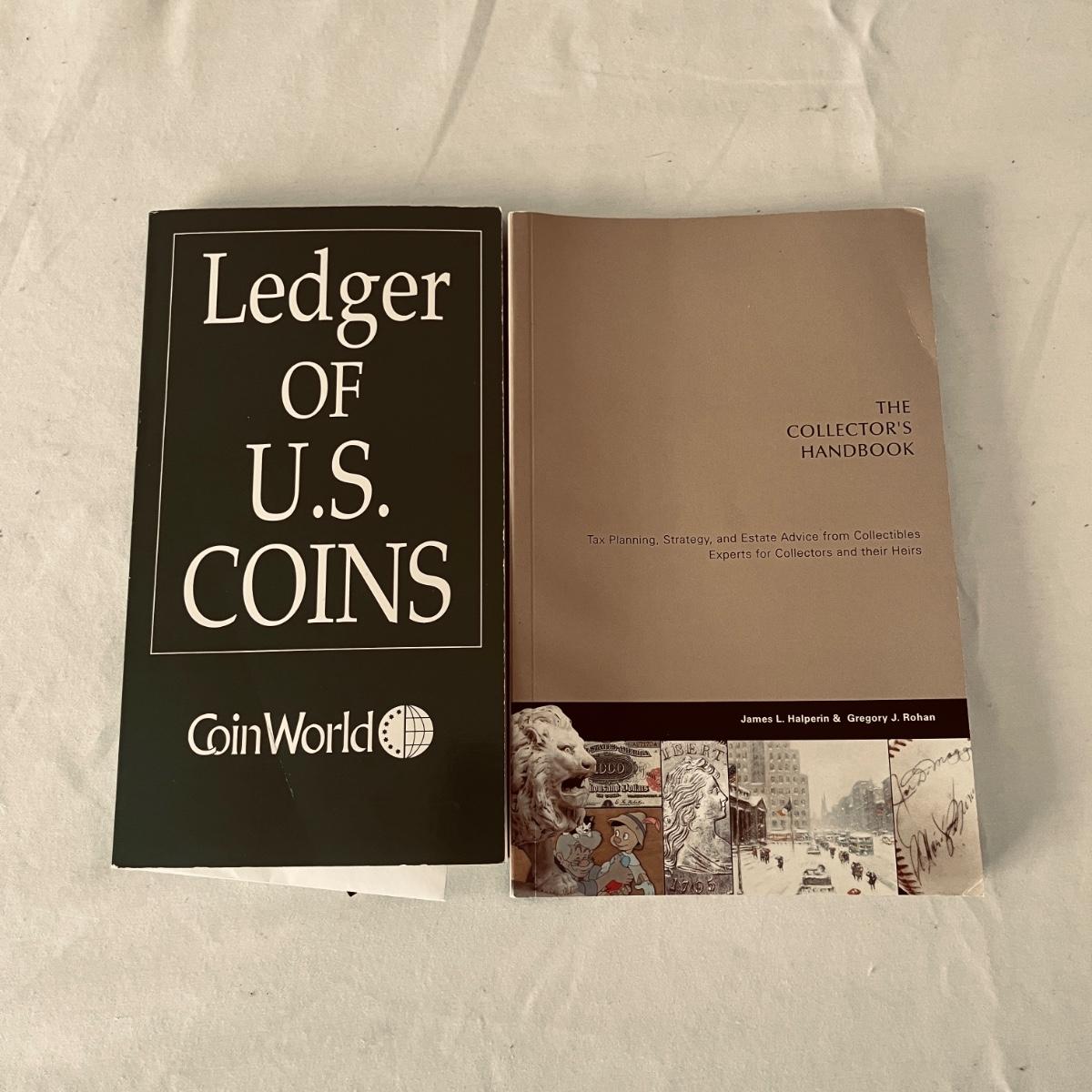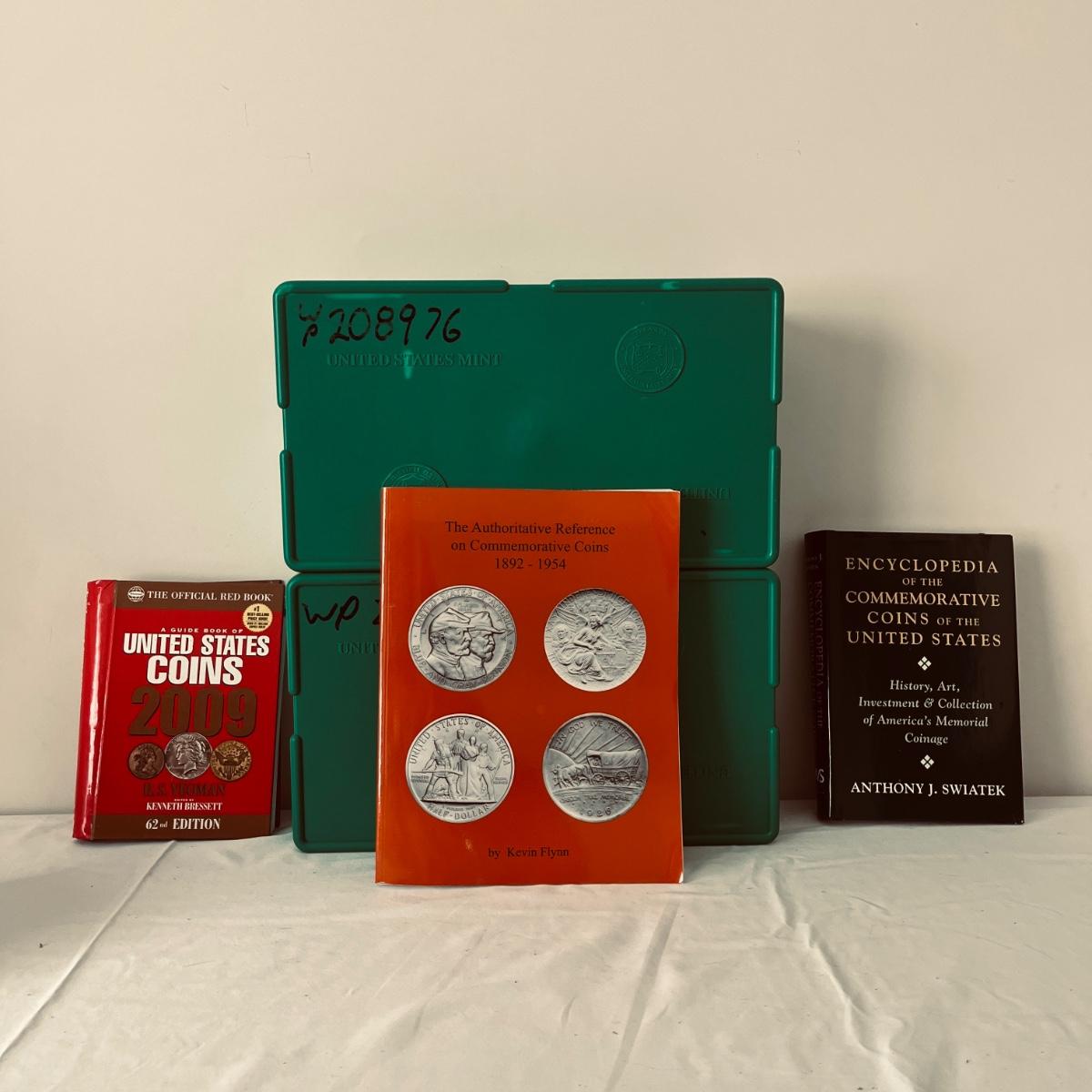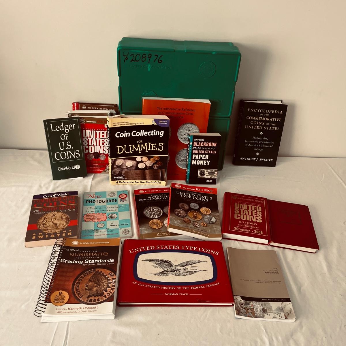 Lot includes two empty green monster American Eagle plastic boxes and over 15 books on coin collecting. Boxes measure 14.5” x 8.5” x 4.5”H.