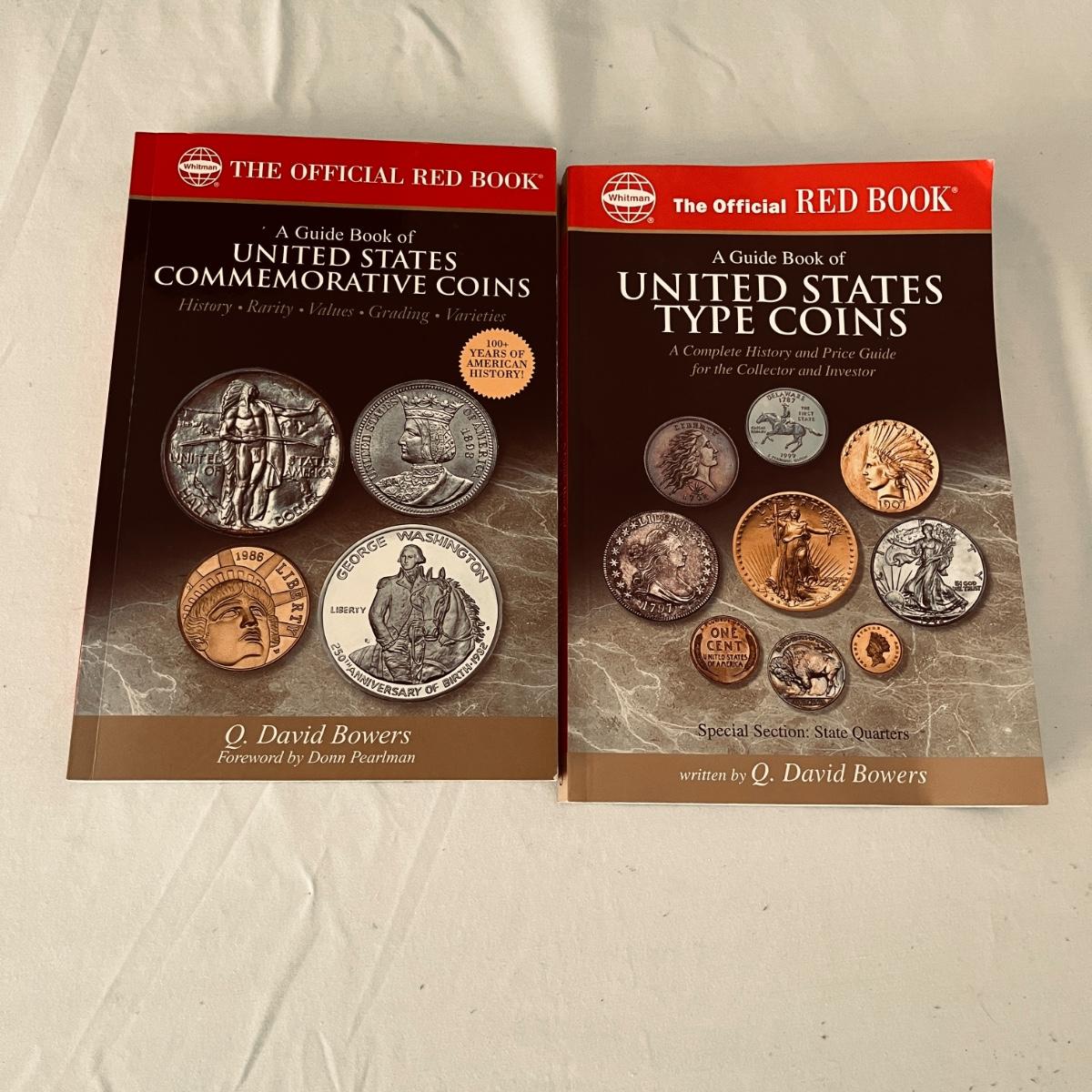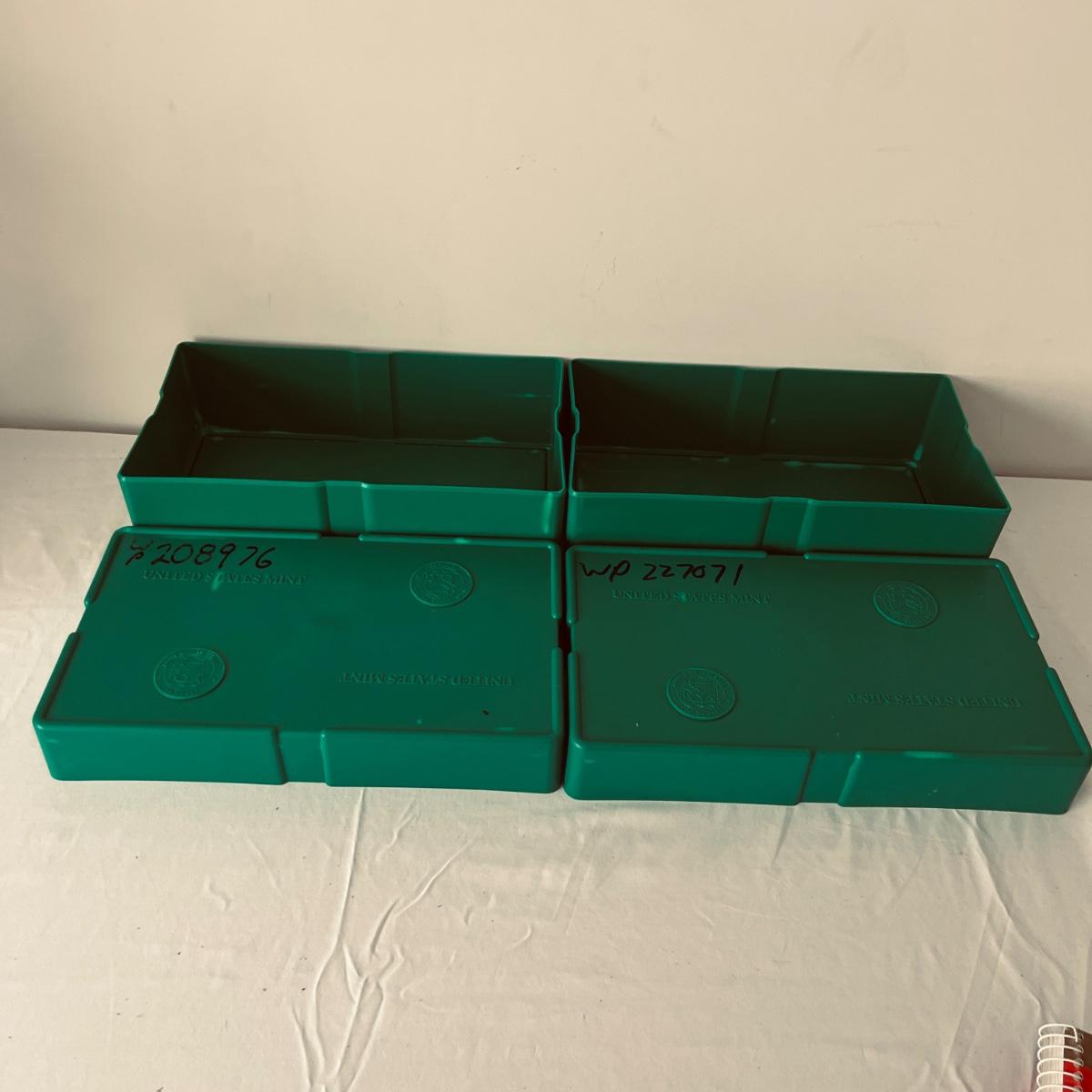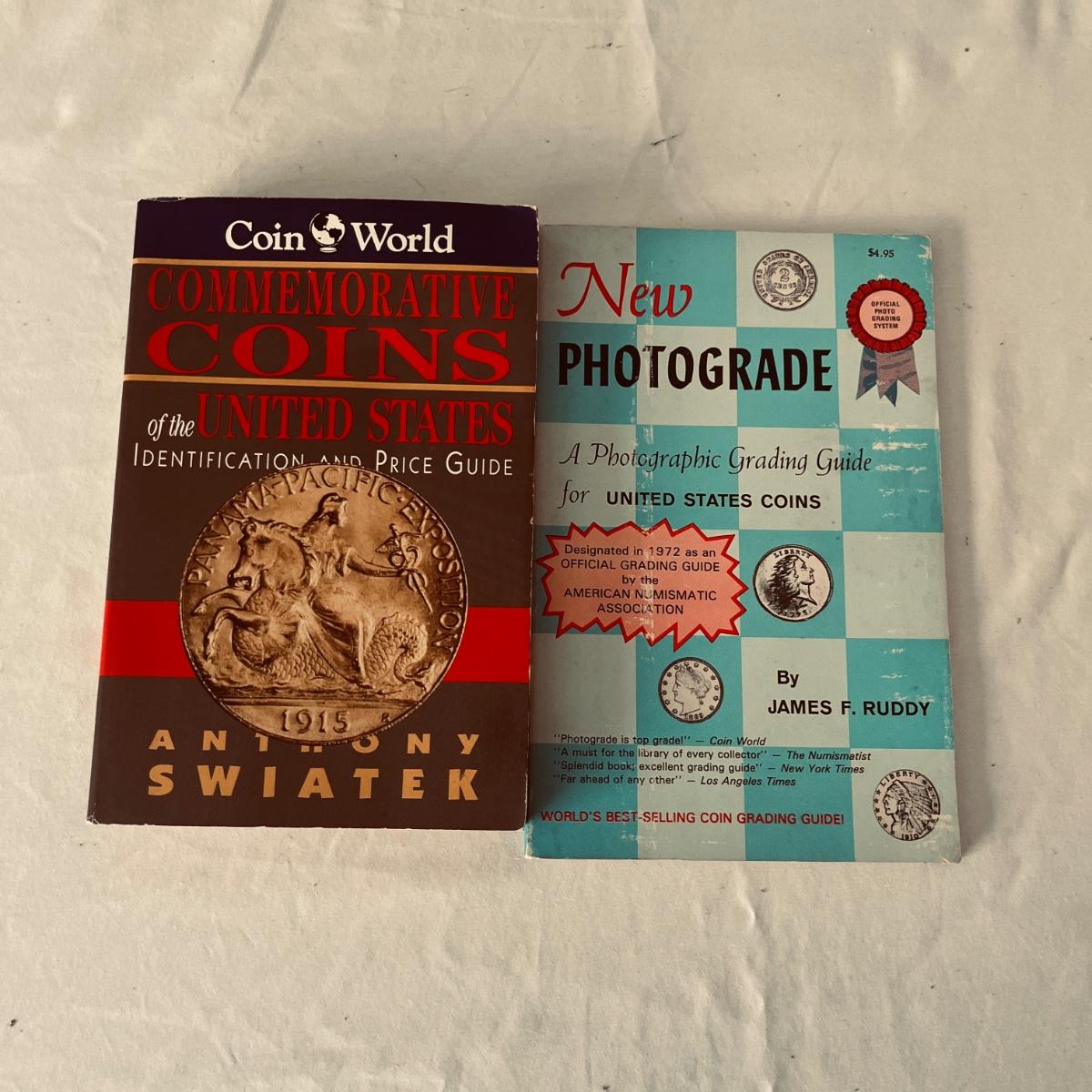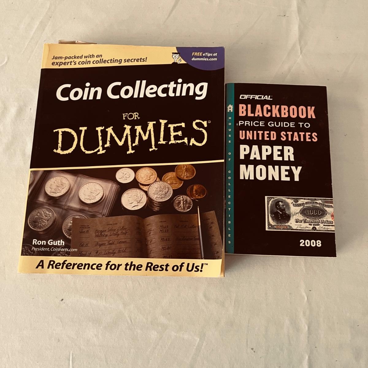 Lot includes two empty green monster American Eagle plastic boxes and over 15 books on coin collecting. Boxes measure 14.5” x 8.5” x 4.5”H.