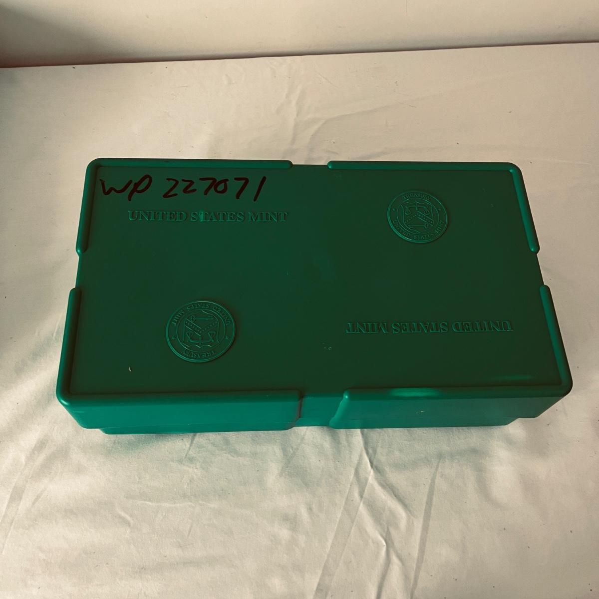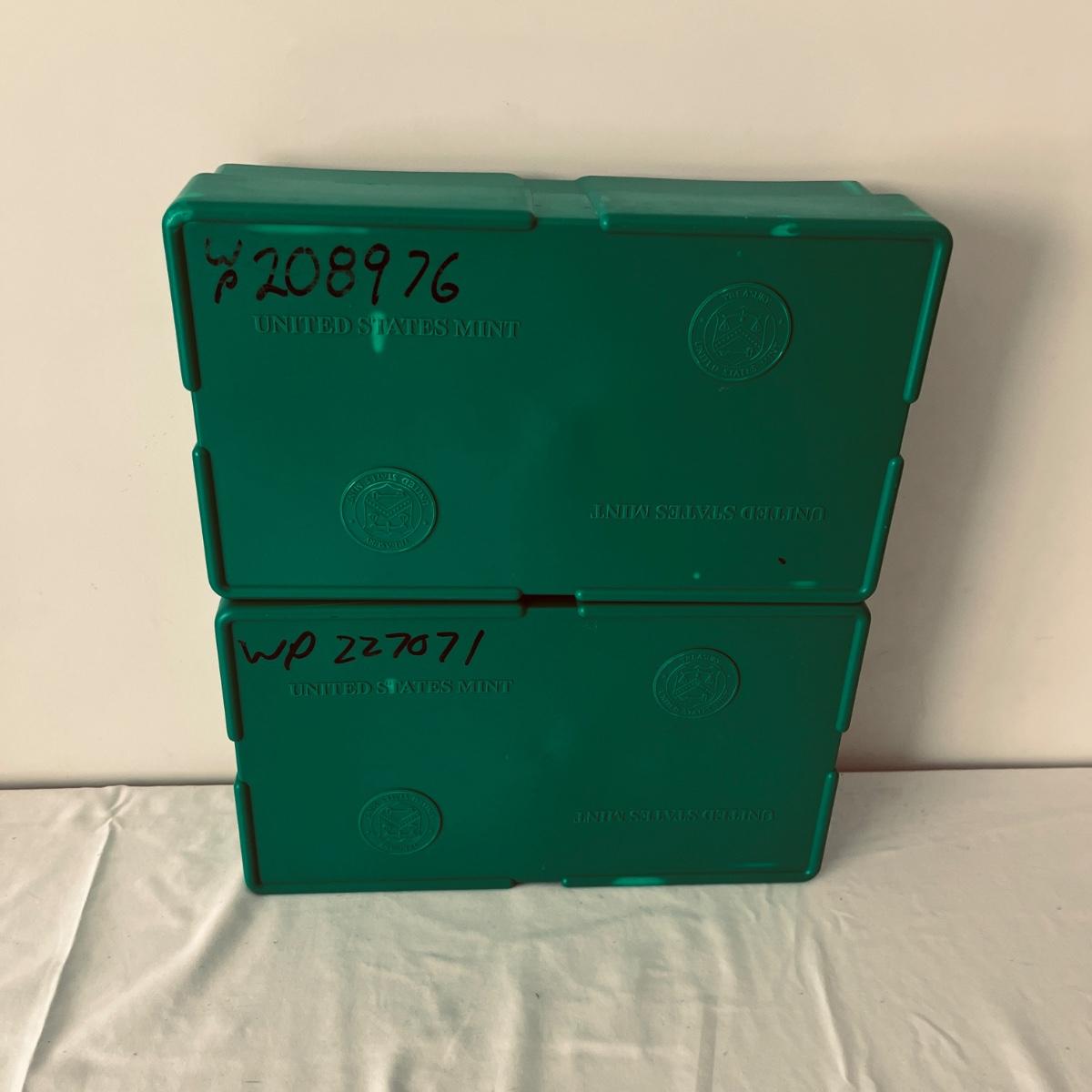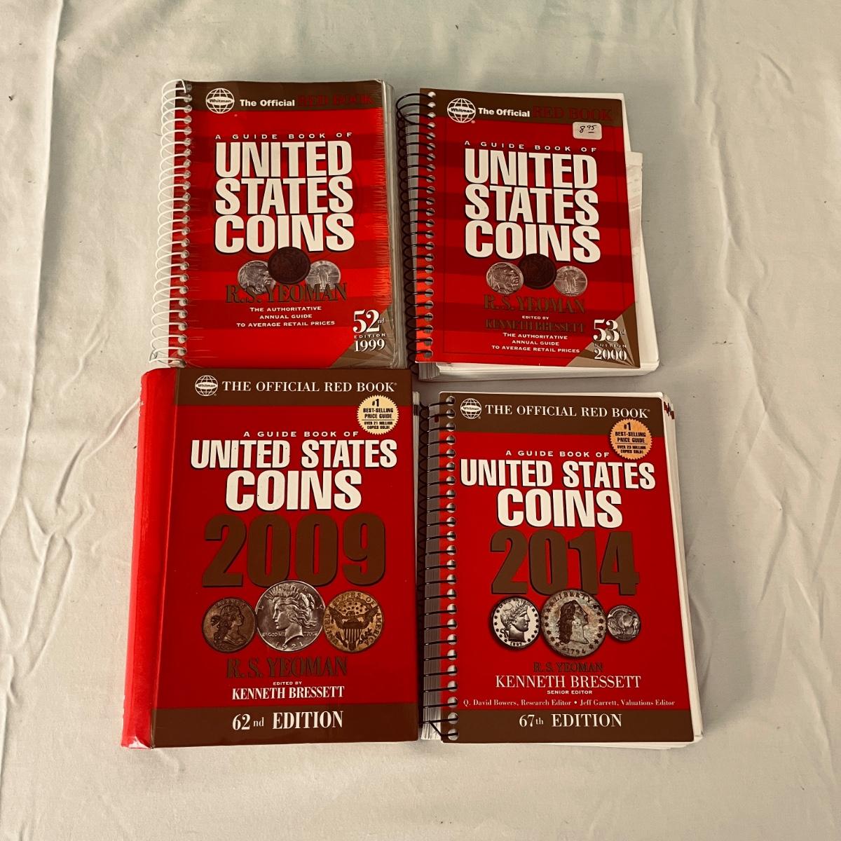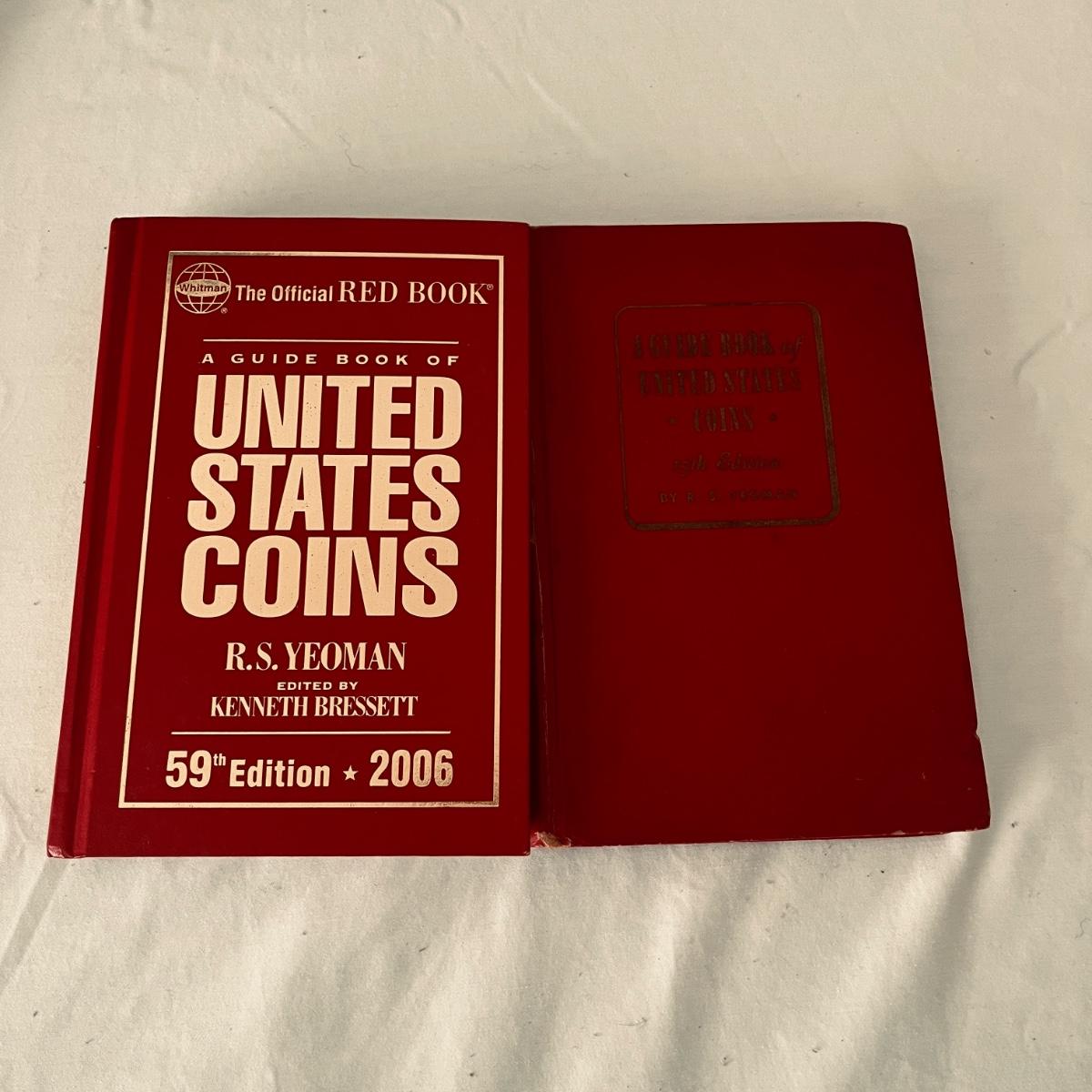 Lot includes two empty green monster American Eagle plastic boxes and over 15 books on coin collecting. Boxes measure 14.5” x 8.5” x 4.5”H.