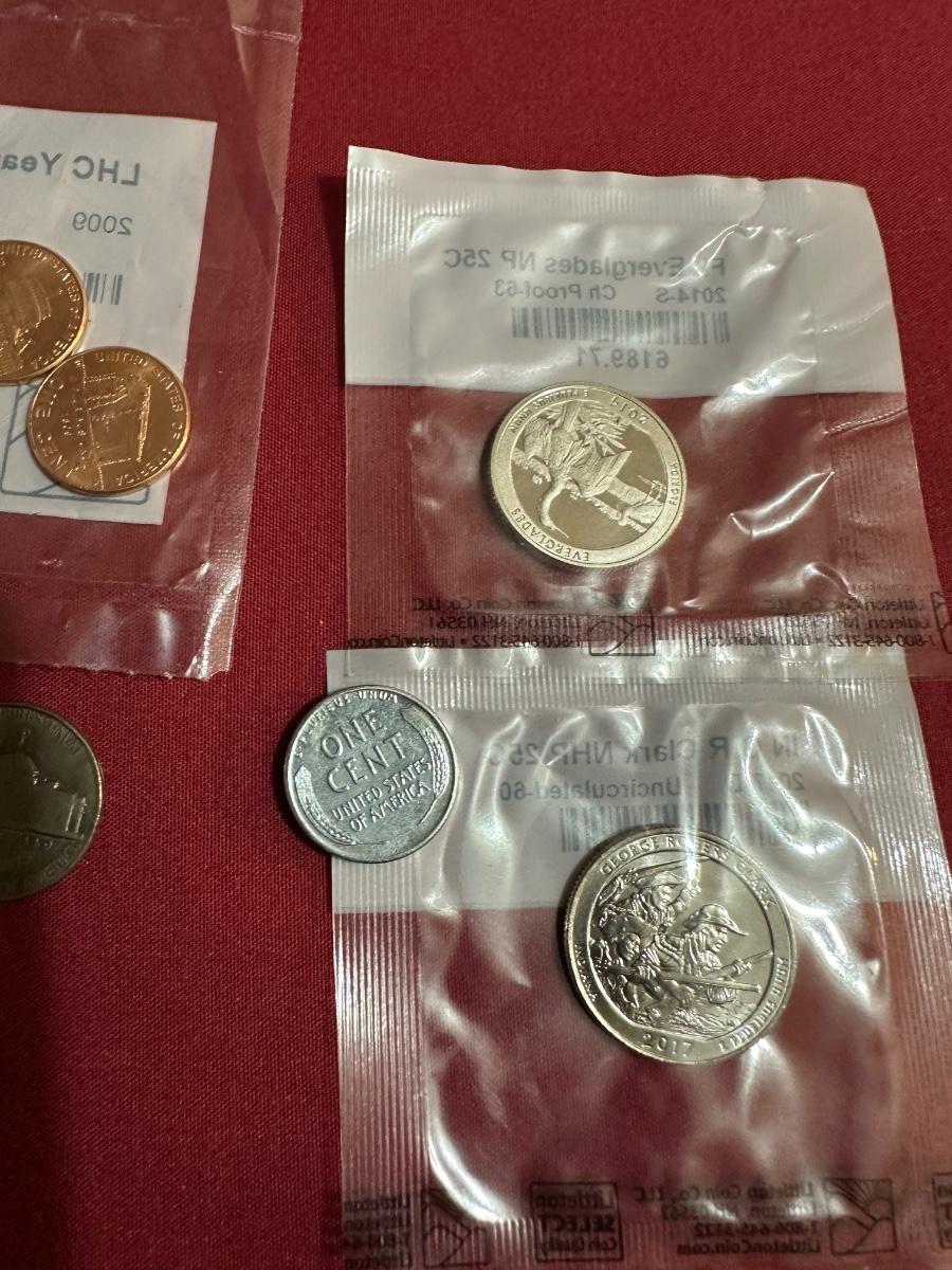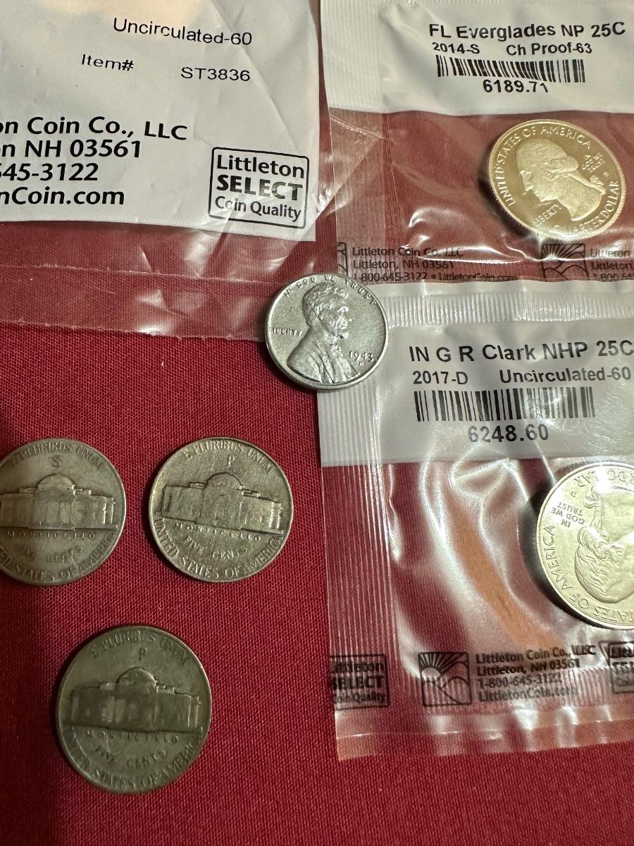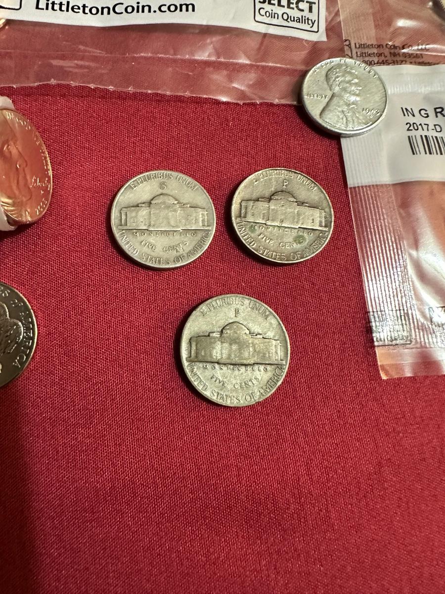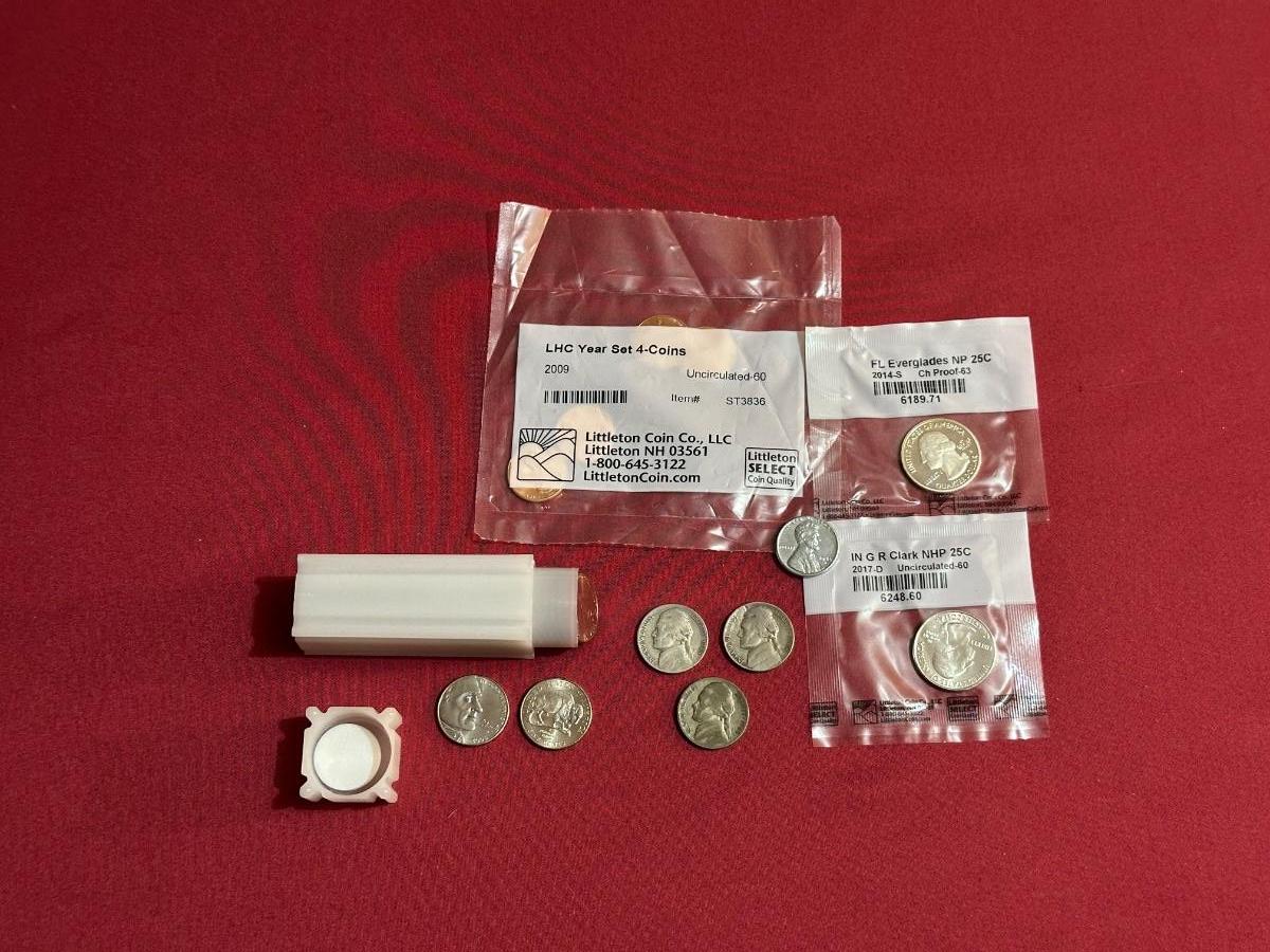 COIN CONTAINER OF BUFFALO NICKELS, 2009 PENNIES, 2014 S-MINT QUARTER, 2017 QUARTER, 1943 STEEL PENNY AND 3-1940’s NICKELS