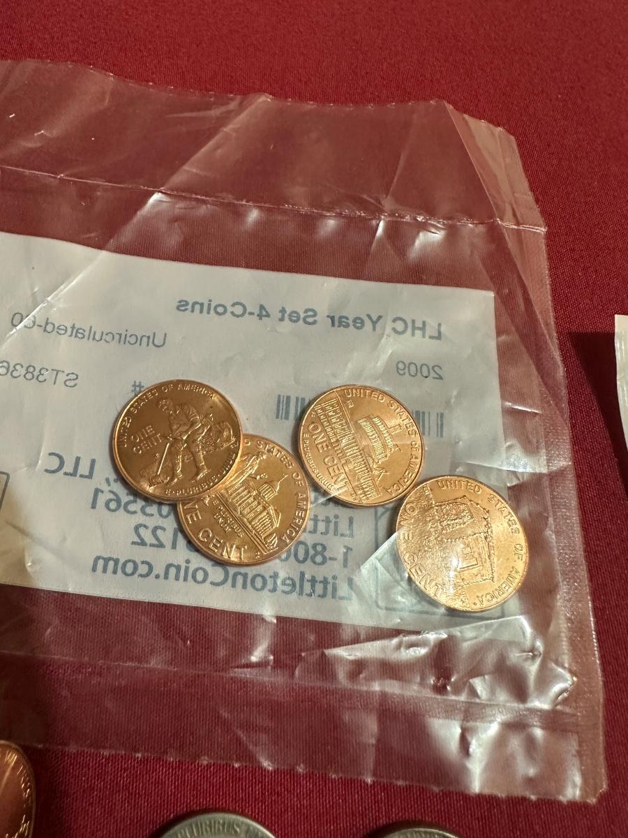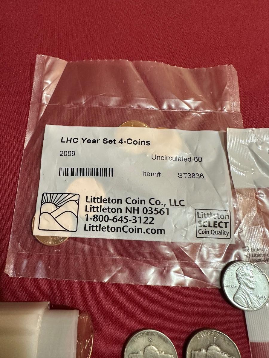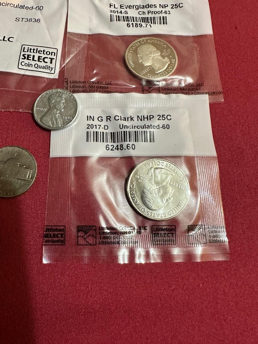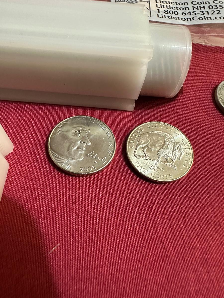 COIN CONTAINER OF BUFFALO NICKELS, 2009 PENNIES, 2014 S-MINT QUARTER, 2017 QUARTER, 1943 STEEL PENNY AND 3-1940’s NICKELS