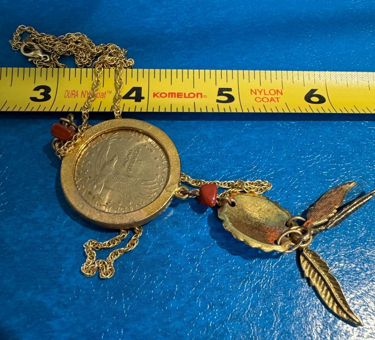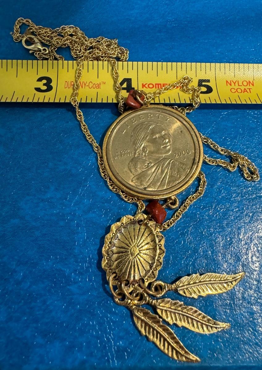 Coin necklace featuring a 2000 U.S. Sacagawea "Golden" Dollar coin as the central pendant.