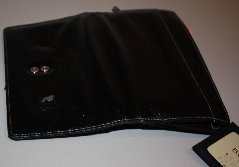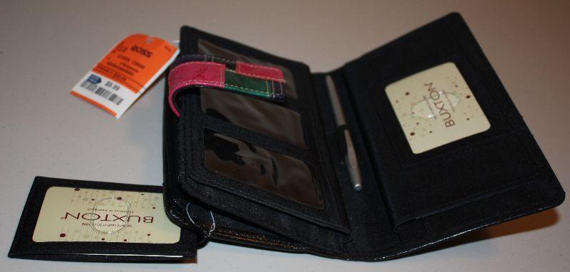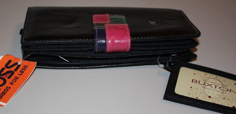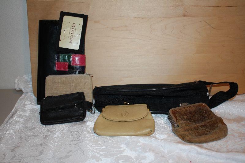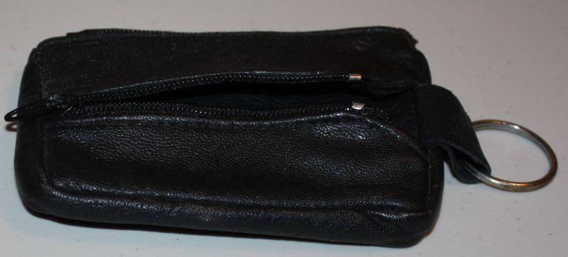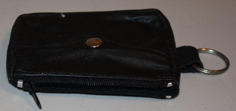 Black Coin purse with key fob and 2 zippers; black wallet with multi-color flap; Buxton, coin purse beige leather; tan canvas coin purse; toiletry bag, black; worn tan double coin purse