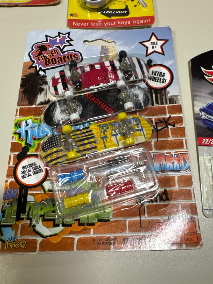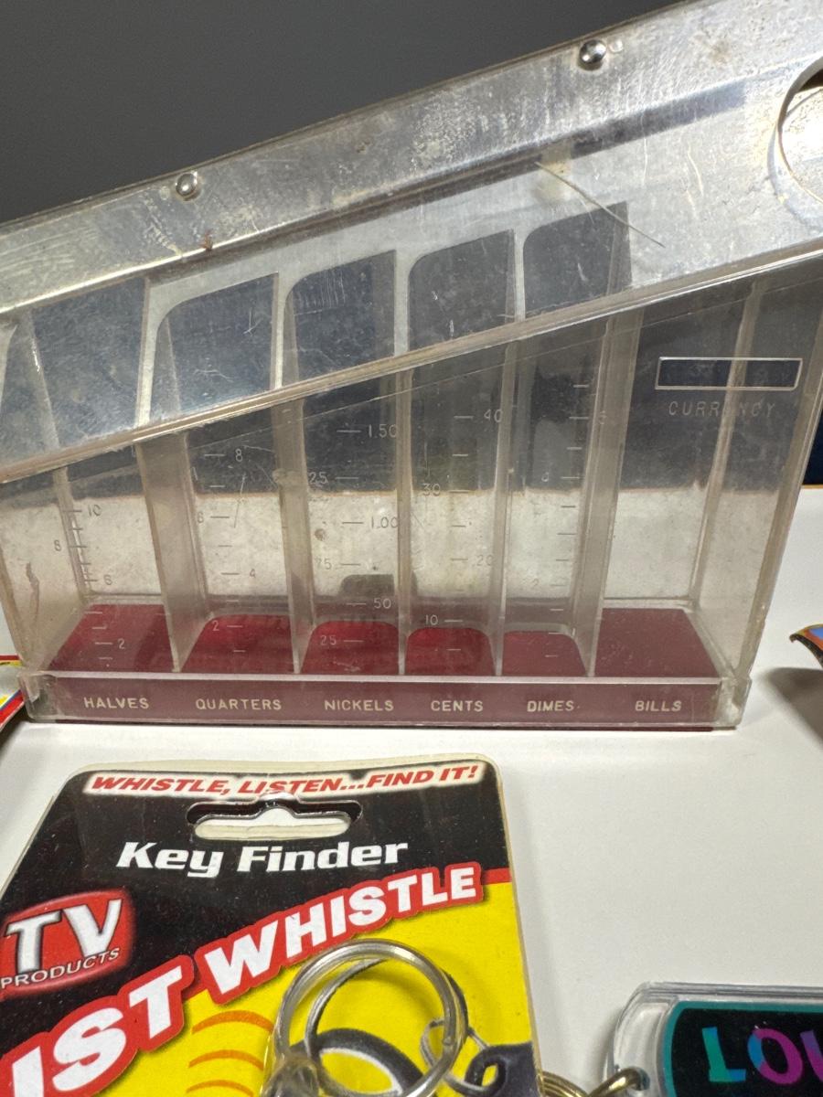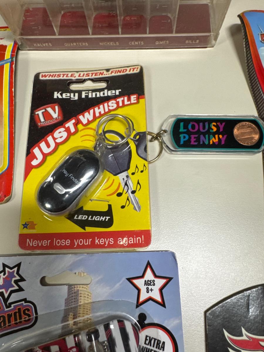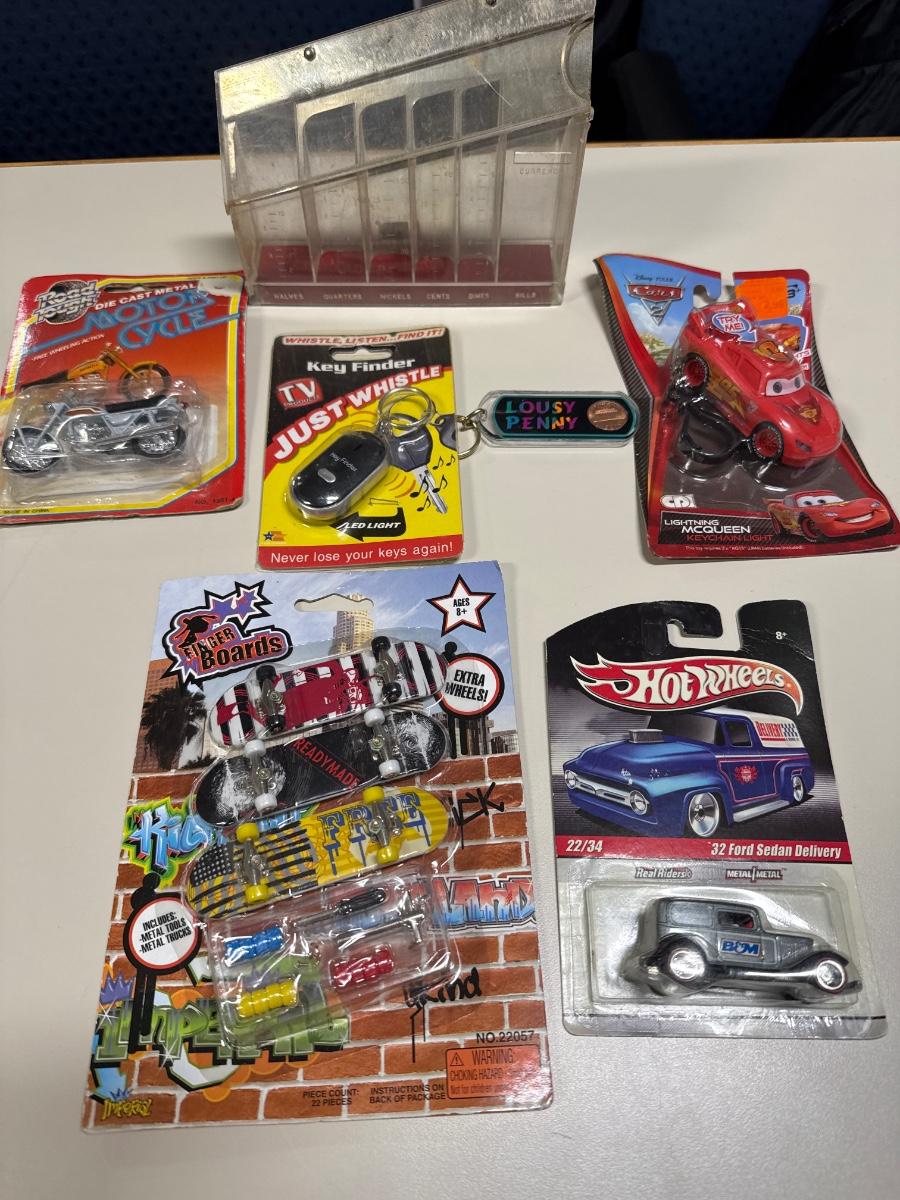 Coin separator, Hot Wheels, key chains, toy motorcycle and toy skateboards
