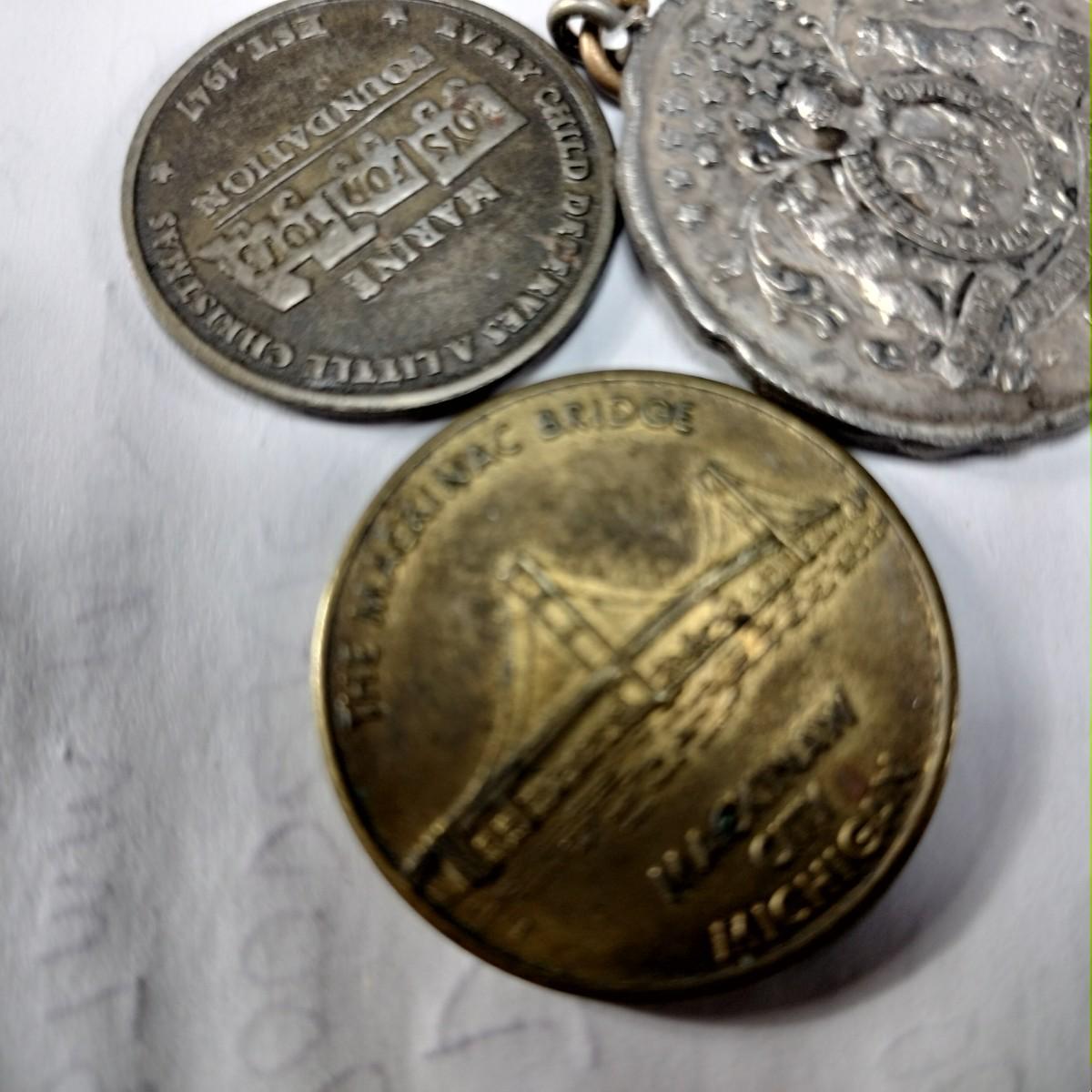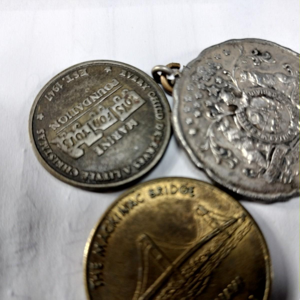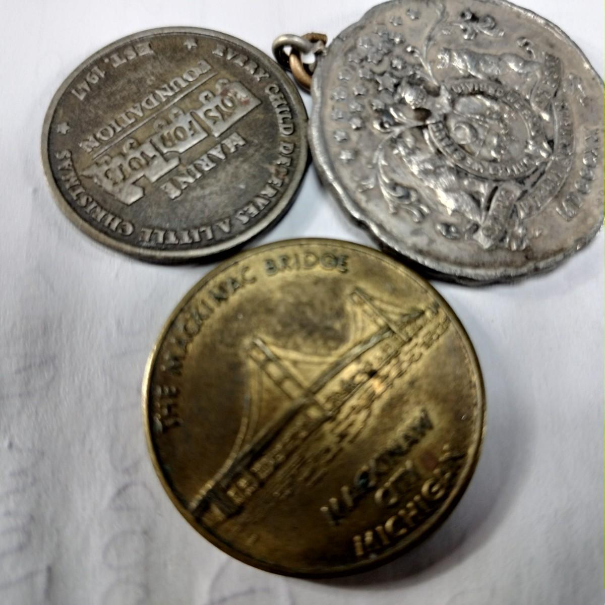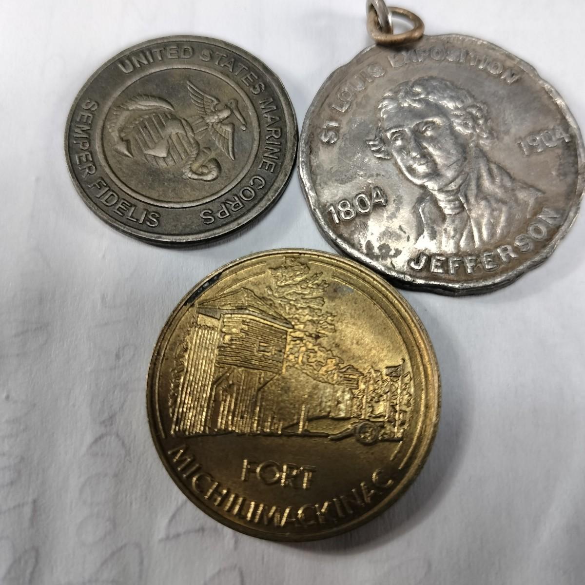 This auction lot is for a Token Trio. This is a collection of 3 unique tokens - one is a souvenor of the Michigan Mackinac Bridge, another is from the Marine Corps "Toys for Tots" 1947 campaign and the third is a Jefferson key fob that was sold as a momento of the 1904 St. Louis Exposition.