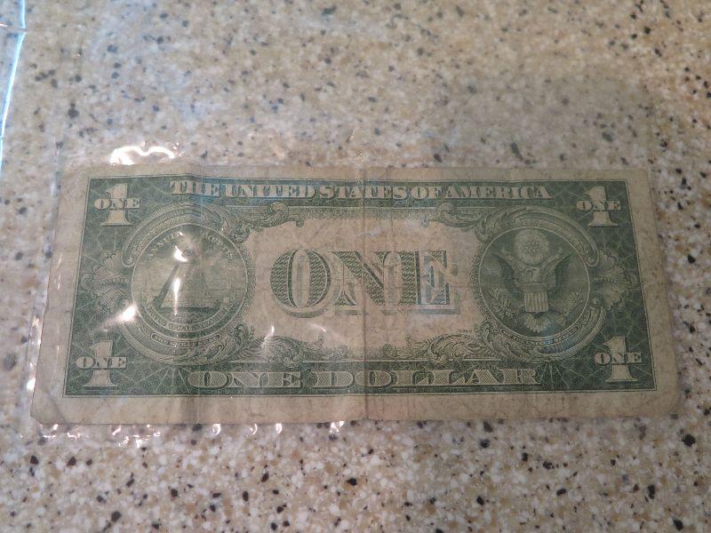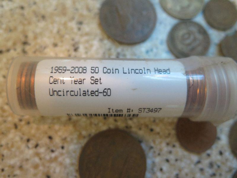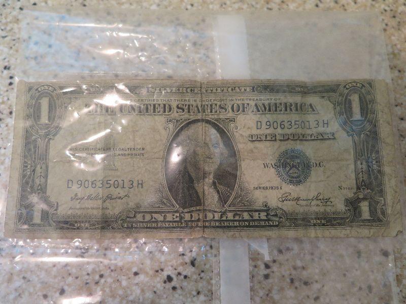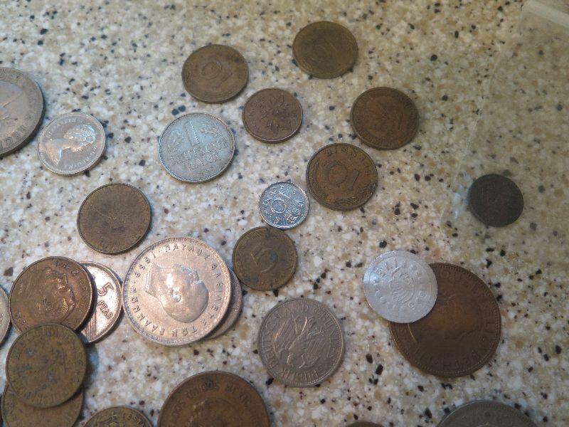 A one dollar silver certificate, uncirculated pennies, foreign coins, and more