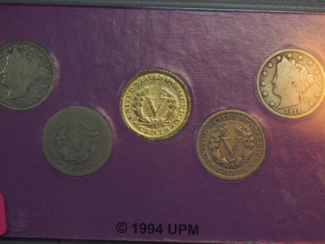 5 Coins in a display these are Liberty or V Nickels all with readable dates