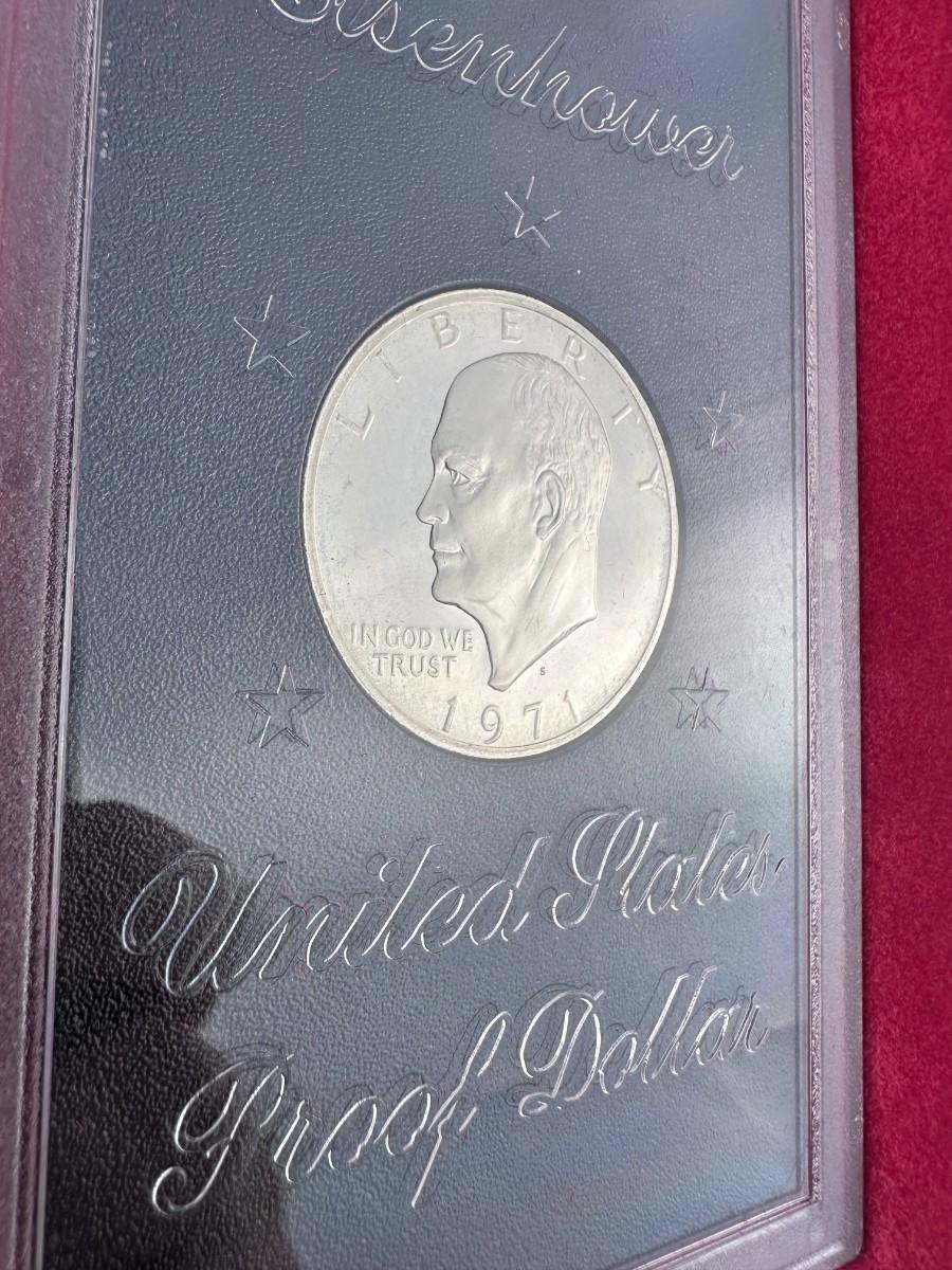 Coins: Proof Eisenhower silver dollars, each in a display case