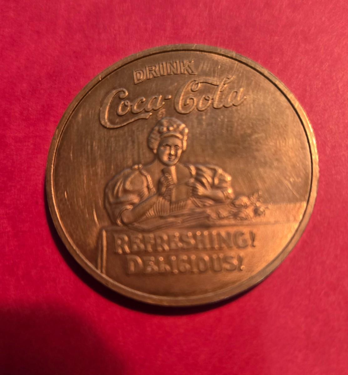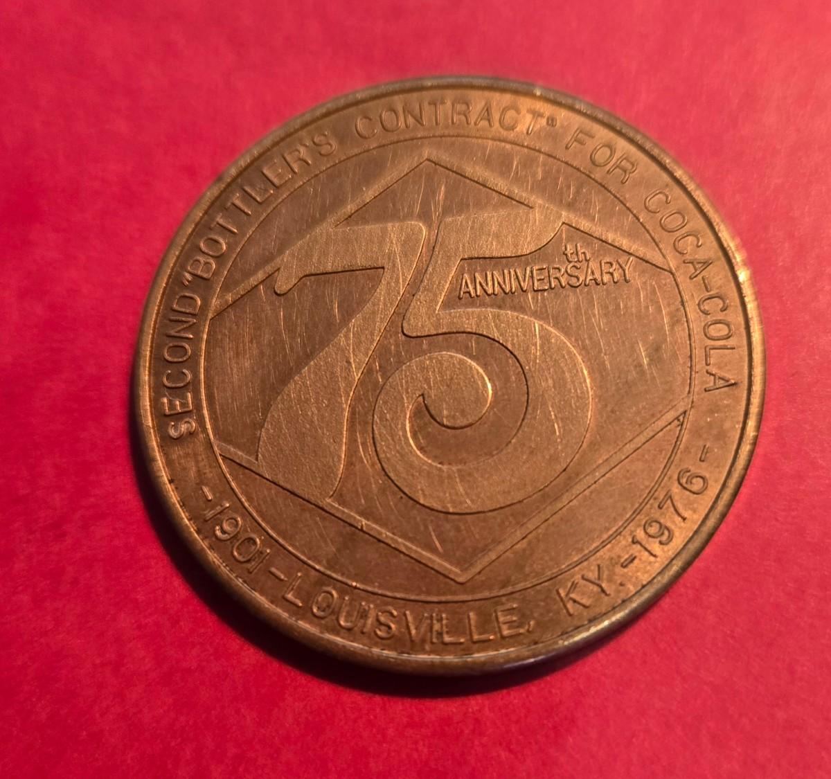 This auction lot is for a Brass Coca-Cola 75th Anniversary in Louisville Commemorative Coin. It is in used condition but still a very nice addition to your Coca-Cola or local business token collection.