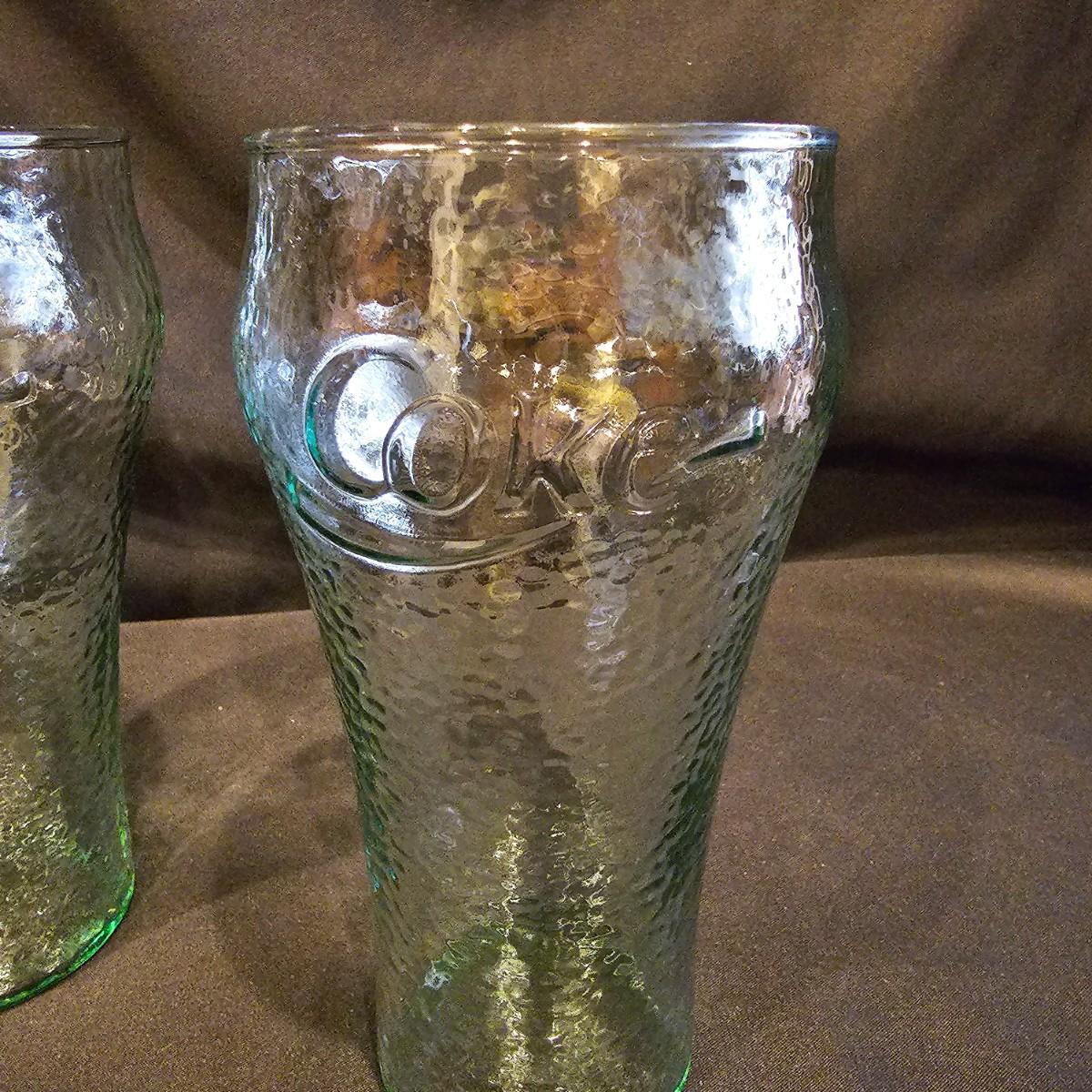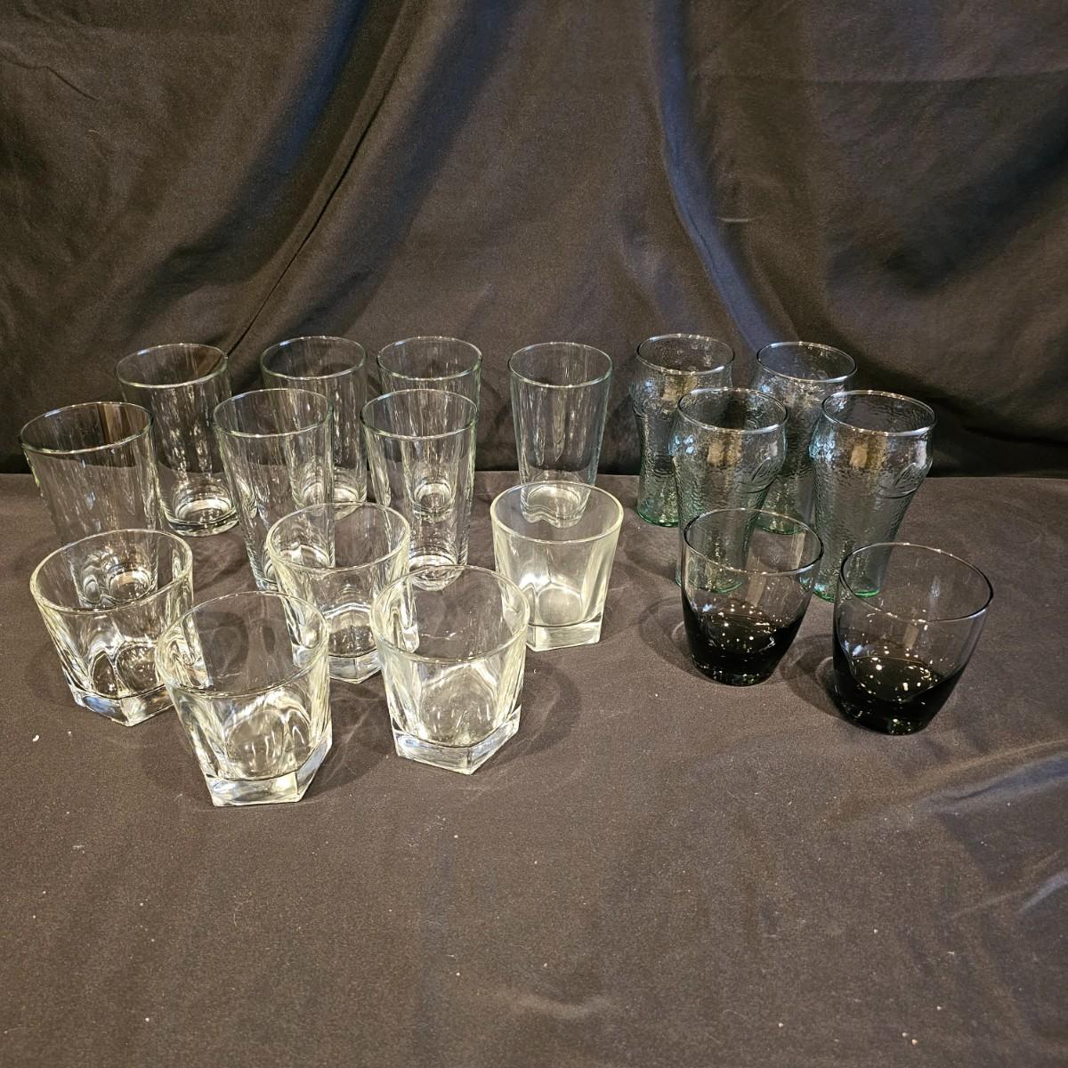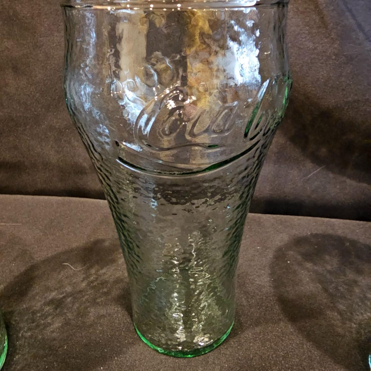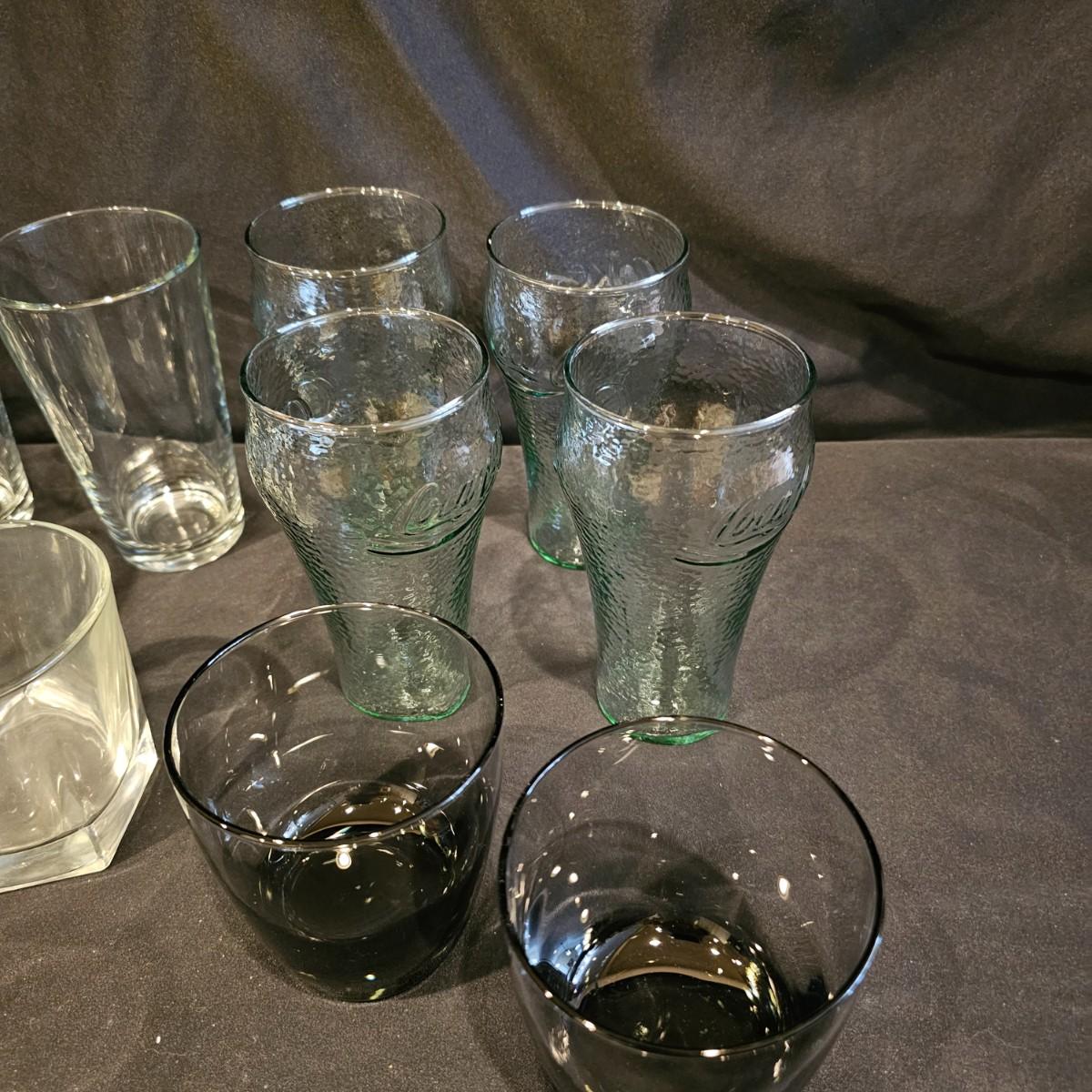 Four green tint Coca-Cola glasses with pebble finish, 6" h. Seven clear glasses, 6"h. Five highball style glasses 4" h. And two smoke colored glasses, 4" h. See photos for details. Shipping available.