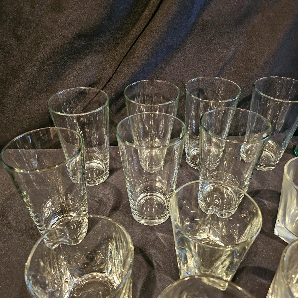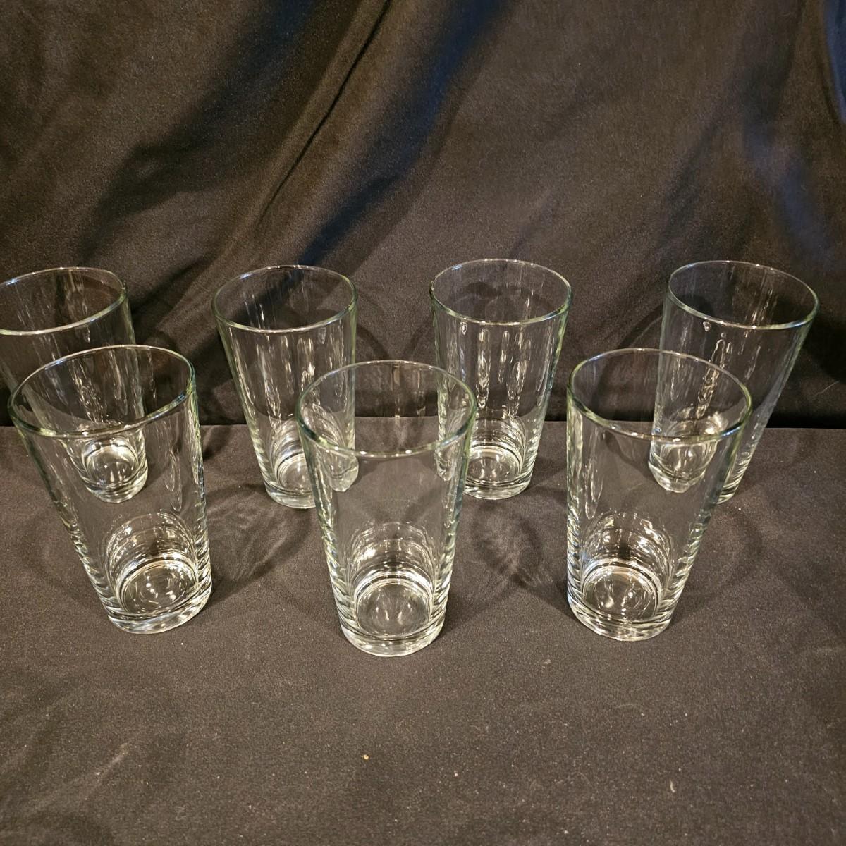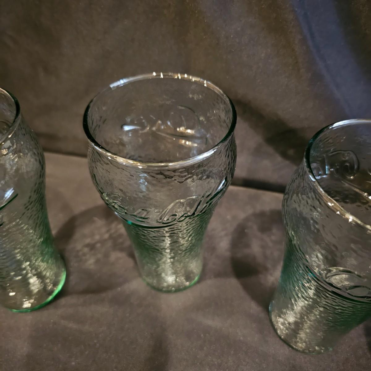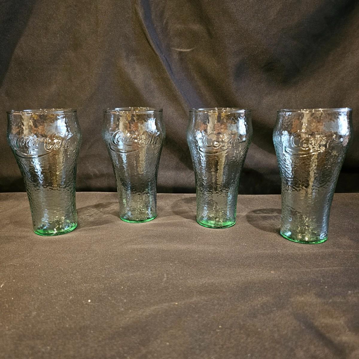 Four green tint Coca-Cola glasses with pebble finish, 6" h. Seven clear glasses, 6"h. Five highball style glasses 4" h. And two smoke colored glasses, 4" h. See photos for details. Shipping available.