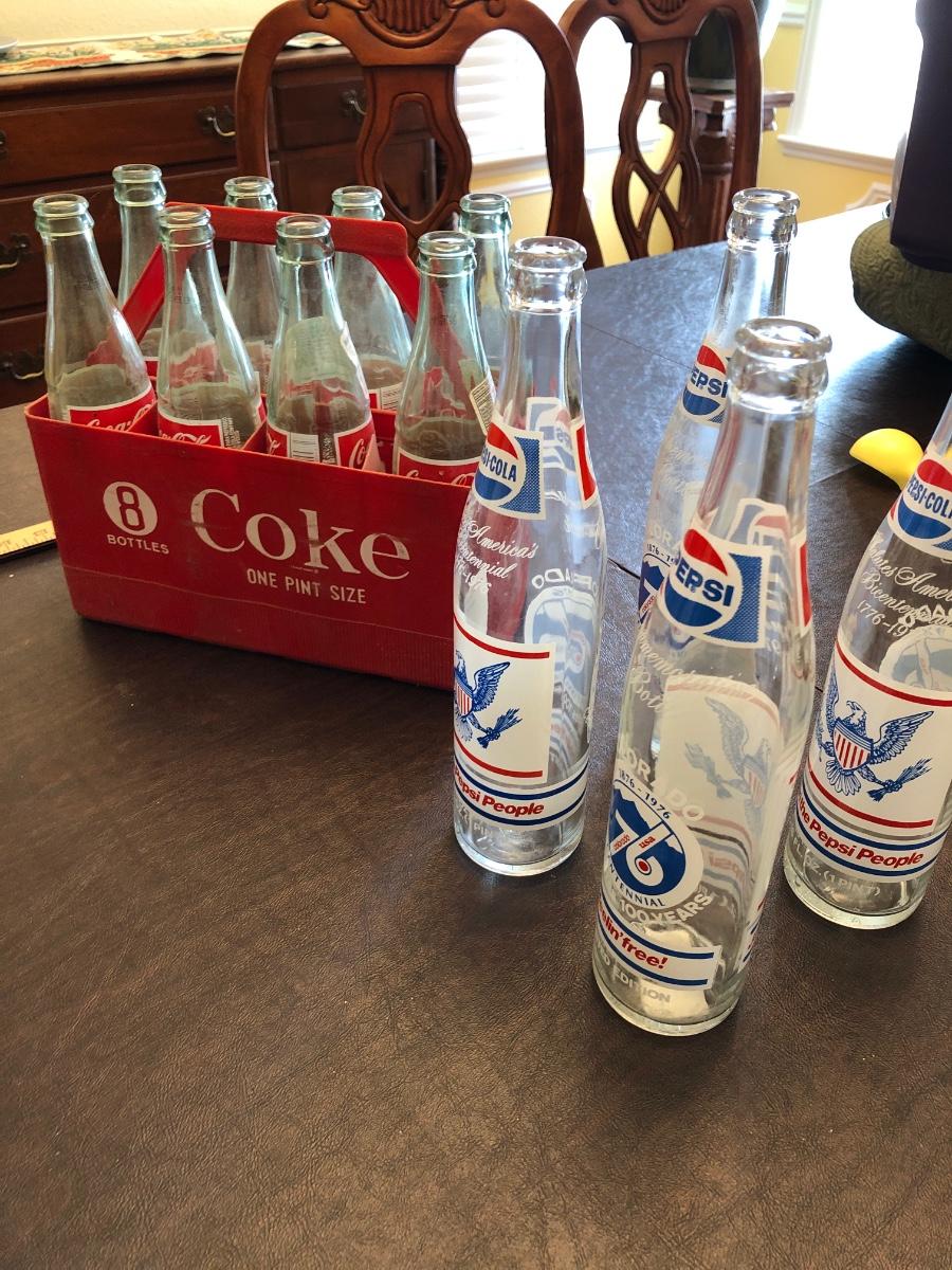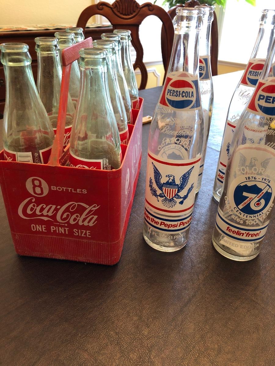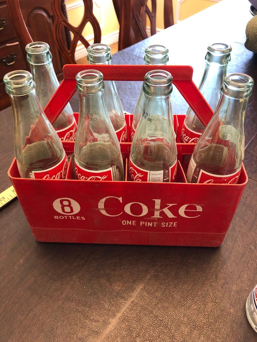 Collectible soda pop advertising bottles, and eight-pack plastic carrier.
