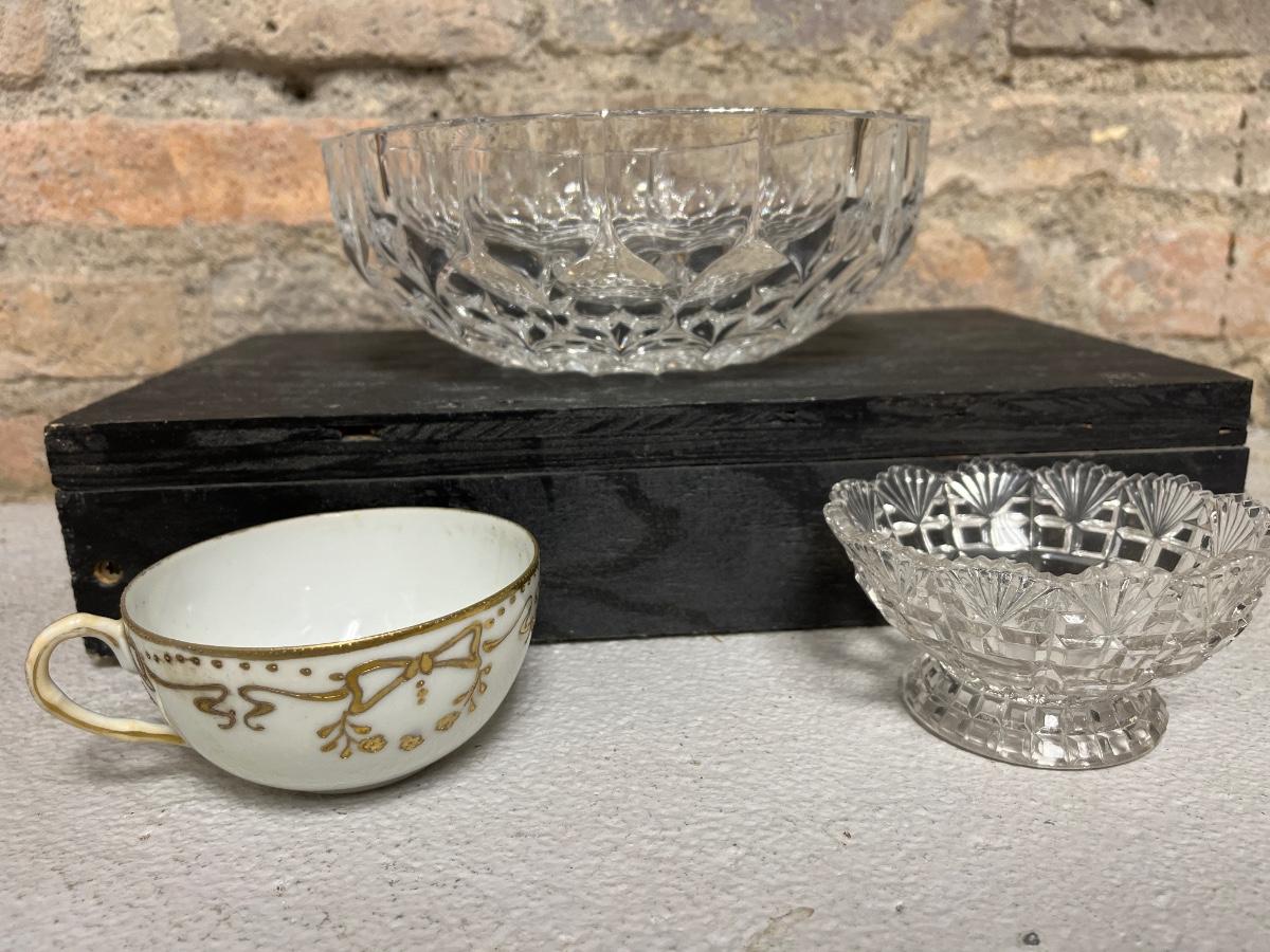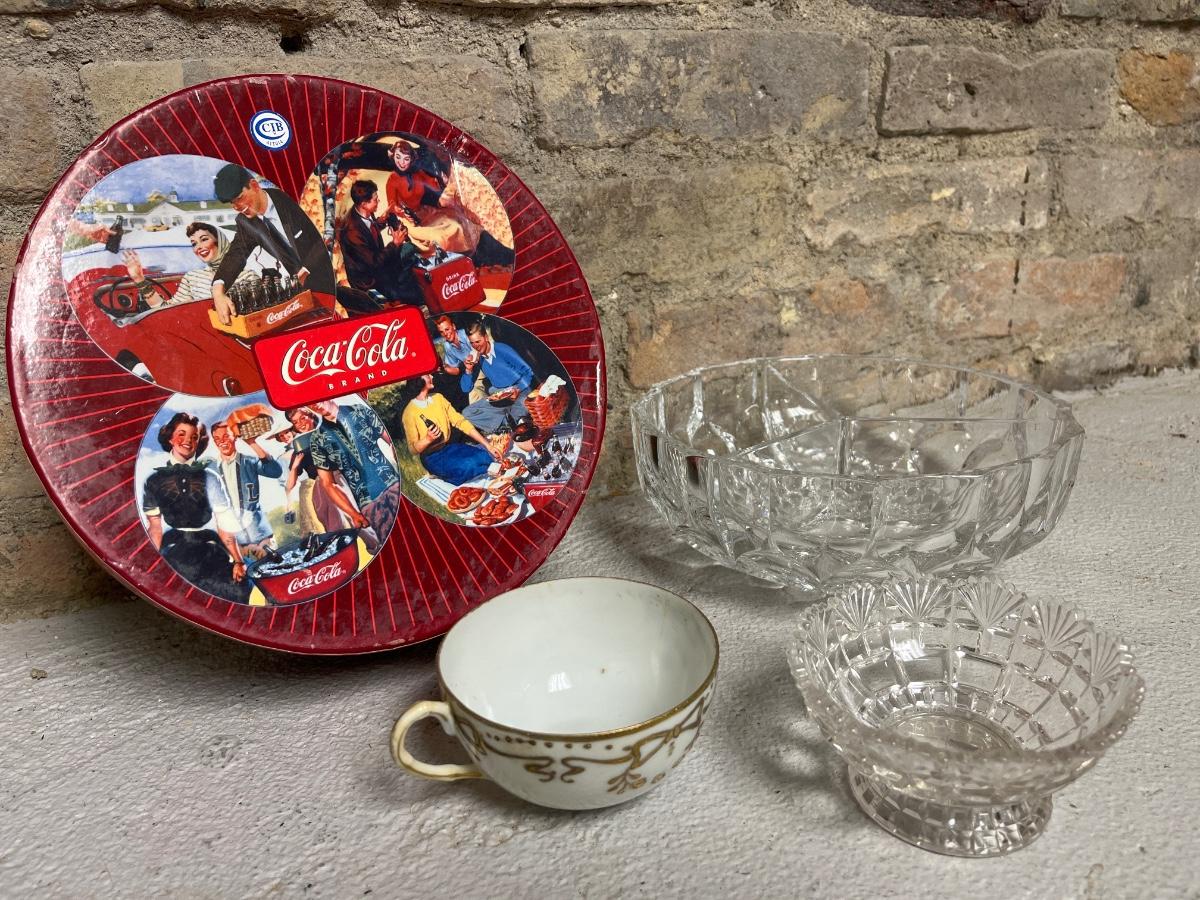 Nippon teacup & footed bowl, heavy divided salad bowl and a set of 4 tailgating Coca-Cola plates in package.